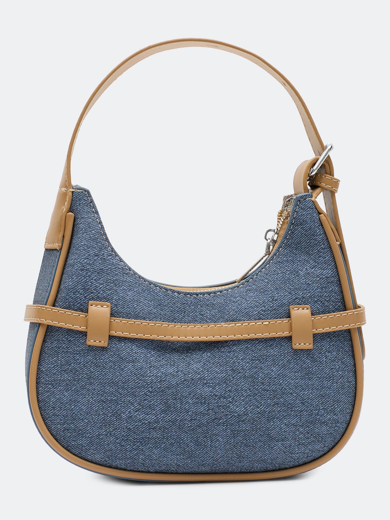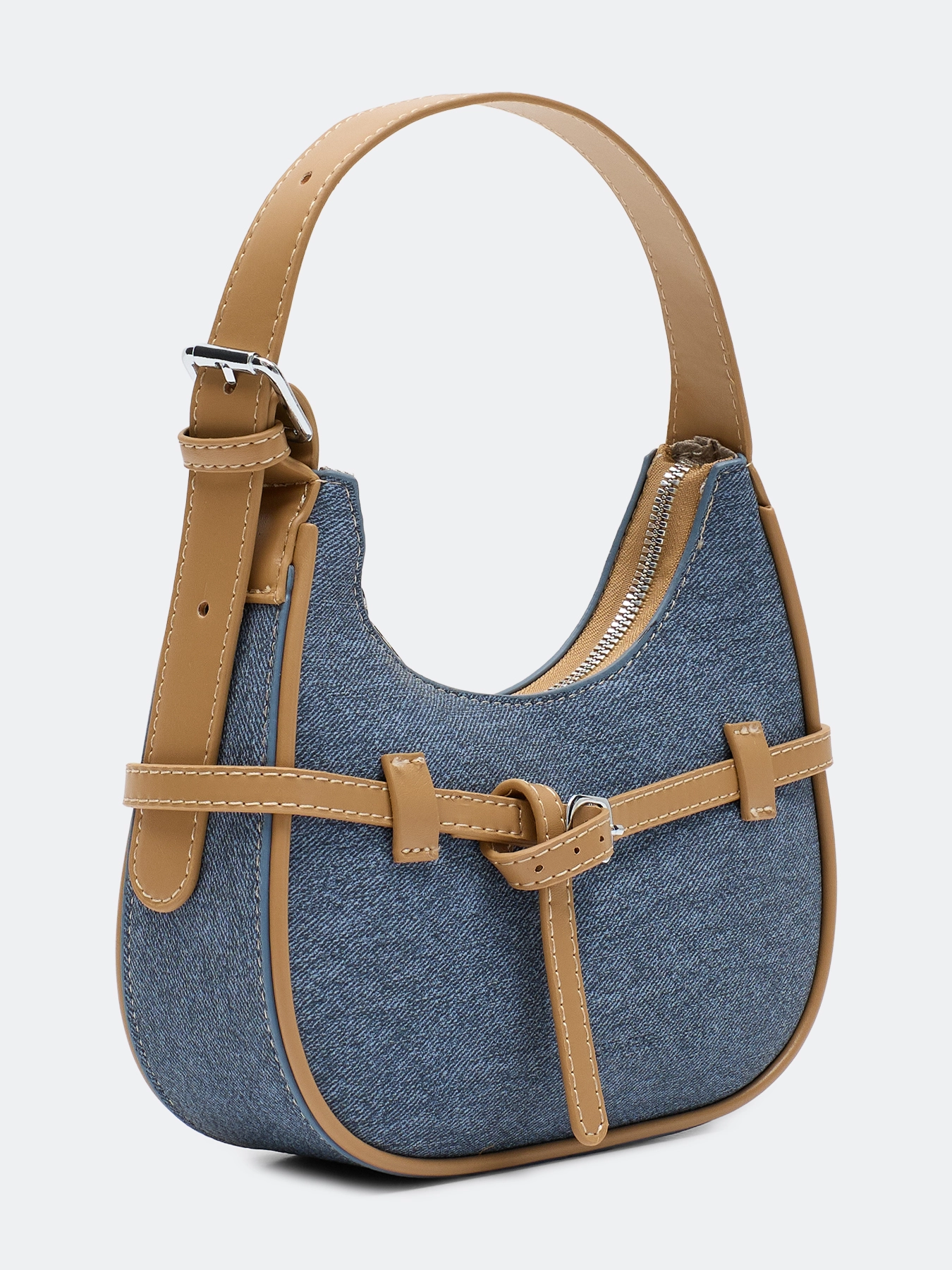 Сумка багет из эко кожи с имитацией джинсы. Мягкая форма, короткий регулируемый ремешок и длинный ремешок в комплекте. Застёжка на молнию. Дополнена акцентными декоративными ремешками. Подкладка из 100% полиэстера.
