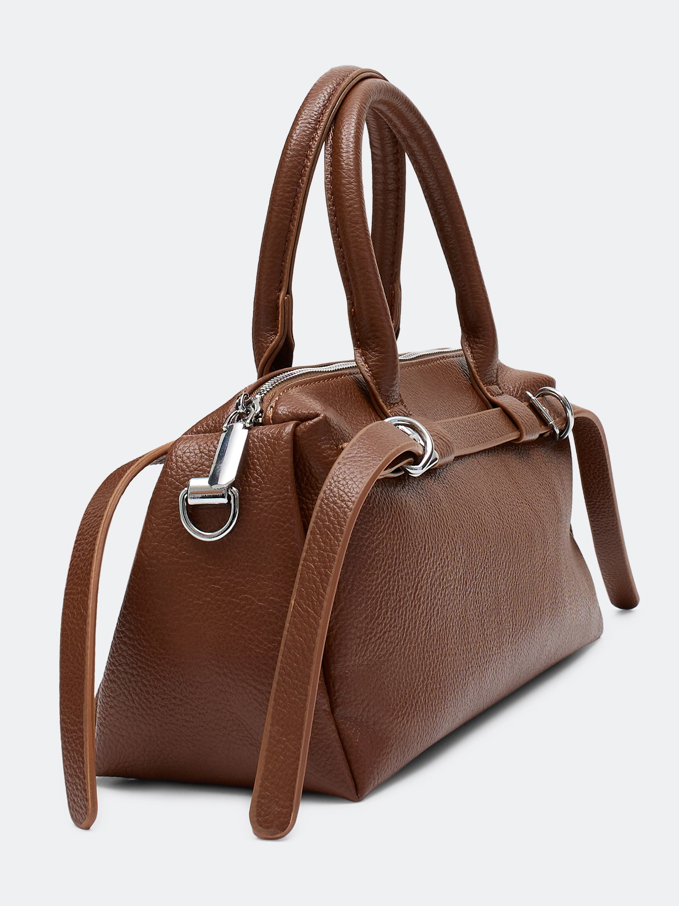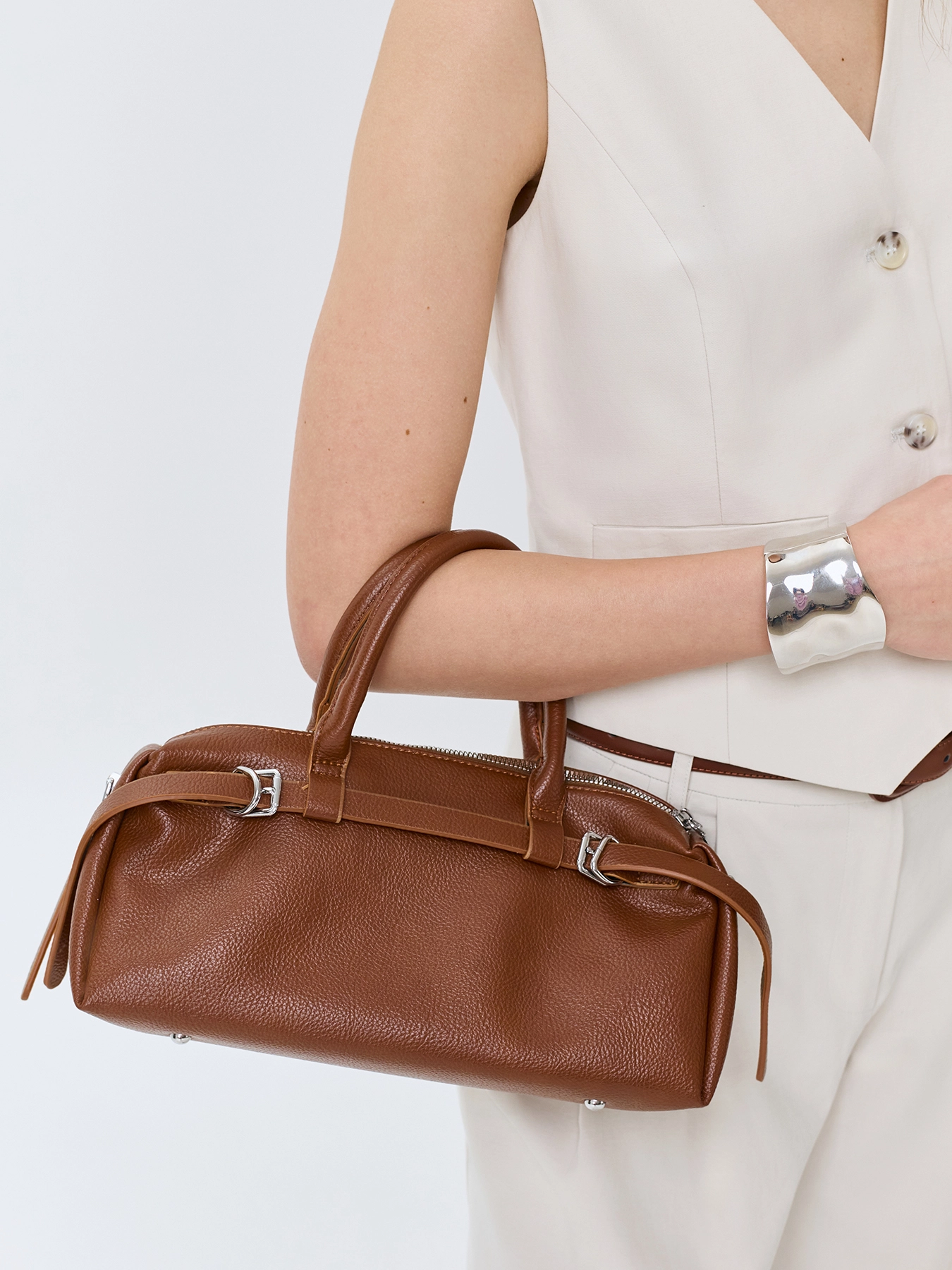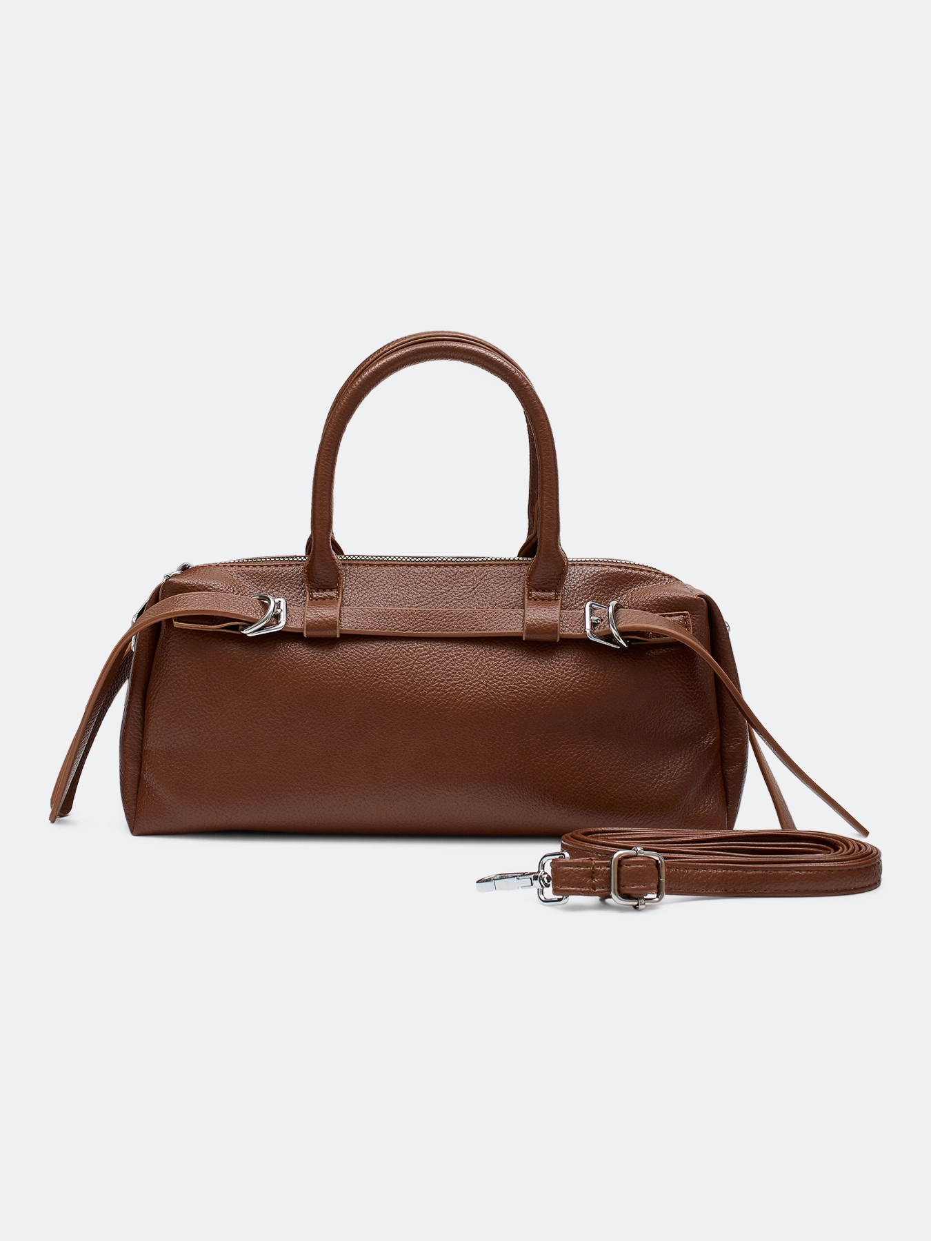 Сумка-багет из мягкой эко кожи коричневого цвета. Мягкая форма, две короткие ручки и длинный регулируемый ремешок в комплекте. Застёжка на молнию. Подкладка из 100% полиэстера.