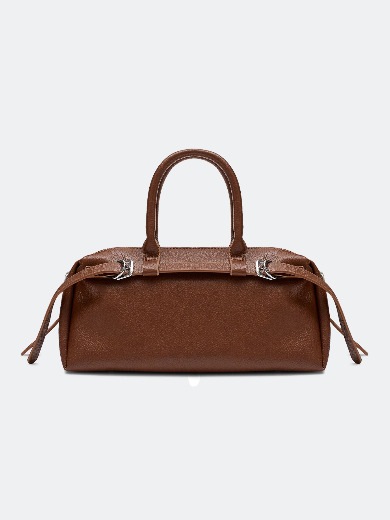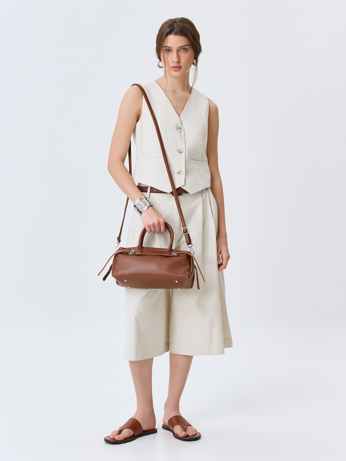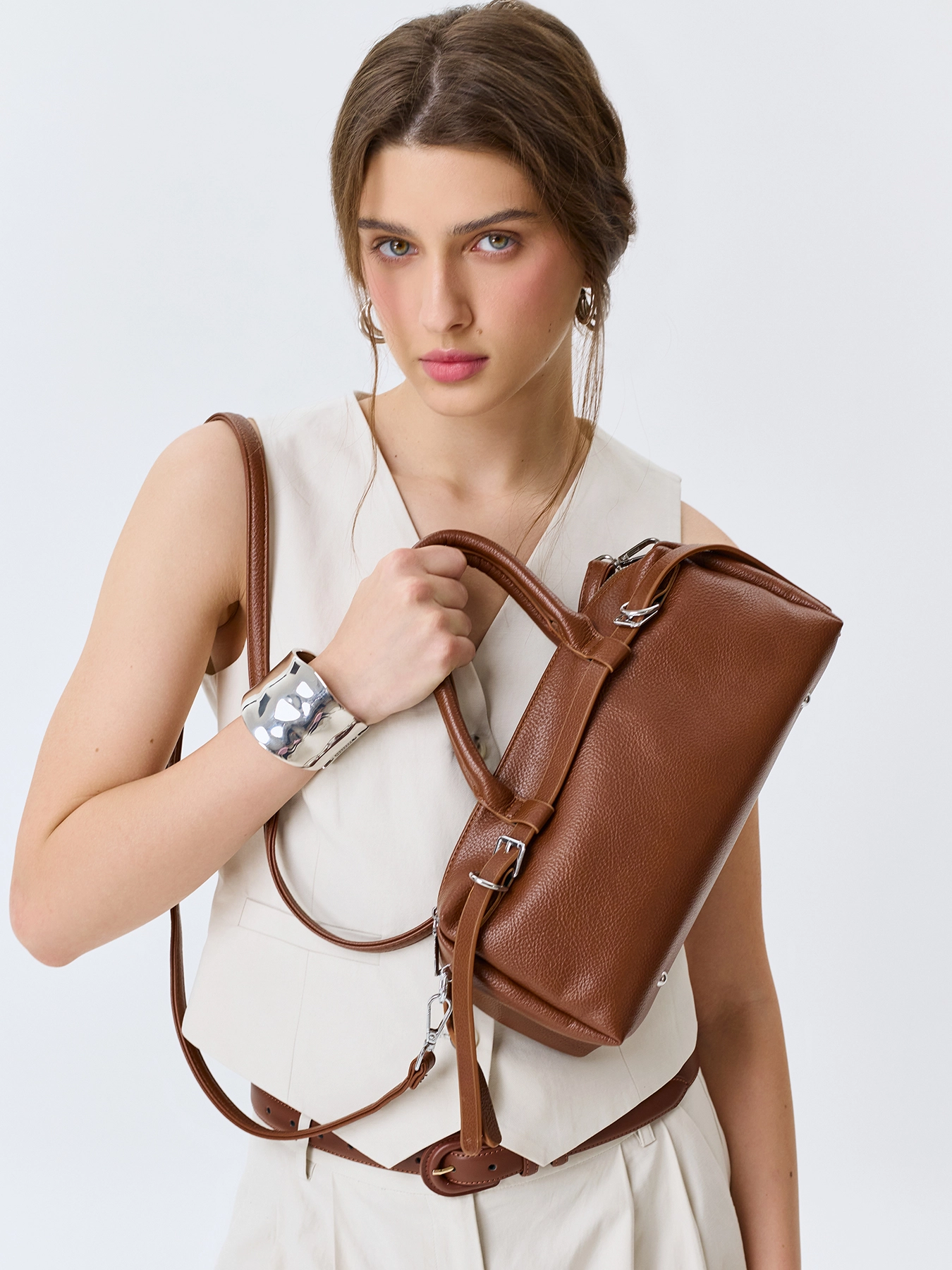 Сумка-багет из мягкой эко кожи коричневого цвета. Мягкая форма, две короткие ручки и длинный регулируемый ремешок в комплекте. Застёжка на молнию. Подкладка из 100% полиэстера.