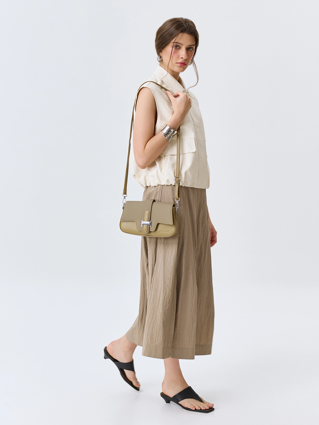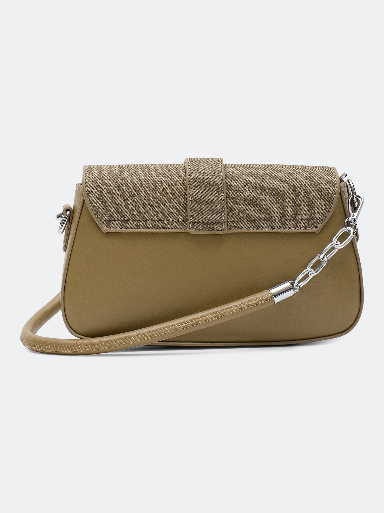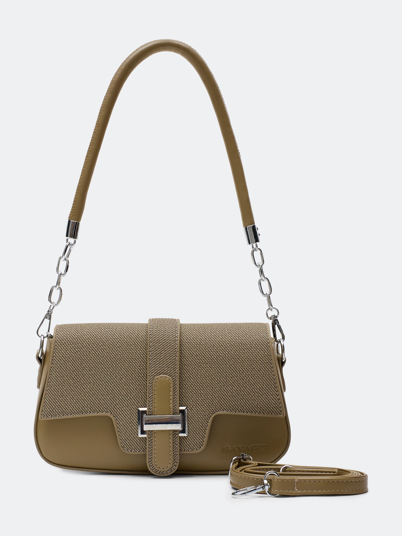 Оливковая сумка кроссбоди с клапаном из фактурной эко кожи. Одно вместительное отделение. Застежка на клапан и кнопку. Один съемный короткий ремешок с акцентной цепочкой и длинный регулируемый ремешок в комплекте. Подкладка из 100% полиэстера.