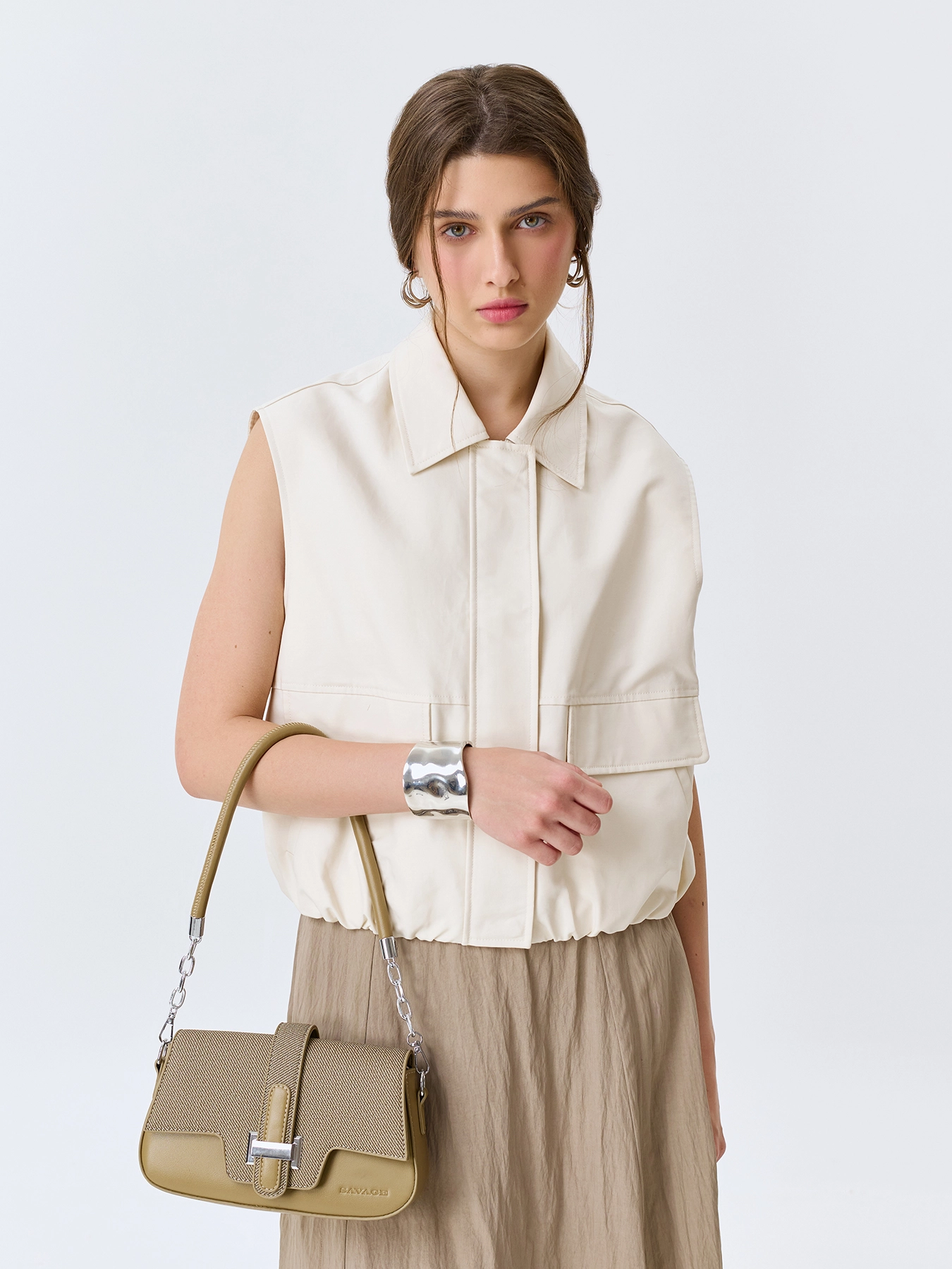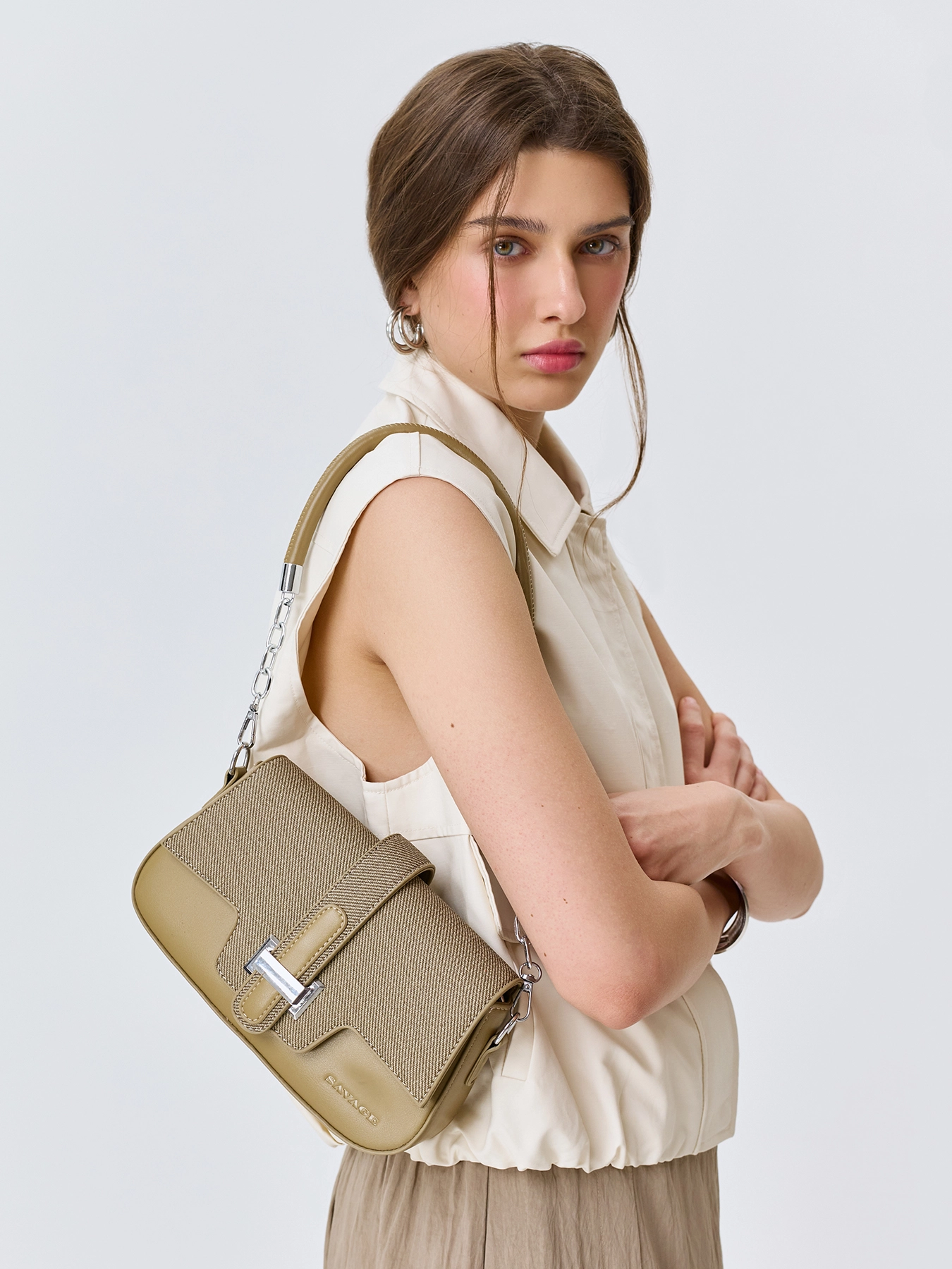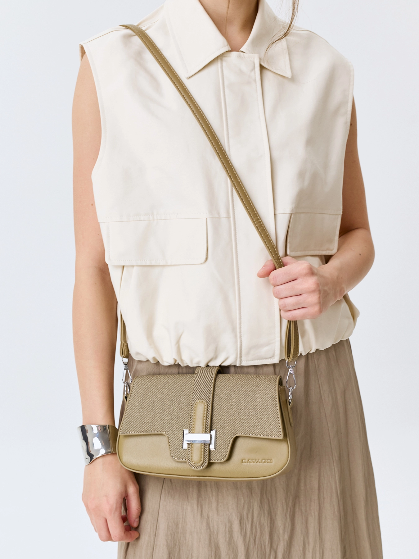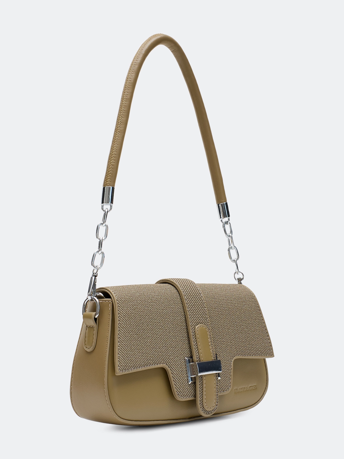 Оливковая сумка кроссбоди с клапаном из фактурной эко кожи. Одно вместительное отделение. Застежка на клапан и кнопку. Один съемный короткий ремешок с акцентной цепочкой и длинный регулируемый ремешок в комплекте. Подкладка из 100% полиэстера.