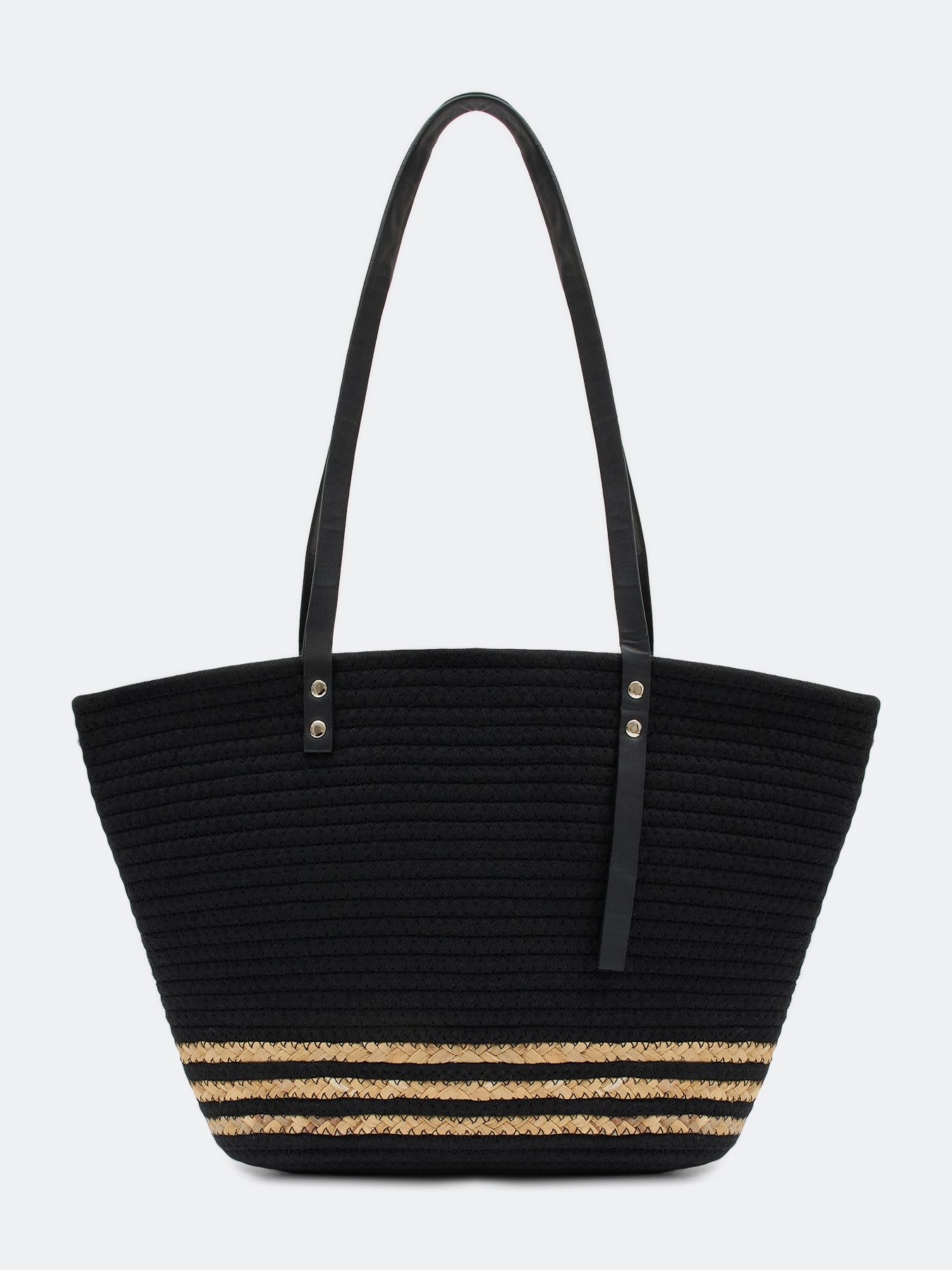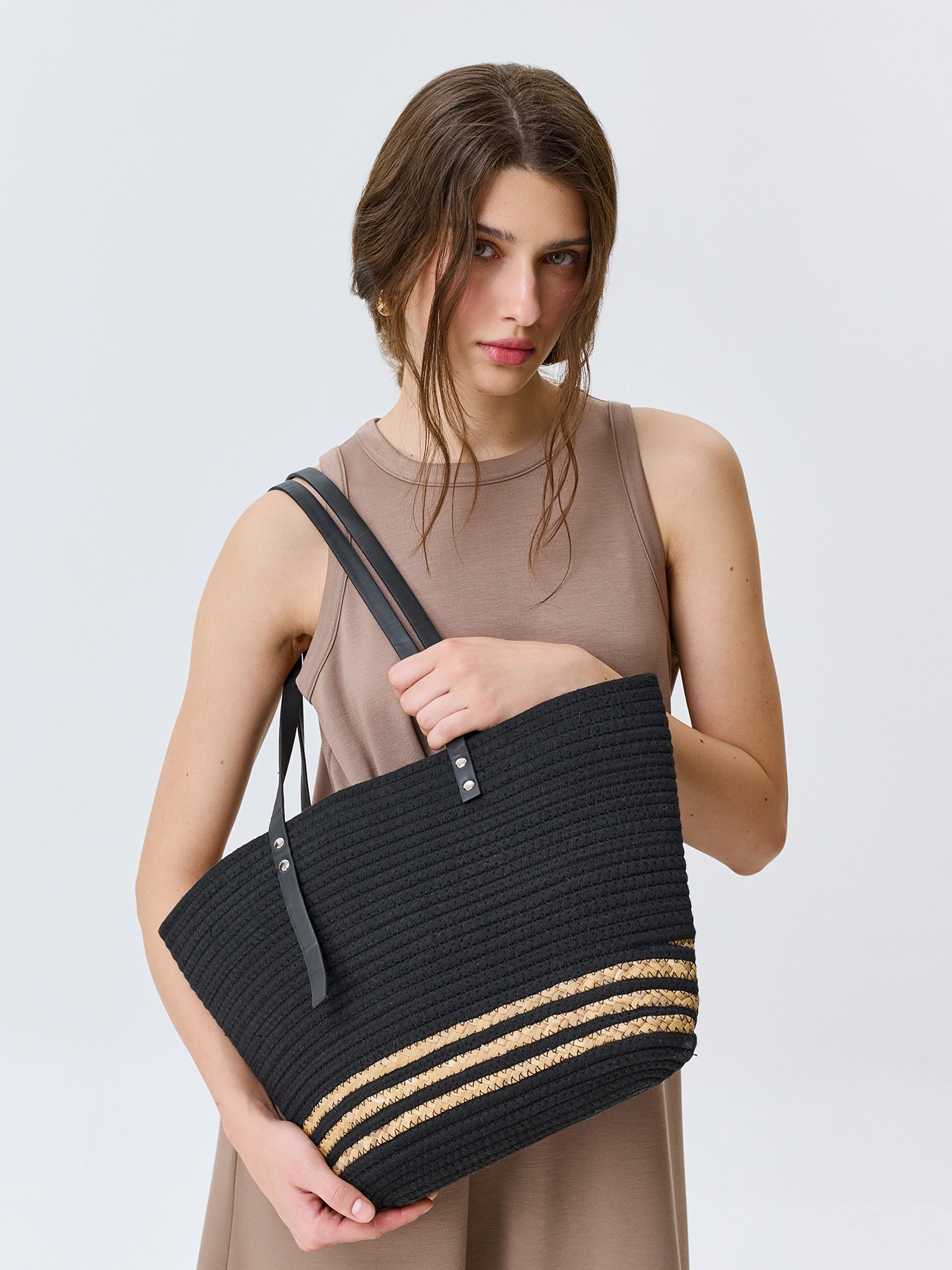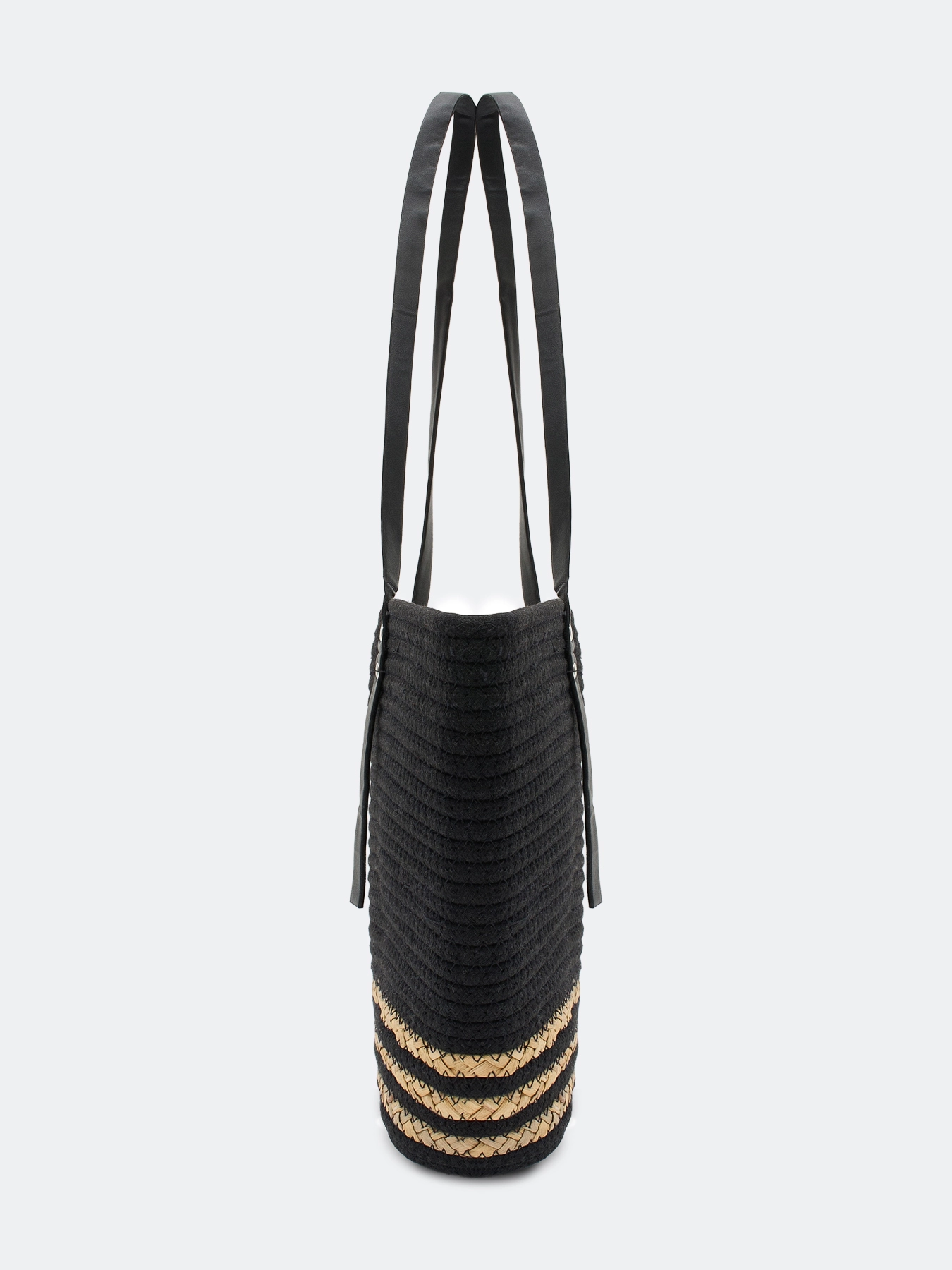 Плетеная сумка-тоут из рафии черного цвета с контрастными полосами. Две длинные ручки. Одно основное отделение. Подкладка из 100% нейлона.