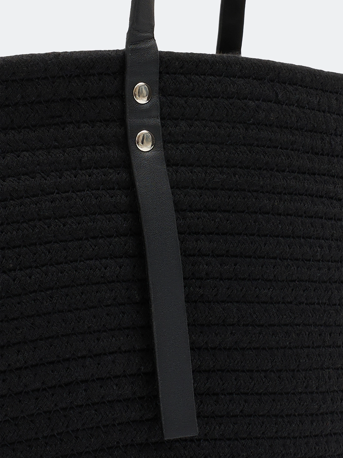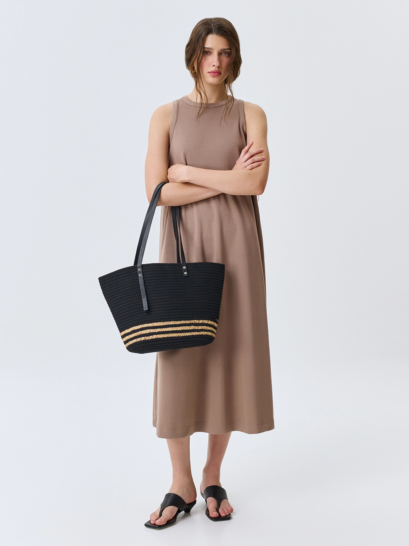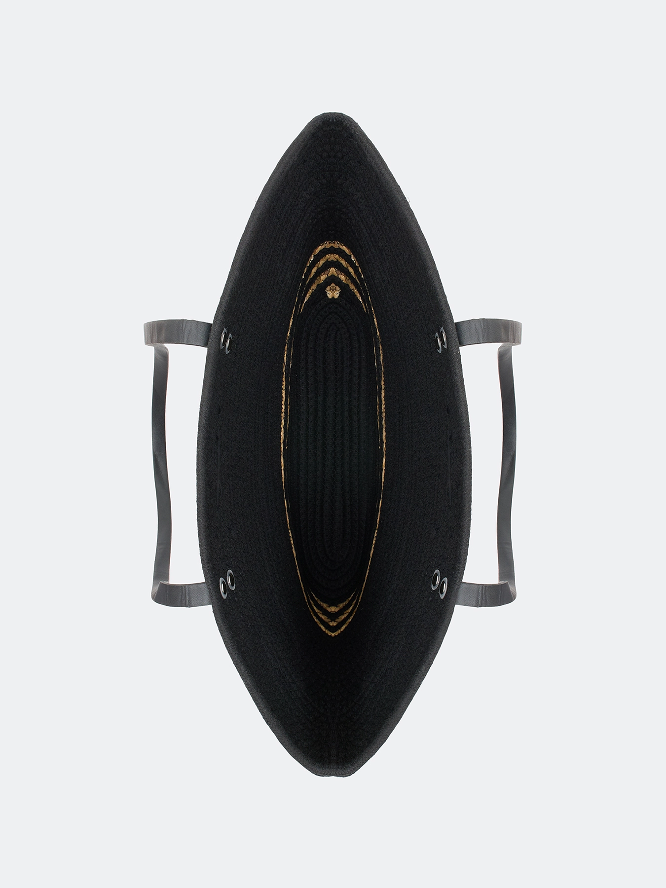 Плетеная сумка-тоут из рафии черного цвета с контрастными полосами. Две длинные ручки. Одно основное отделение. Подкладка из 100% нейлона.