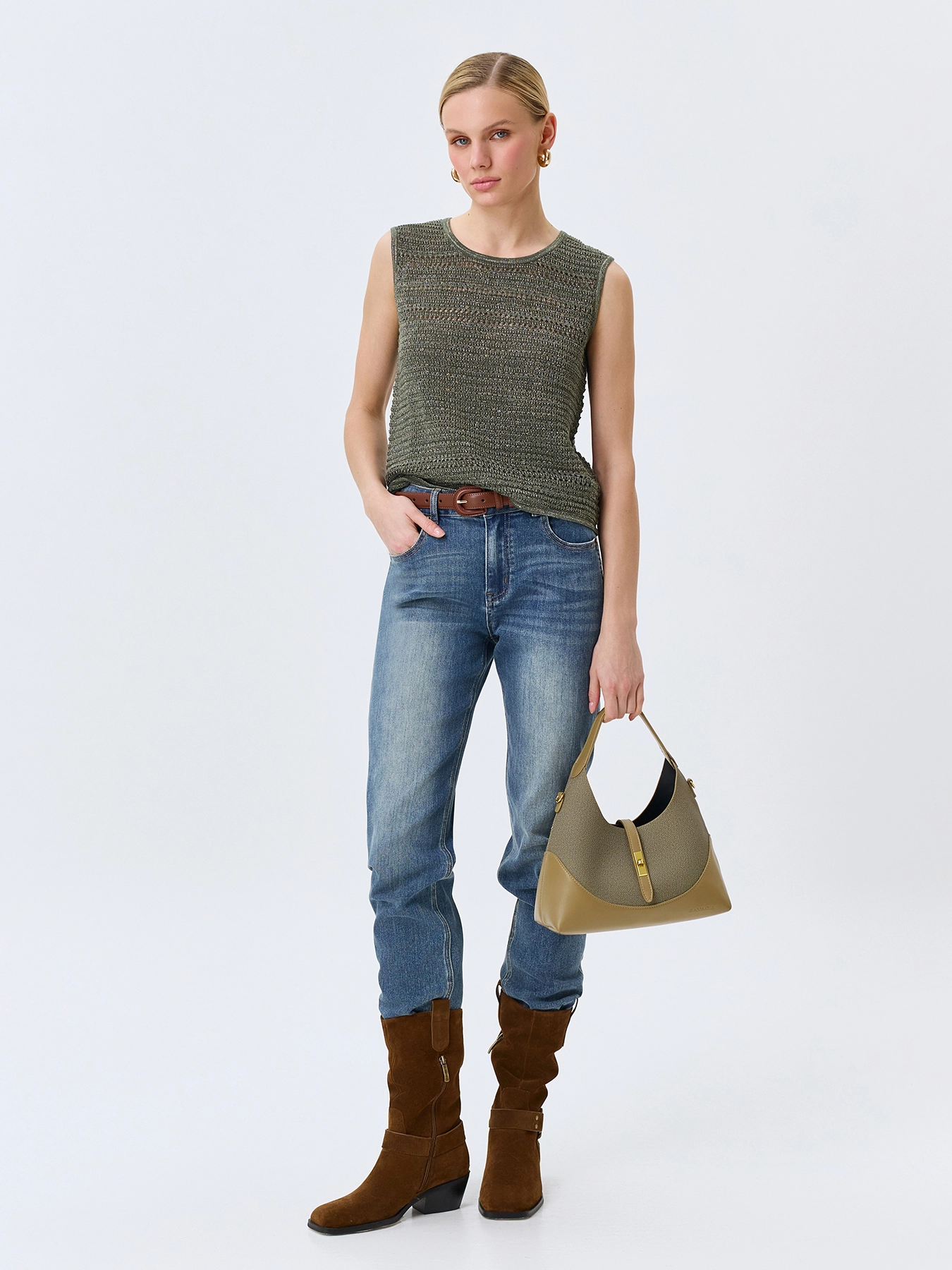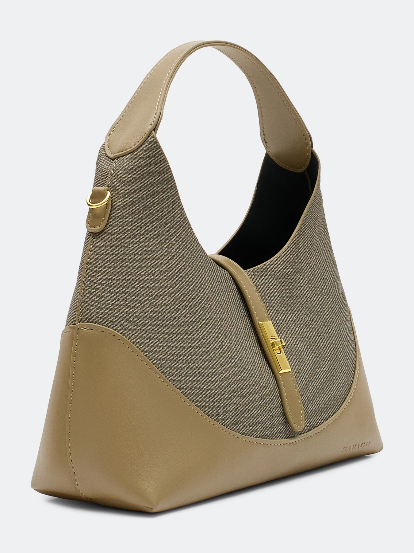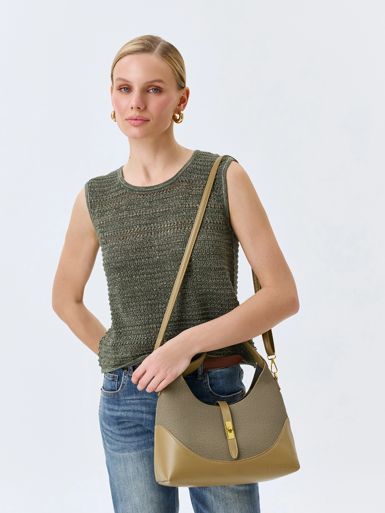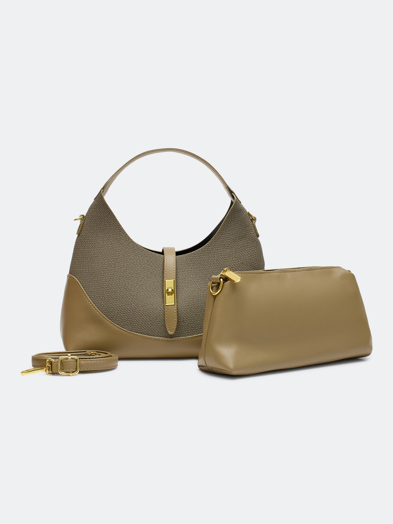 Комплект сумка-тоут из комбинированной фактурной искусственной кожи с косметичкой. Одна короткая ручка и длинный регулируемый ремешок. Застежка на поворотный механизм. Косметичка из гладкой эко кожи с застежкой молнией.