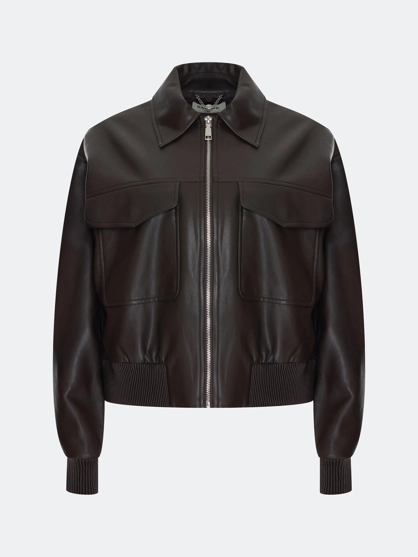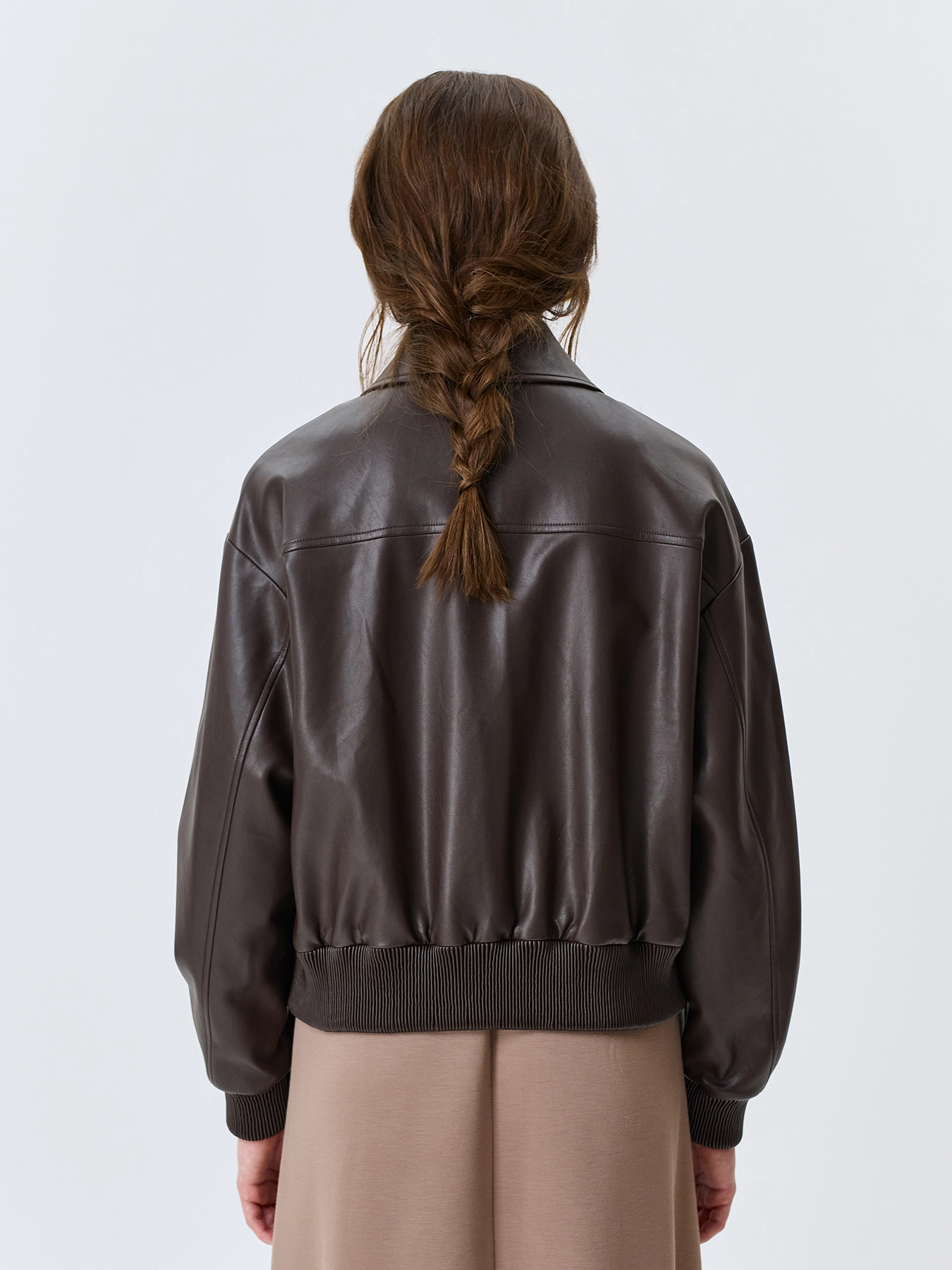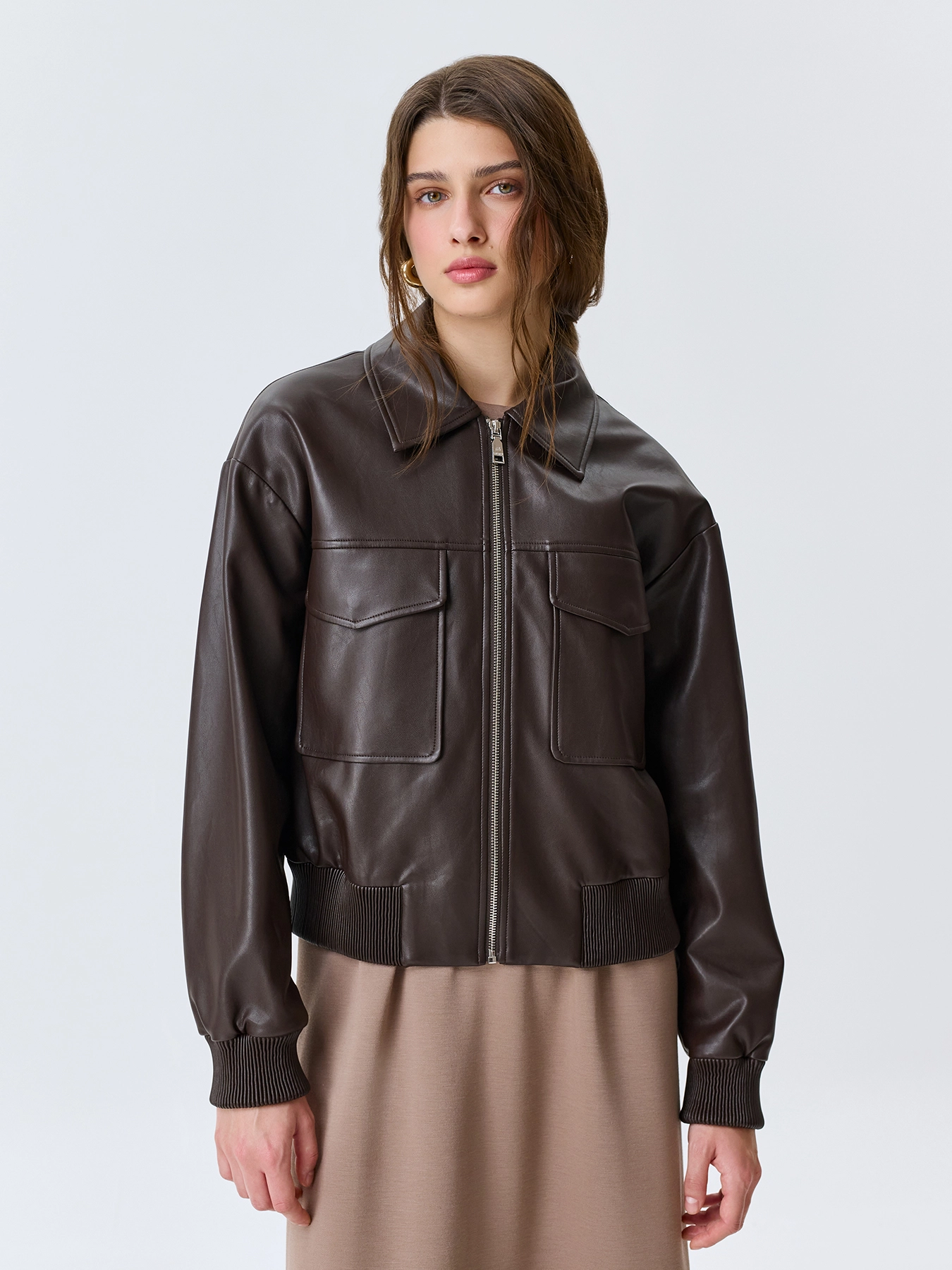 Бомбер из эко кожи с накладными карманами. Свободный силуэт. Отложной воротник. Застежка на молнию. Спущенная линия плеч. Накладные боковые карманы с клапанами на кнопках. Дополнен рибом по низу рукавов и изделия.