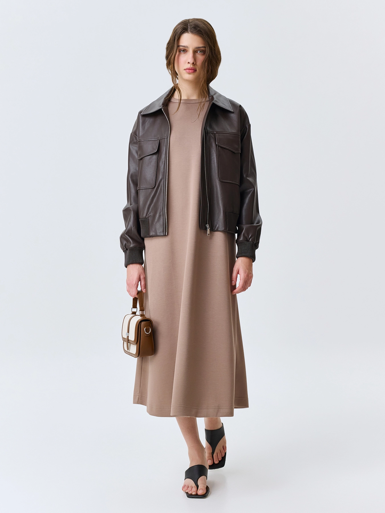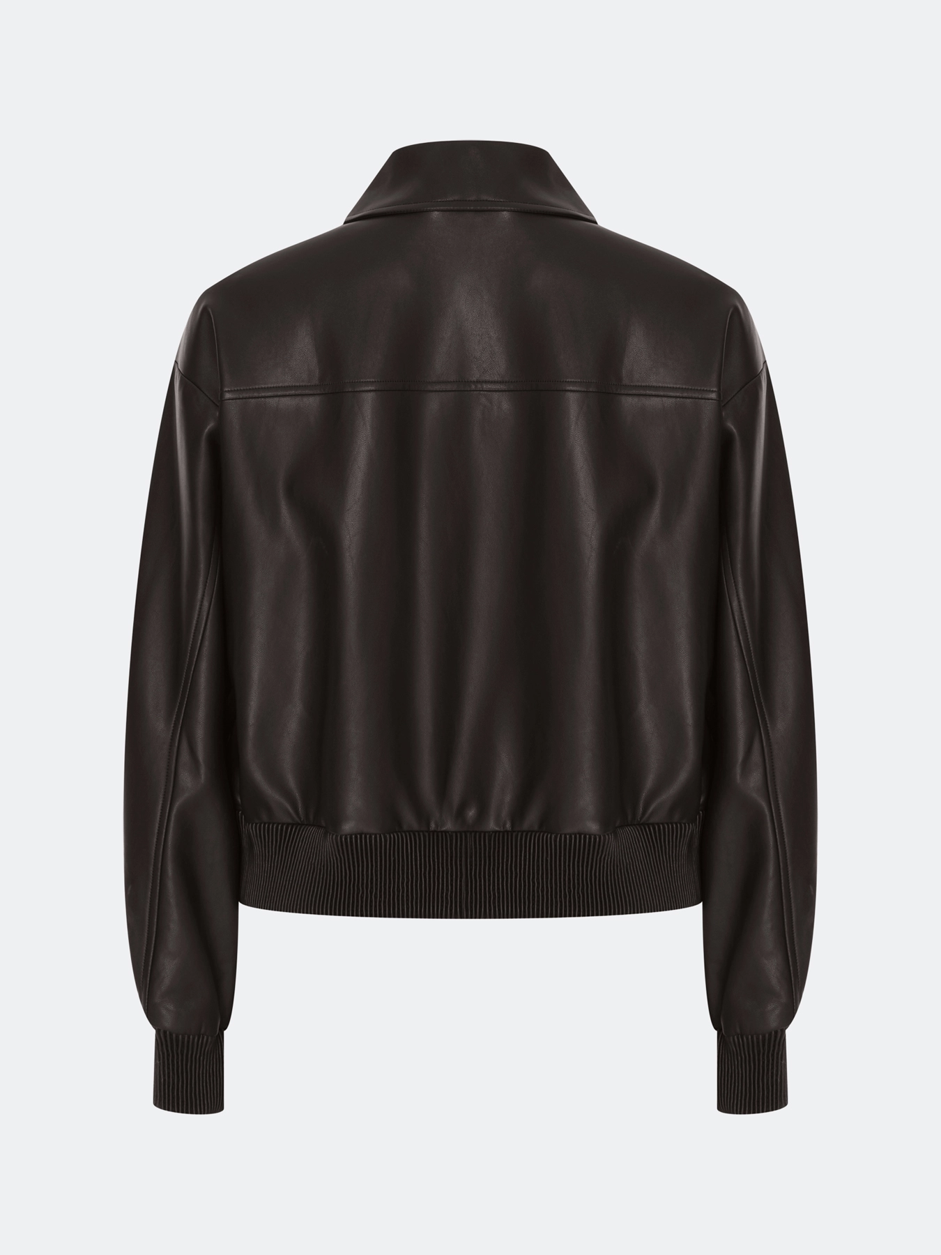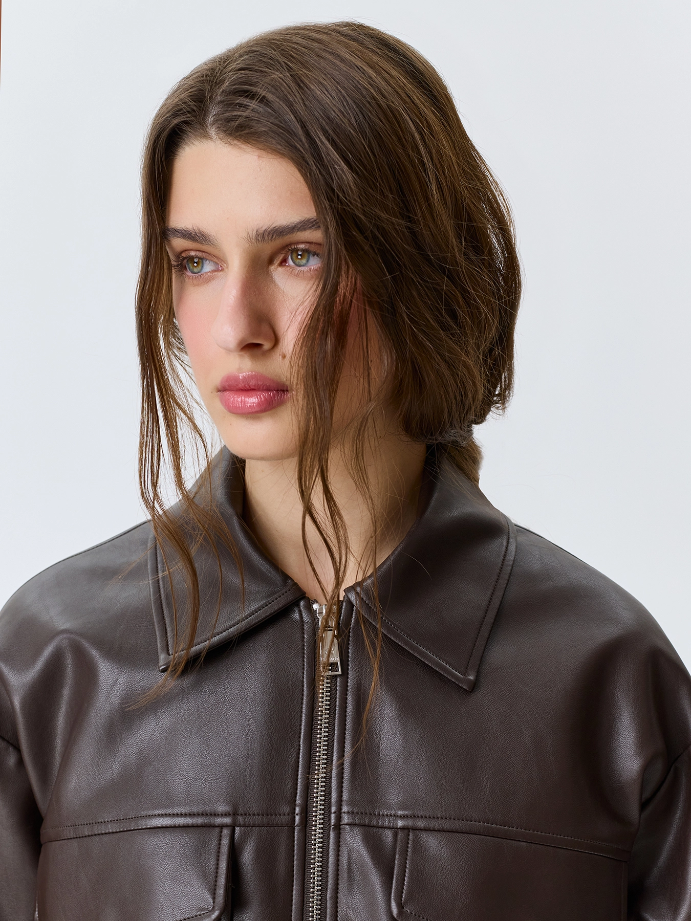 Бомбер из эко кожи с накладными карманами. Свободный силуэт. Отложной воротник. Застежка на молнию. Спущенная линия плеч. Накладные боковые карманы с клапанами на кнопках. Дополнен рибом по низу рукавов и изделия.