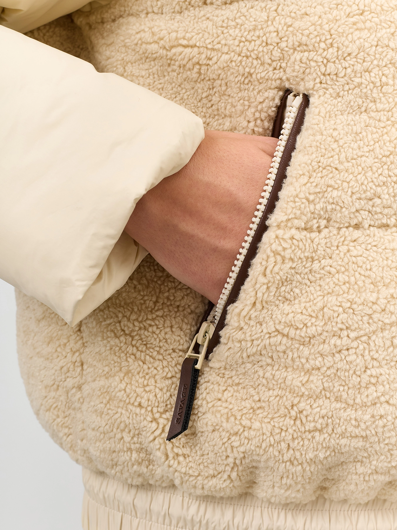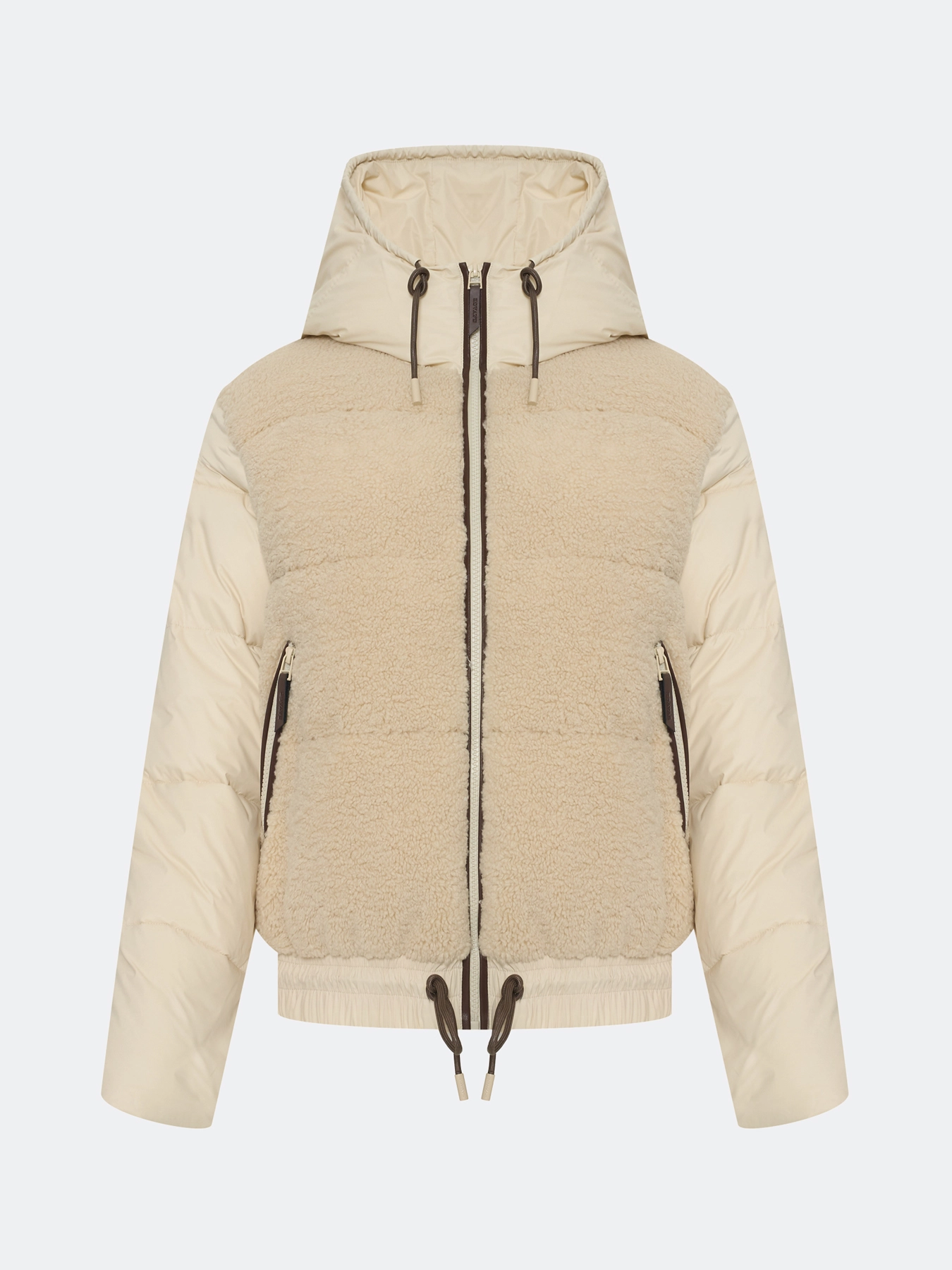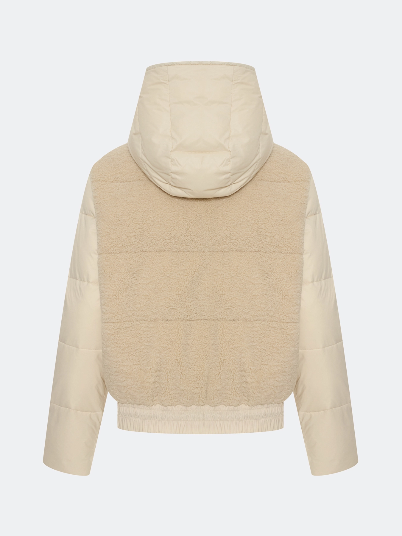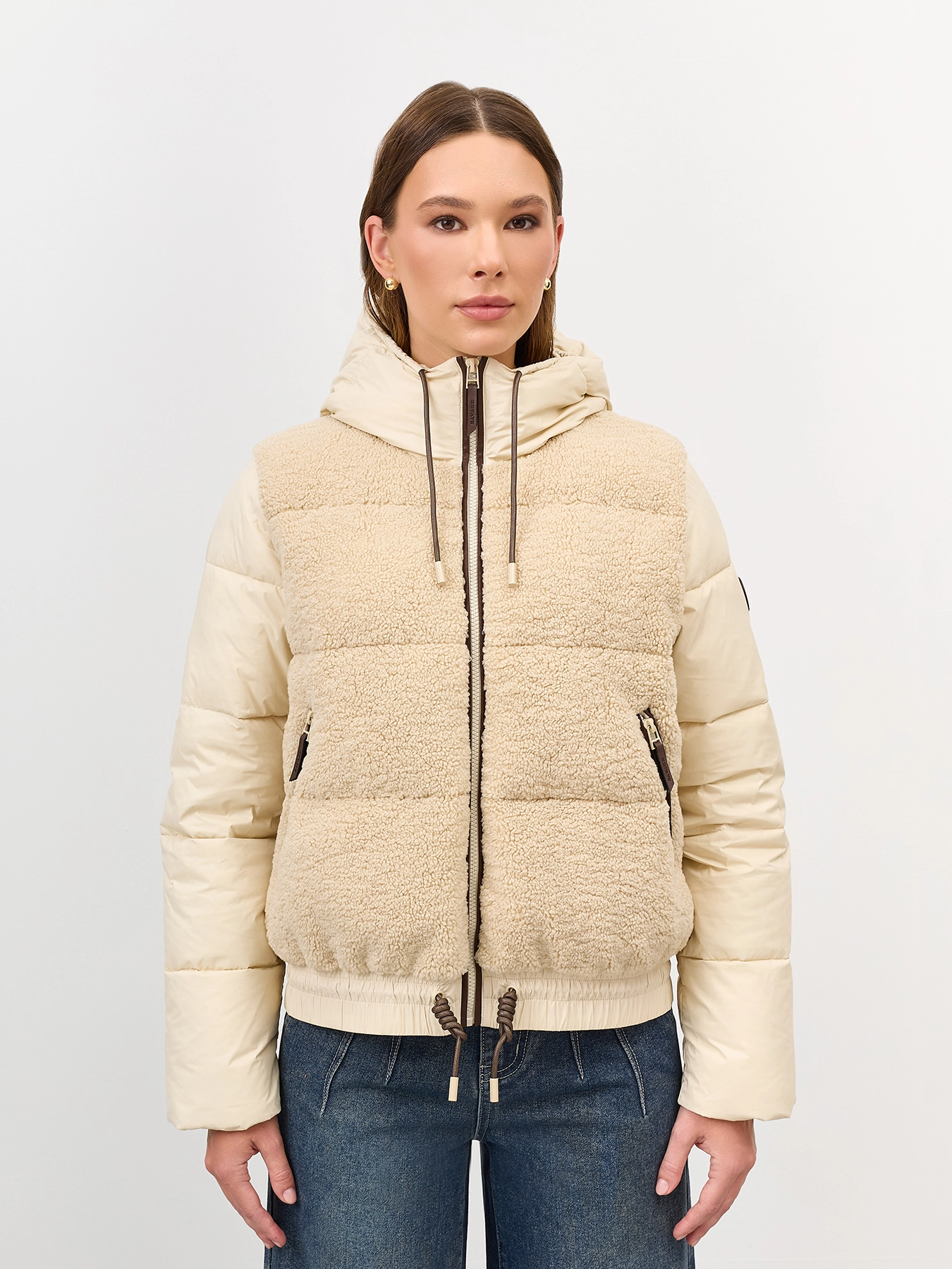 Комбинированная куртка с искусственным мехом и контрастными деталями из экокожи. Прямой силуэт. Застежка на молнию с контрастными кантами. Воротник стойка дополнен капюшоном на контрастном шнурке. Боковые карманы на молнии с отделкой. Планка по низу изделия дополнен контрастной кулисой для защиты от ветра. Дополнена брендированным патчем на рукаве.
