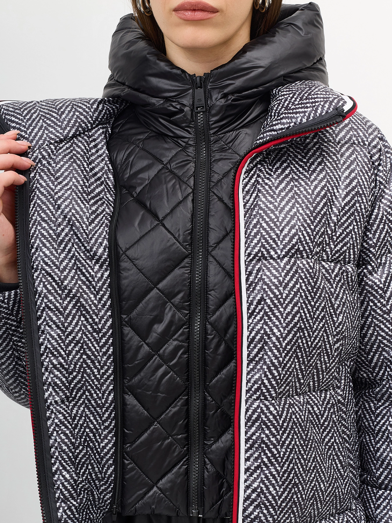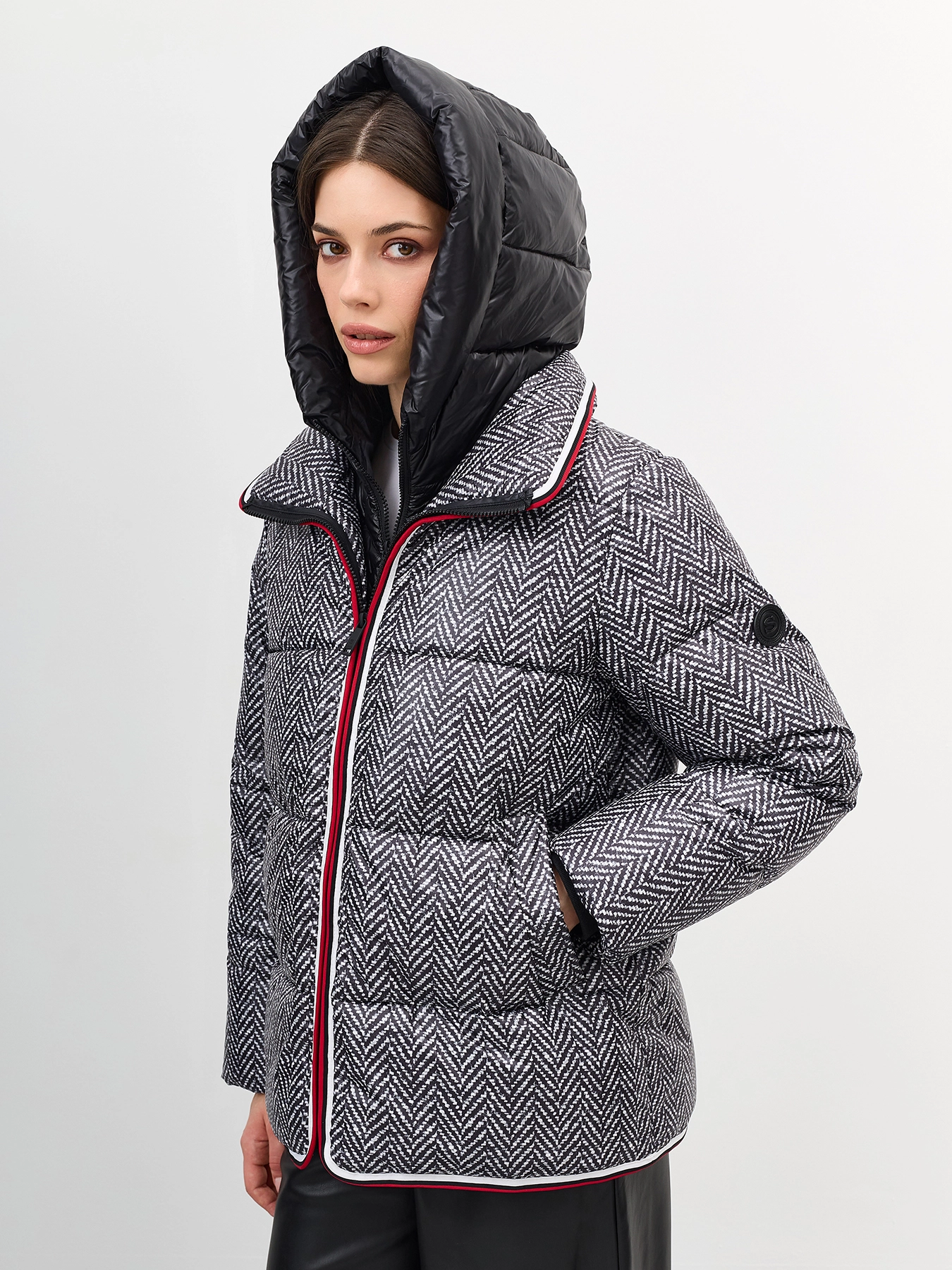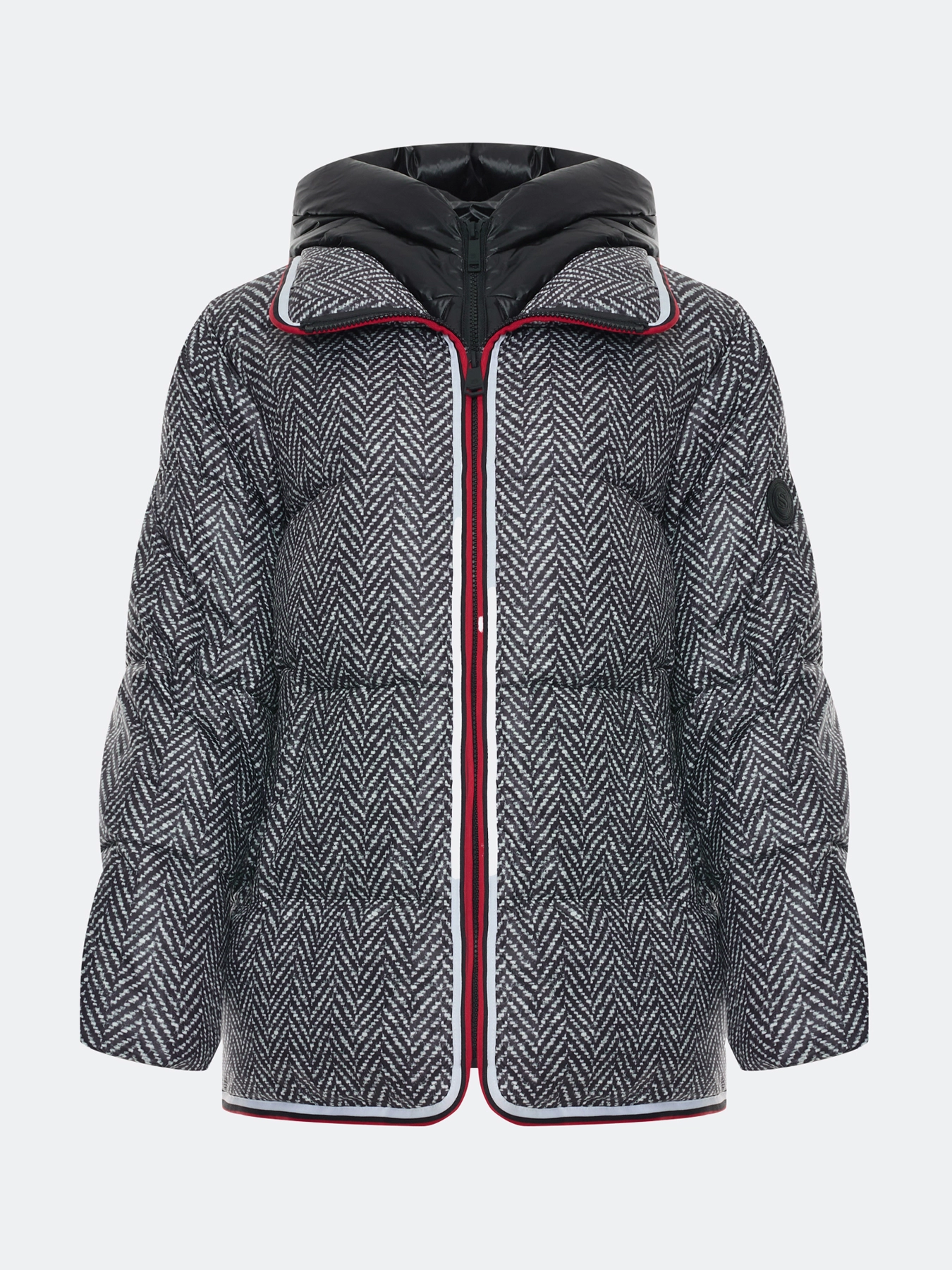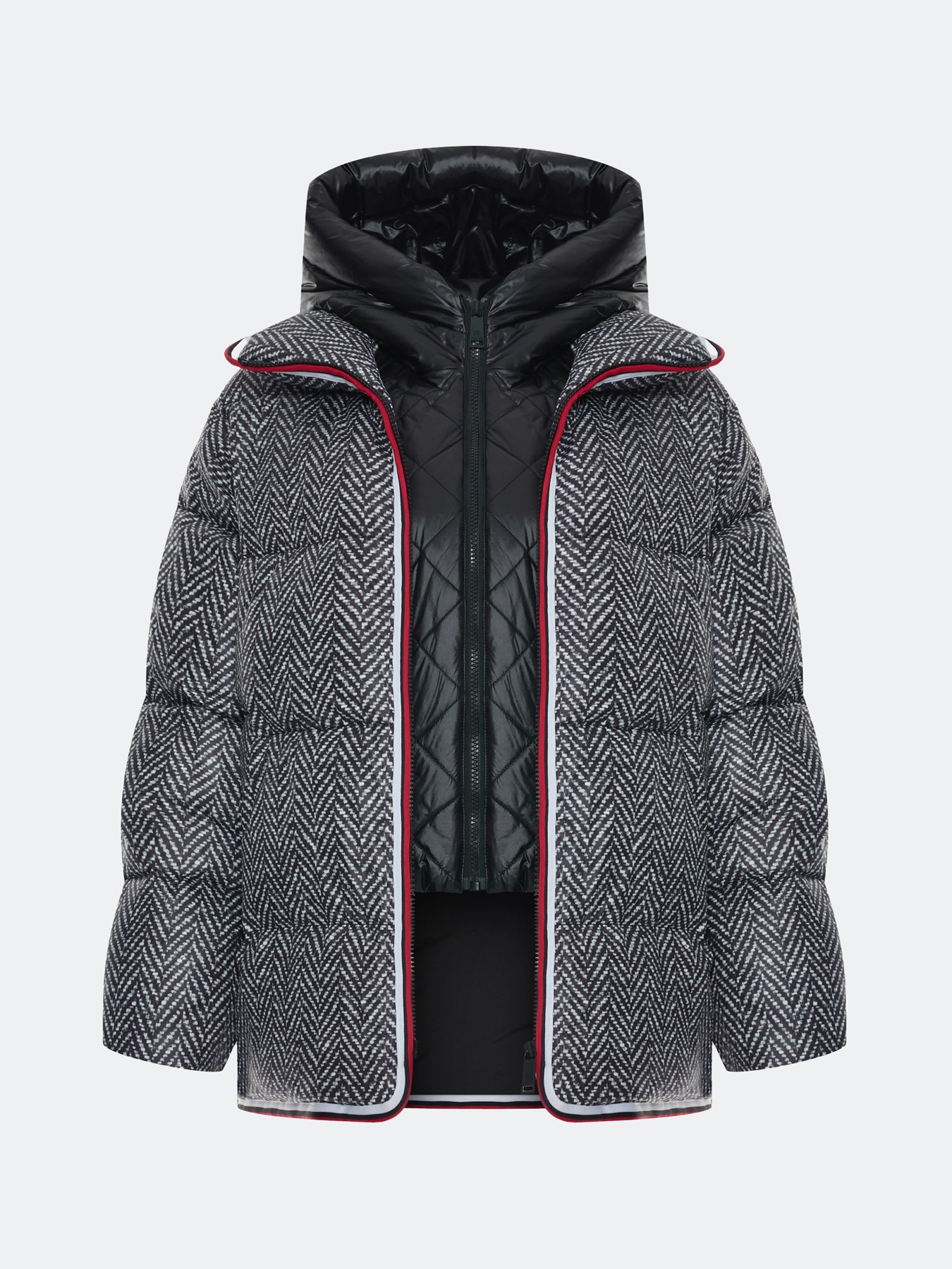 Комбинированная куртка c манишкой. Верхняя ткань имитирует твид с принтом елочка. Свободный силуэт. Трикотажные манжеты по низу рукавов. Спущенная линия плеч. Застежка на молнию. Воротник стойка на липучке меняется на отложной. Боковые карманы с листочками. Дополнена декоративным контрастным кантом. Дополнена брендированным патчем на рукаве. Дополнена съемной манишкой из 100% нейлона. Воротник стойка дополнен капюшоном. Застежка на молнию.