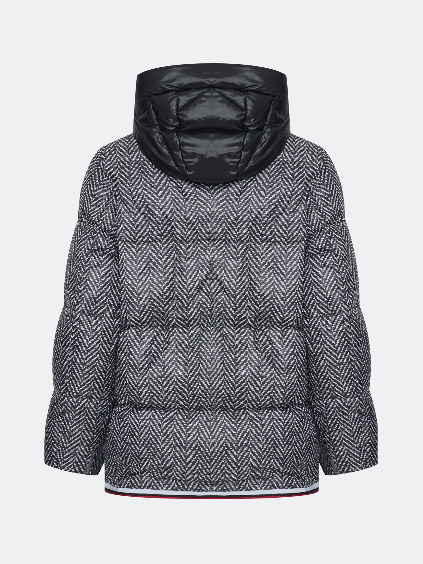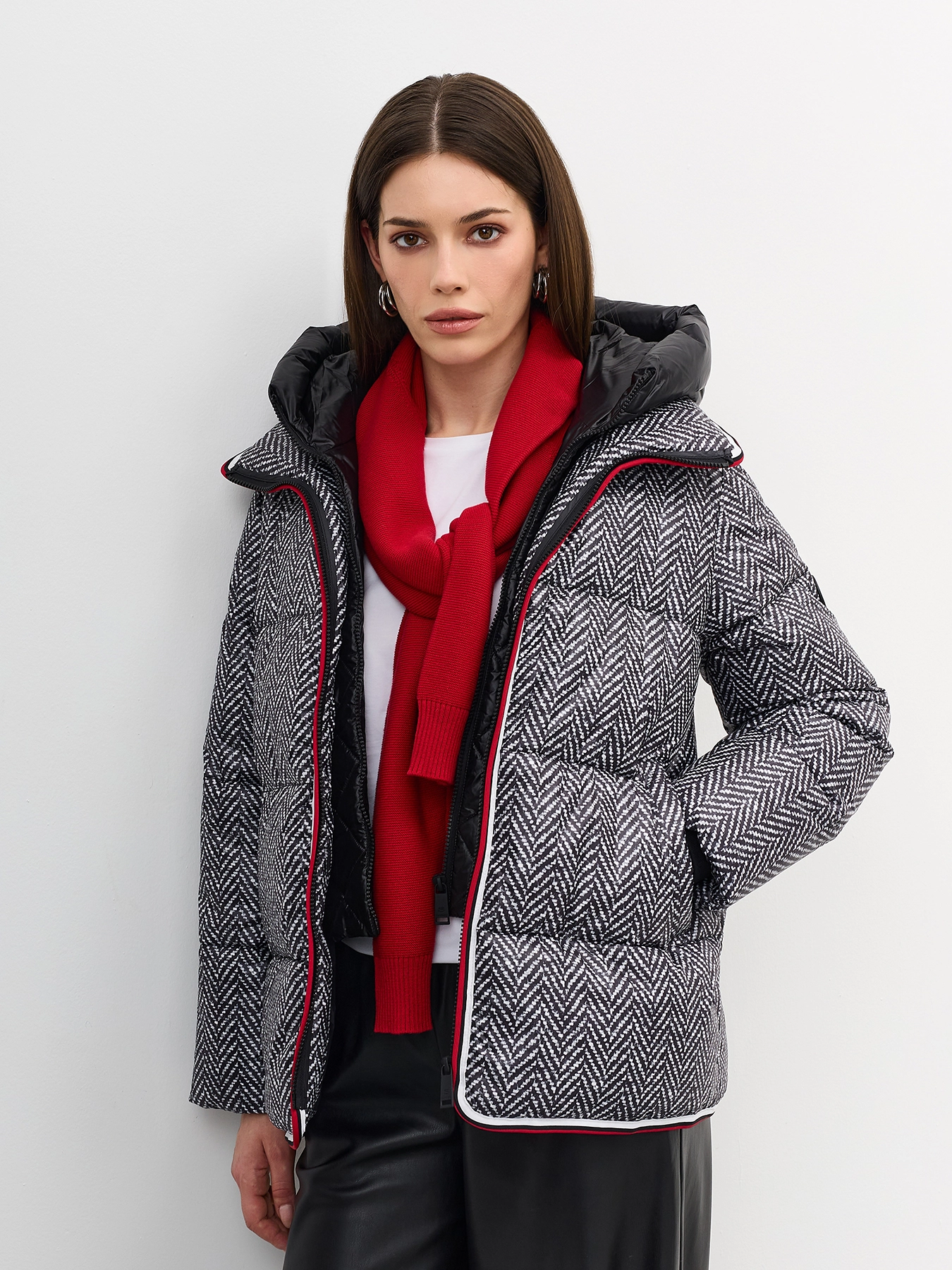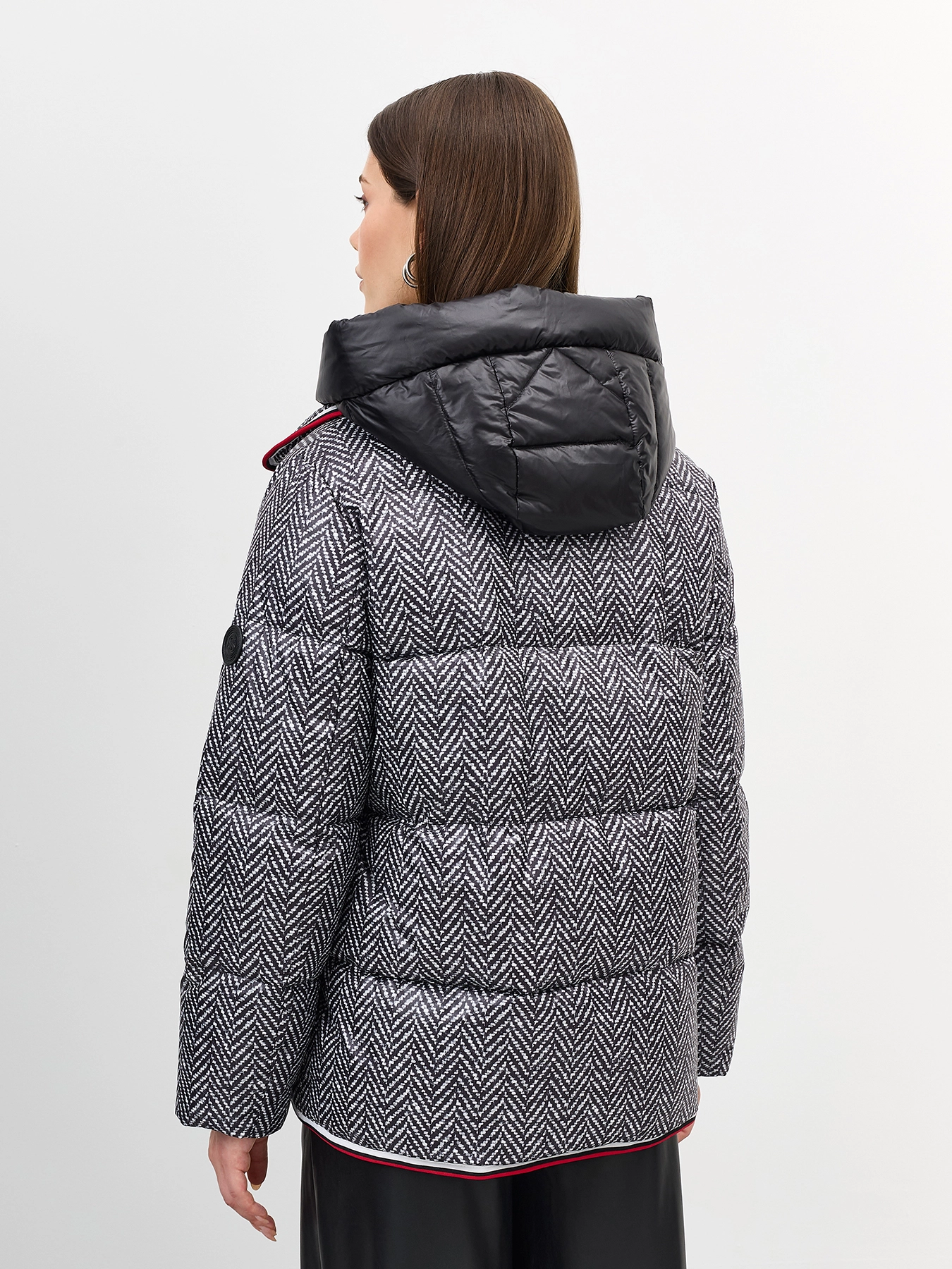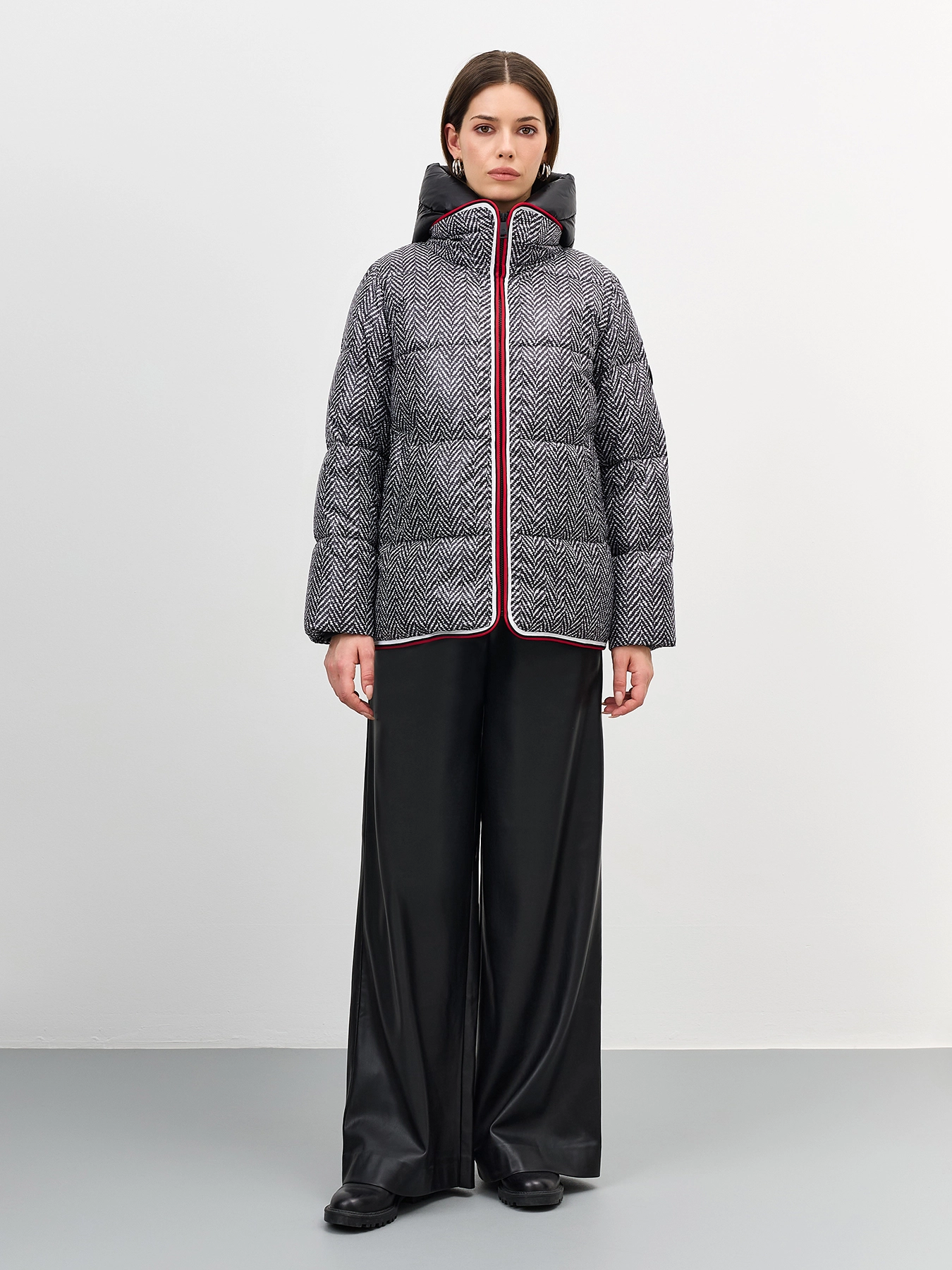 Комбинированная куртка c манишкой. Верхняя ткань имитирует твид с принтом елочка. Свободный силуэт. Трикотажные манжеты по низу рукавов. Спущенная линия плеч. Застежка на молнию. Воротник стойка на липучке меняется на отложной. Боковые карманы с листочками. Дополнена декоративным контрастным кантом. Дополнена брендированным патчем на рукаве. Дополнена съемной манишкой из 100% нейлона. Воротник стойка дополнен капюшоном. Застежка на молнию.