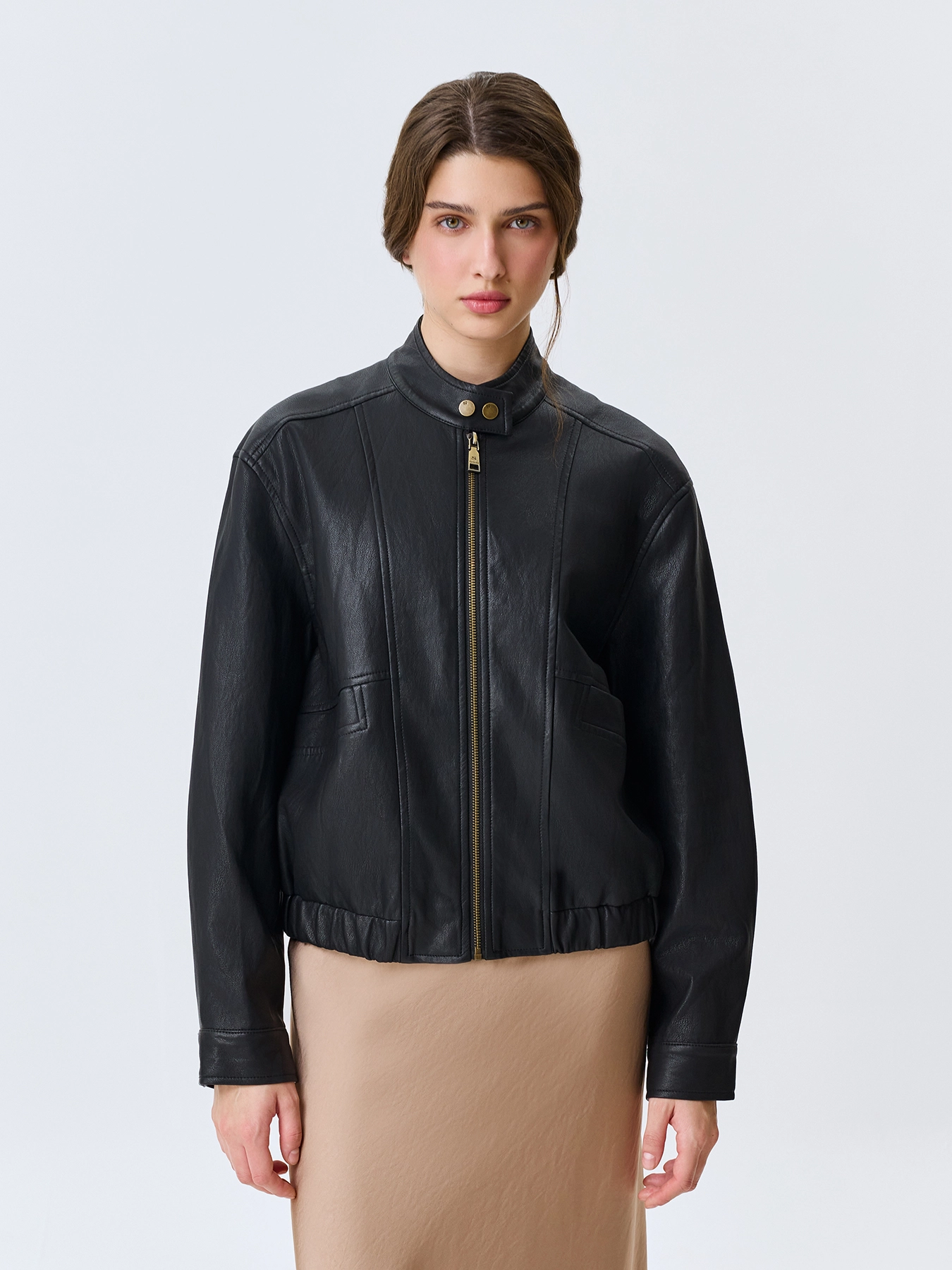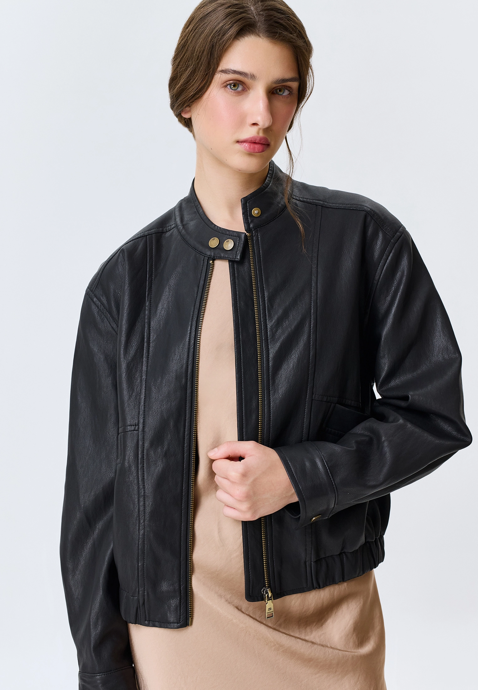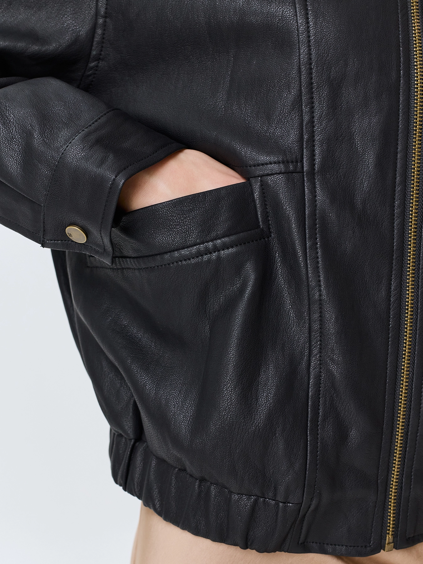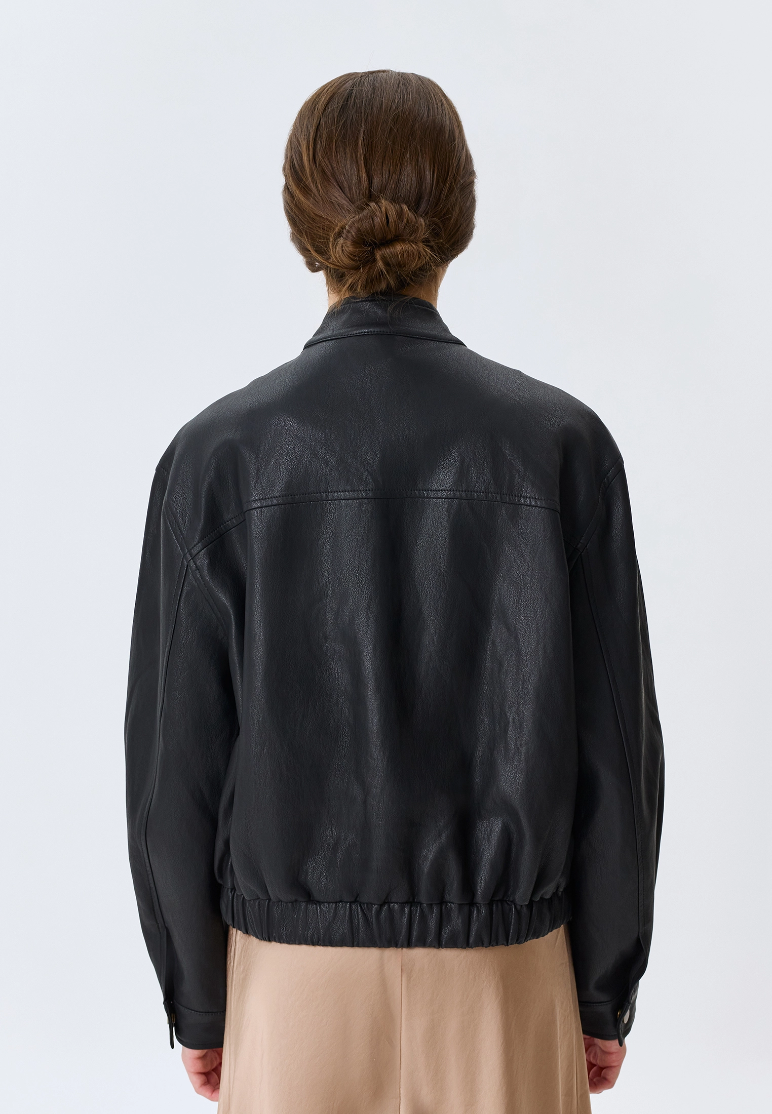 Свободная куртка из эко кожи. Воротник стойка на кнопках. Застежка на молнию. Накладные боковые карманы. Длинные рукава с манжетами на кнопках. Дополнен резинкой по низу изделия.