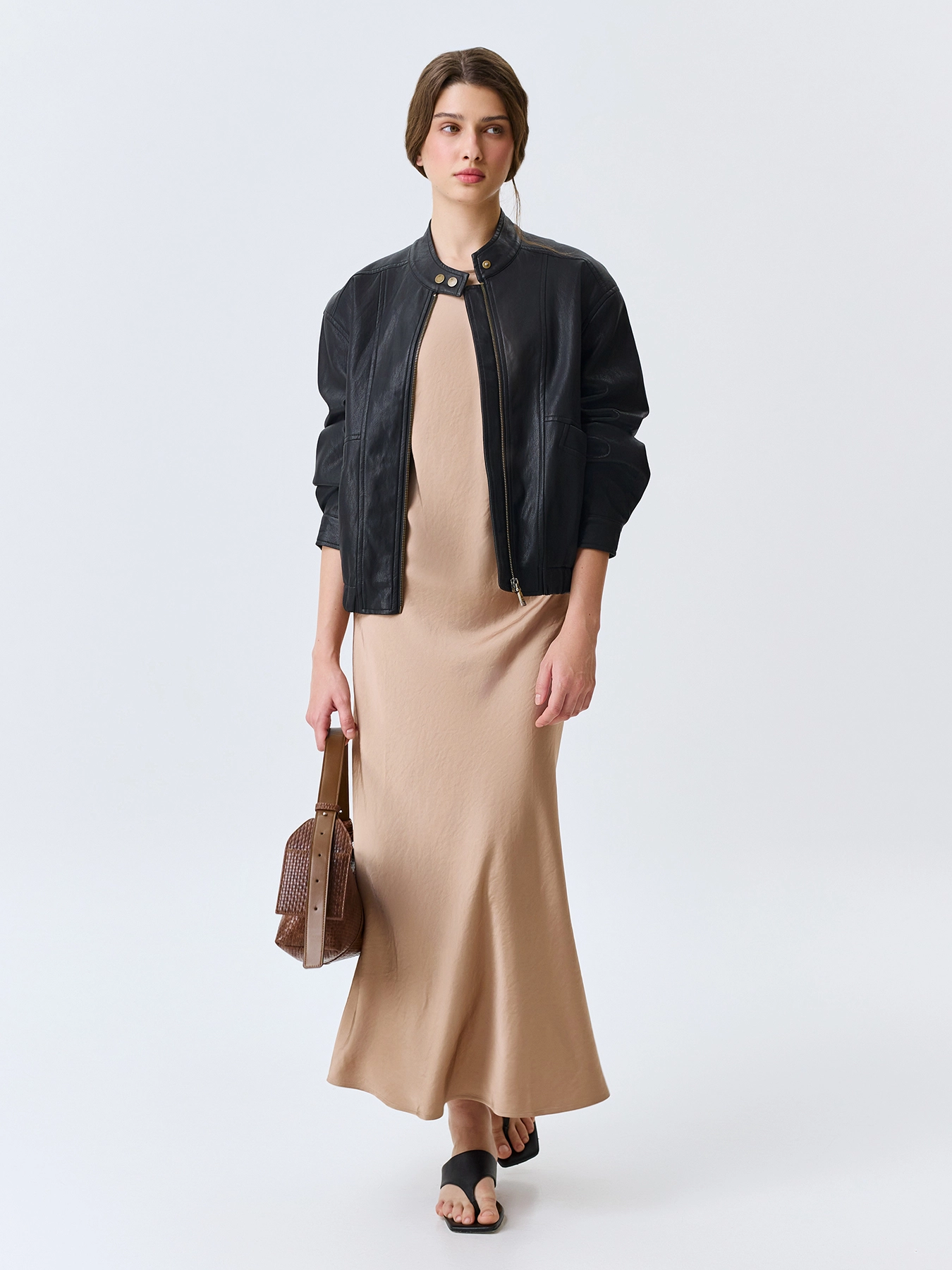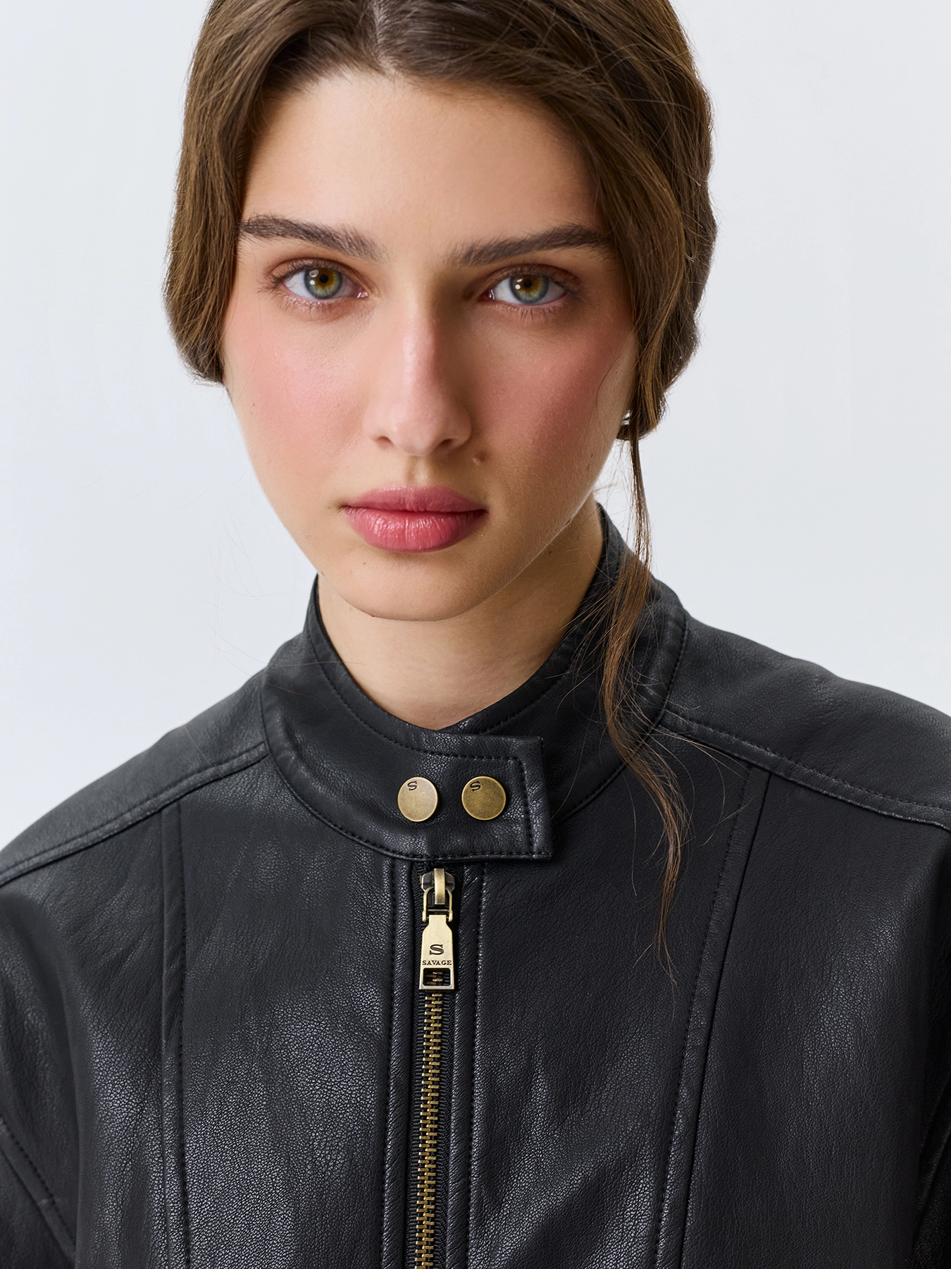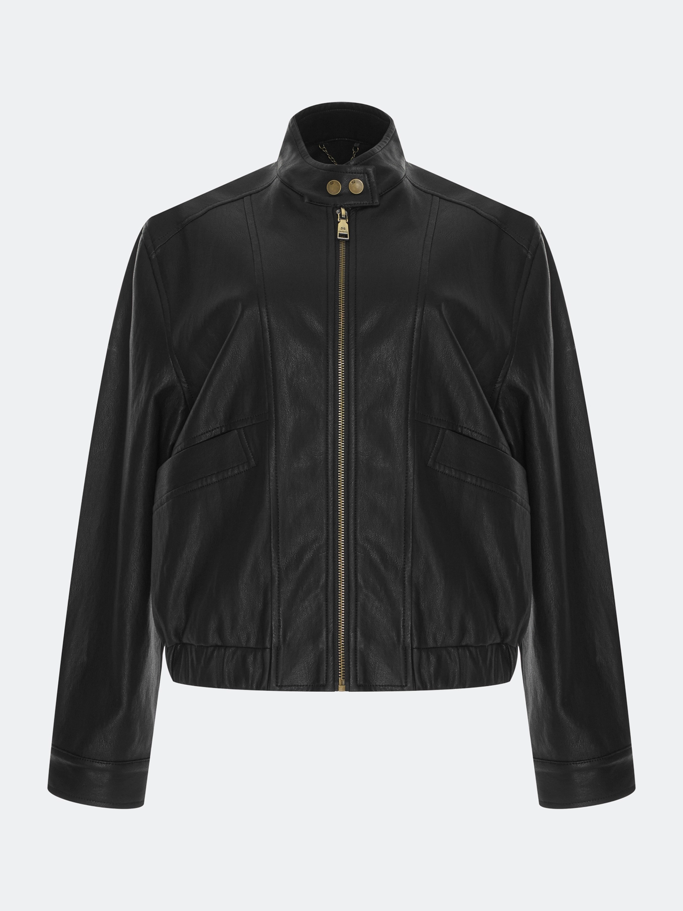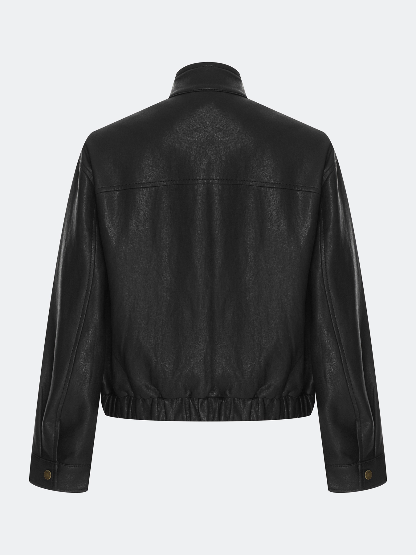 Свободная куртка из эко кожи. Воротник стойка на кнопках. Застежка на молнию. Накладные боковые карманы. Длинные рукава с манжетами на кнопках. Дополнен резинкой по низу изделия.