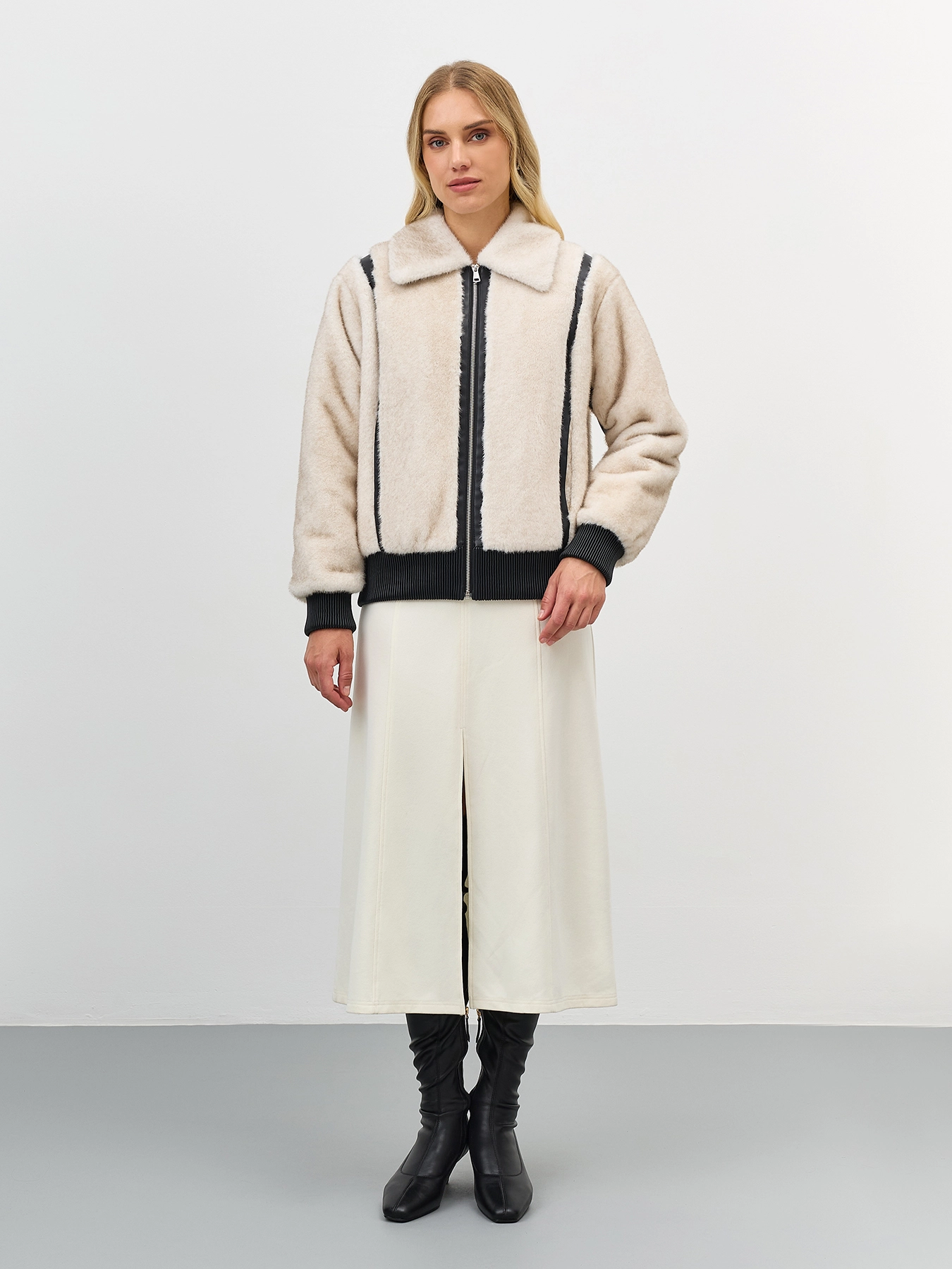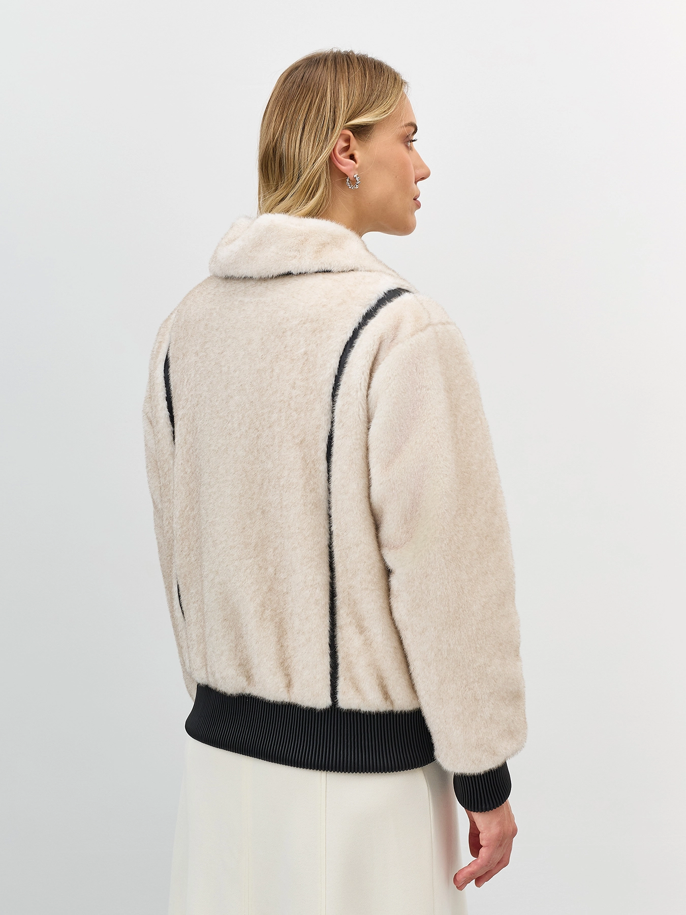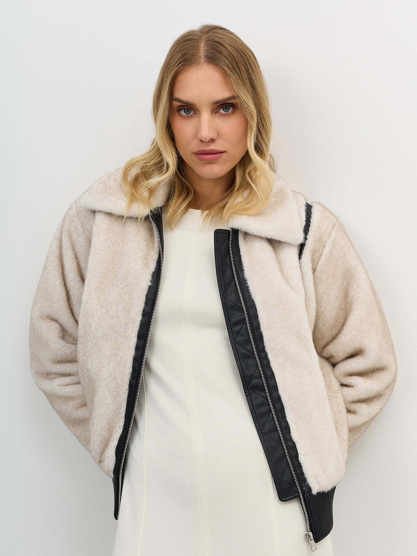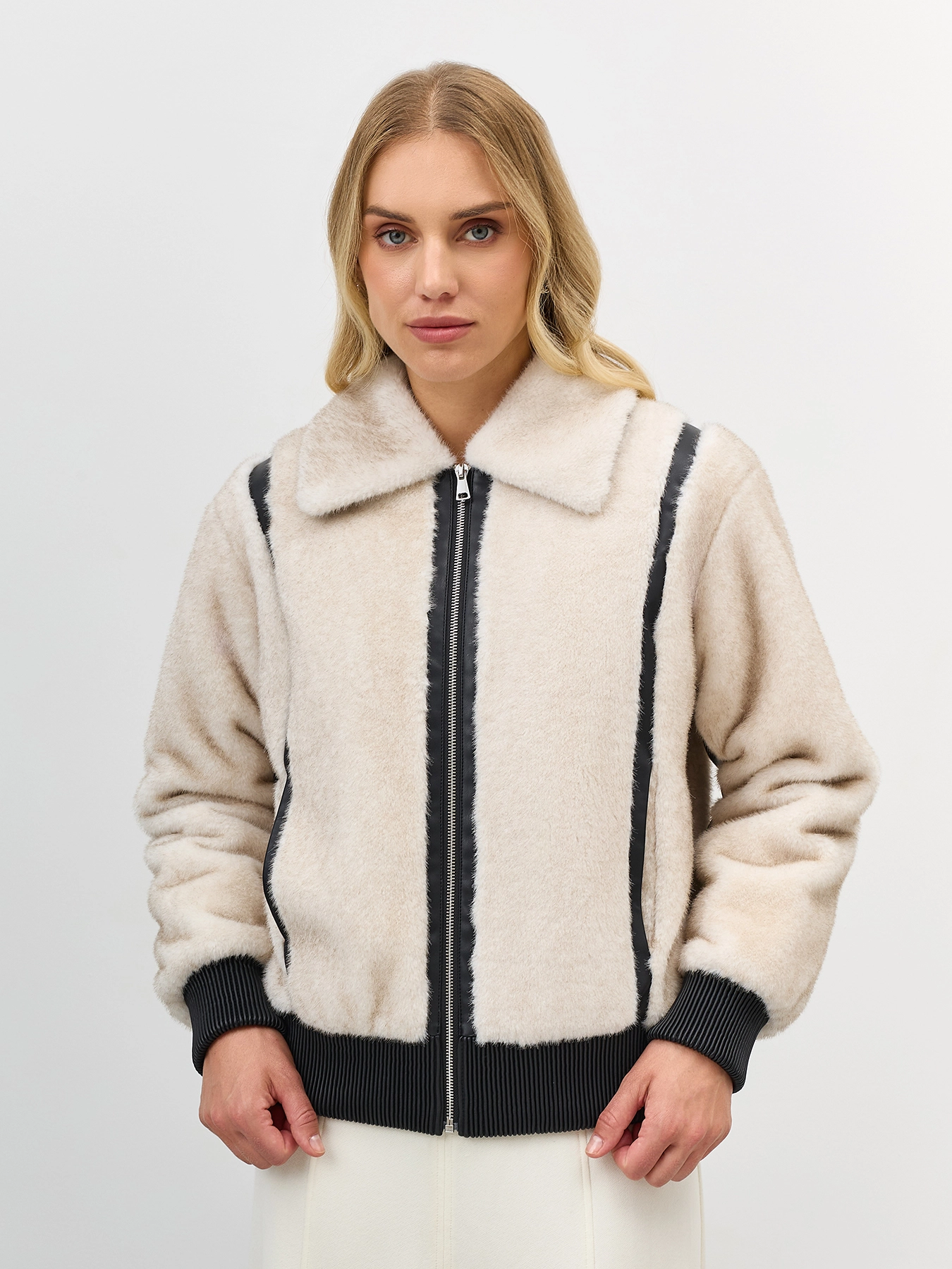 Укороченная куртка из искусственного меха. Прямой силуэт. Застежка на молнию. Отложной воротник из искусственного меха. Контрастные эластичные манжеты из экокожи по низу рукавов и изделия. Декоративные детали из контрастной экокожи.