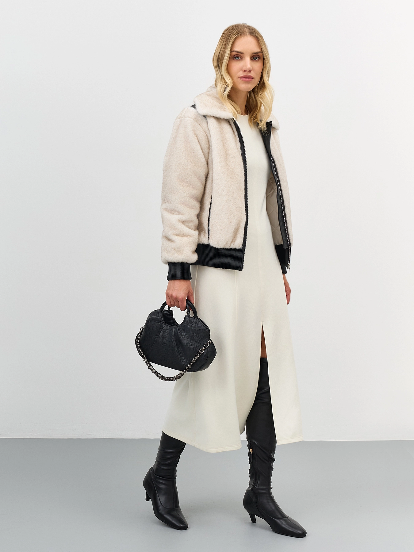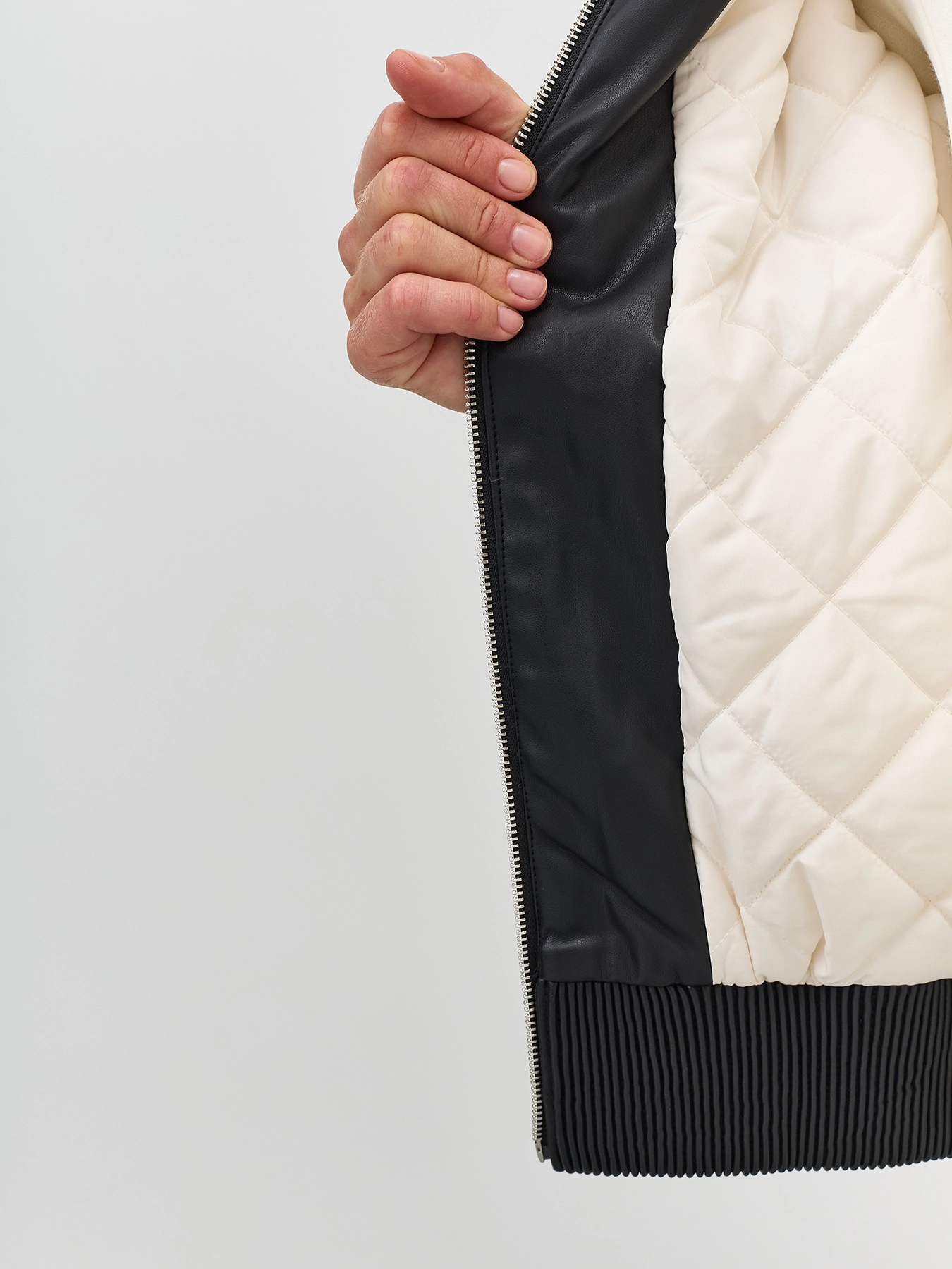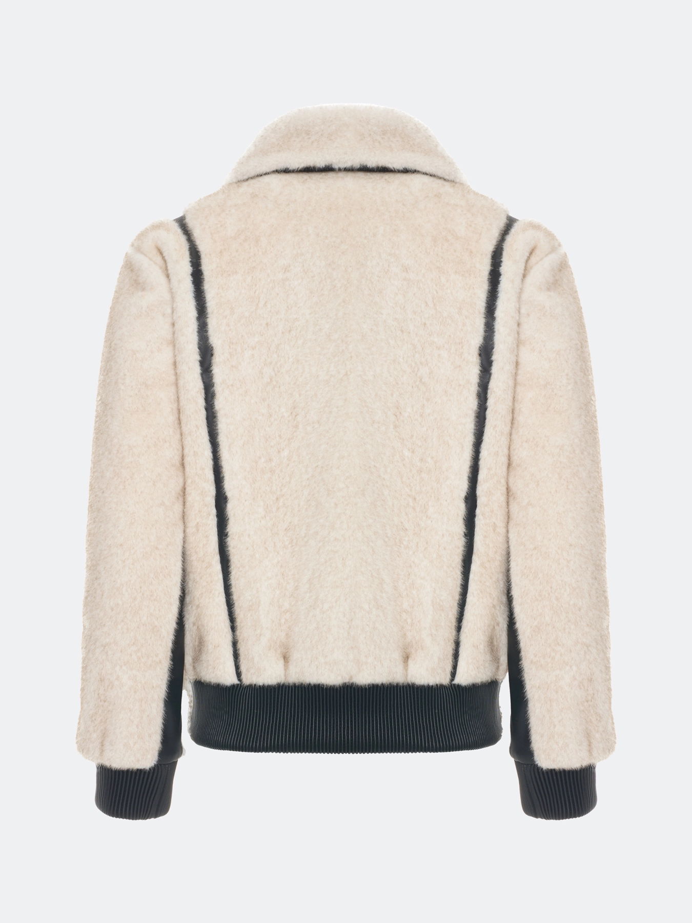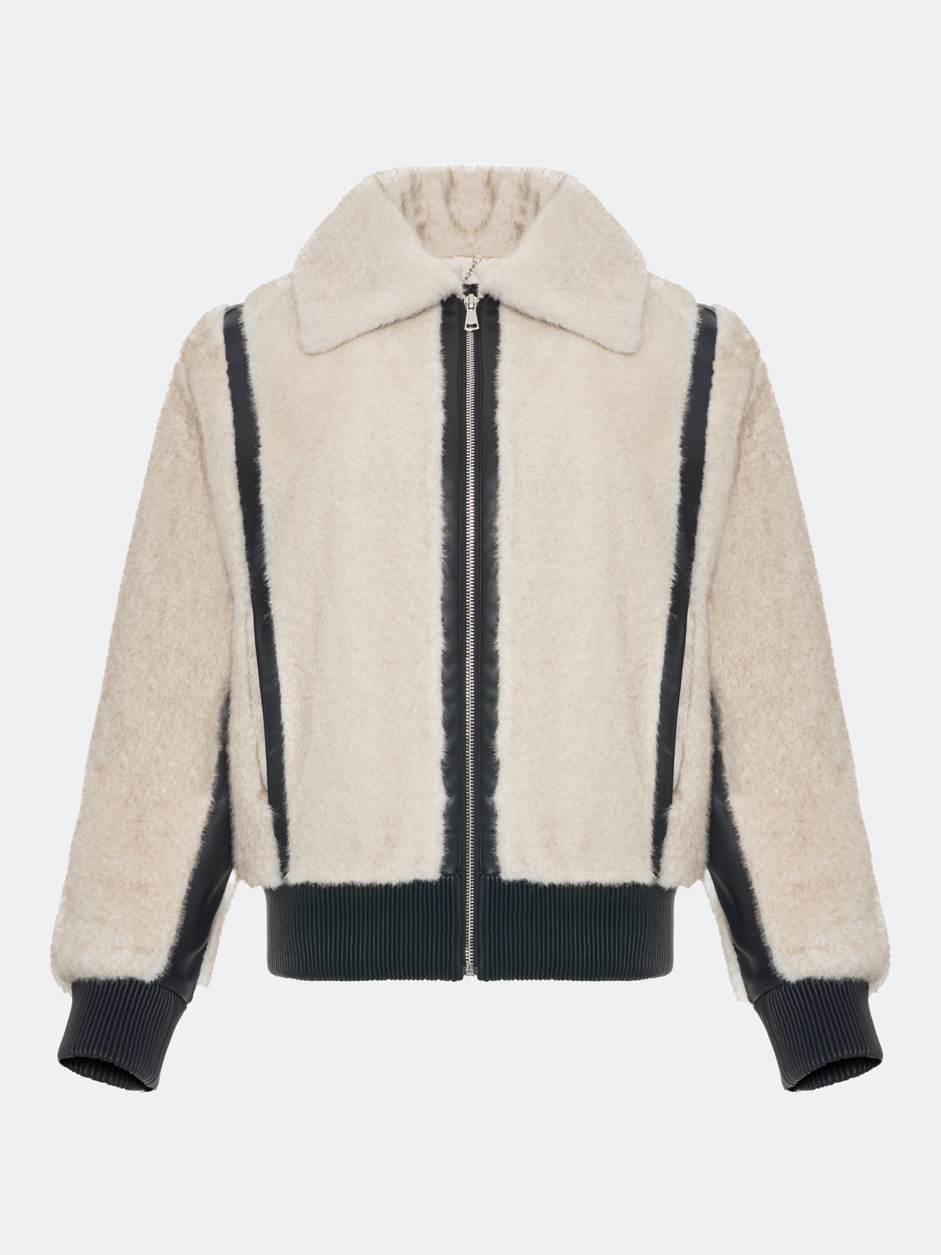 Укороченная куртка из искусственного меха. Прямой силуэт. Застежка на молнию. Отложной воротник из искусственного меха. Контрастные эластичные манжеты из экокожи по низу рукавов и изделия. Декоративные детали из контрастной экокожи.