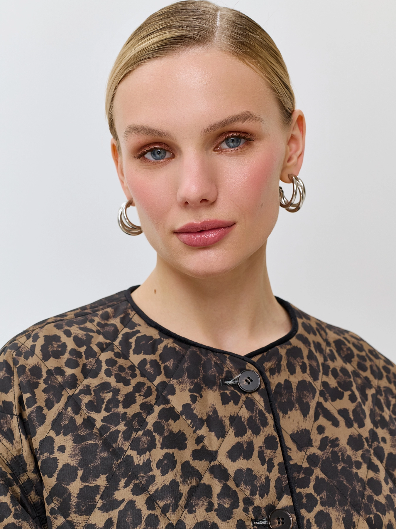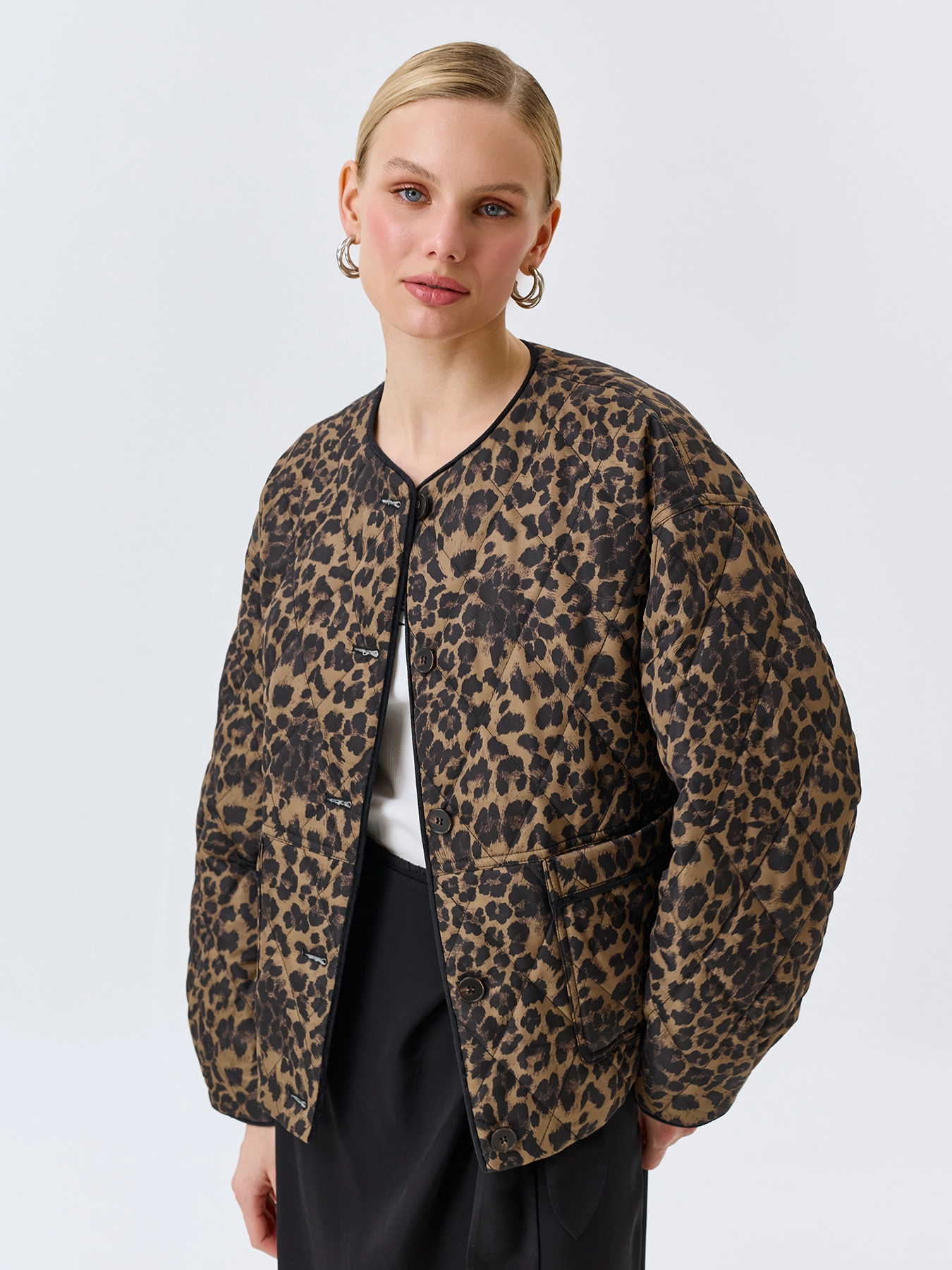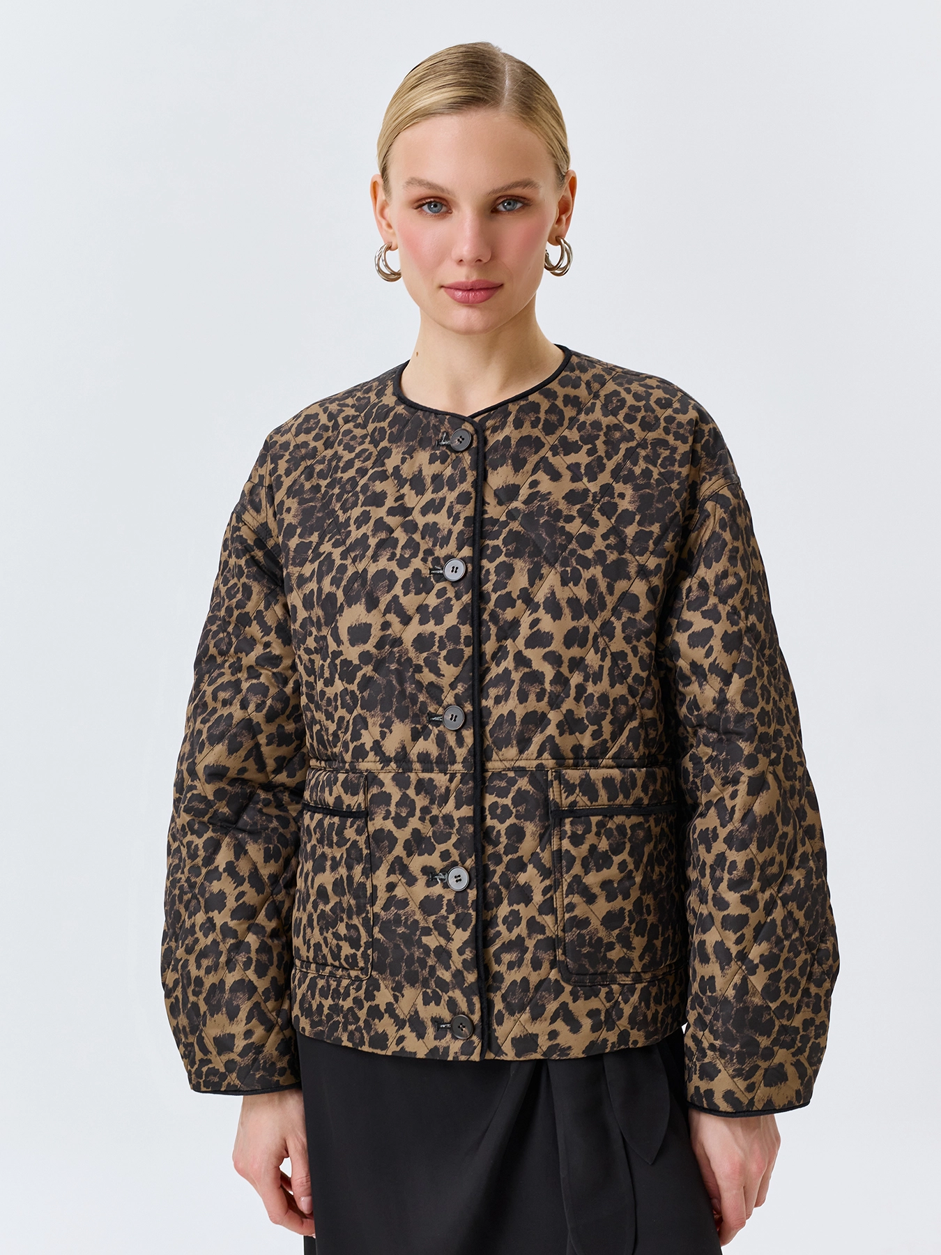 Легкая утепленная куртка с анималистичным принтом. Свободный силуэт. Круглый вырез. Спущенная линия плеч. Застежка на пуговицы. Накладные боковые карманы. Дополнена велюровым кантом по горловине, планке и низу рукавов.
