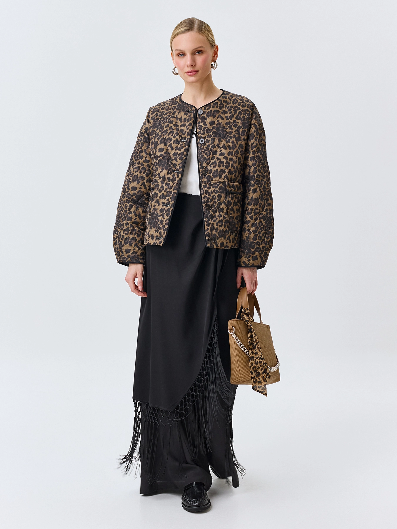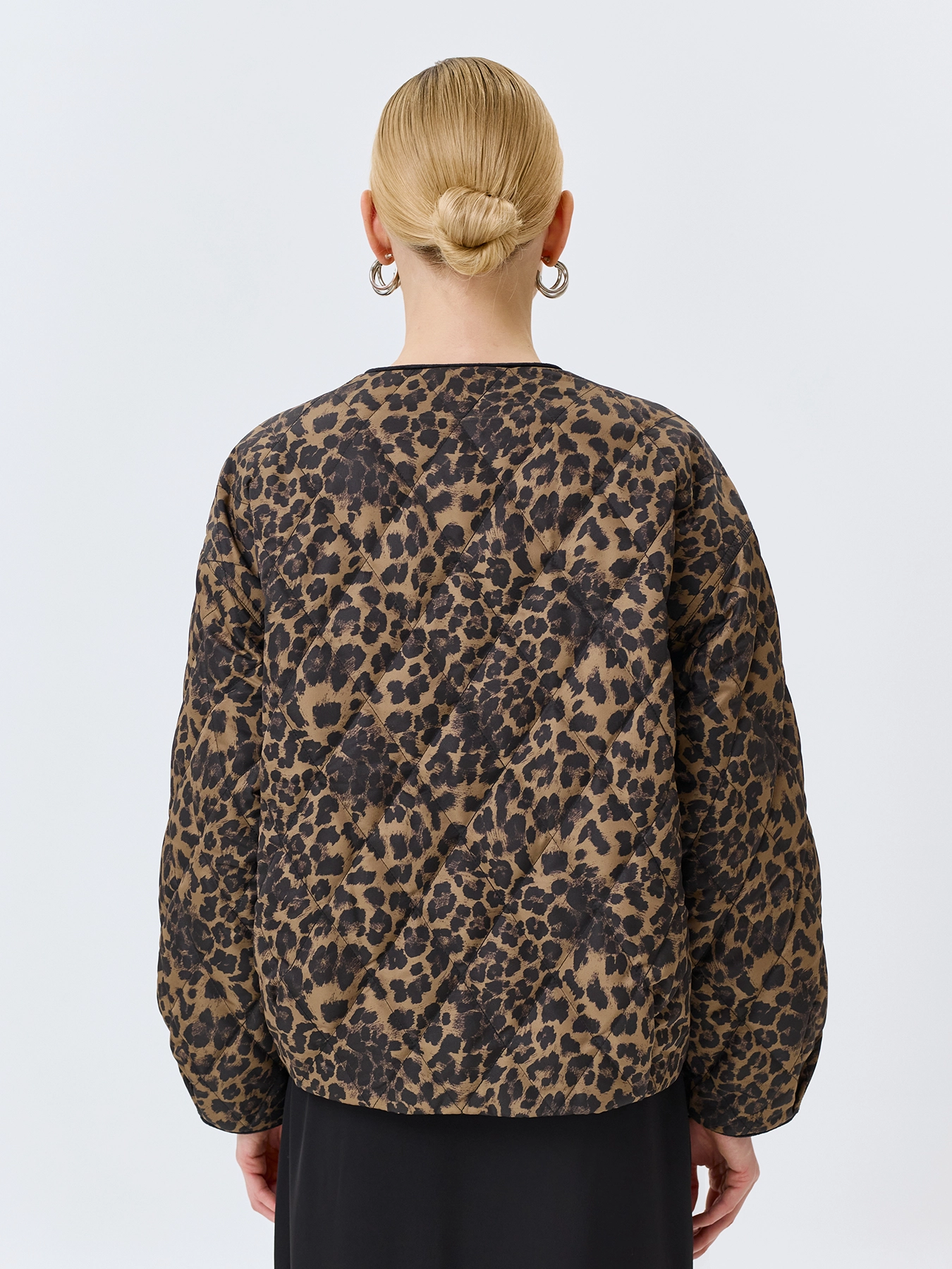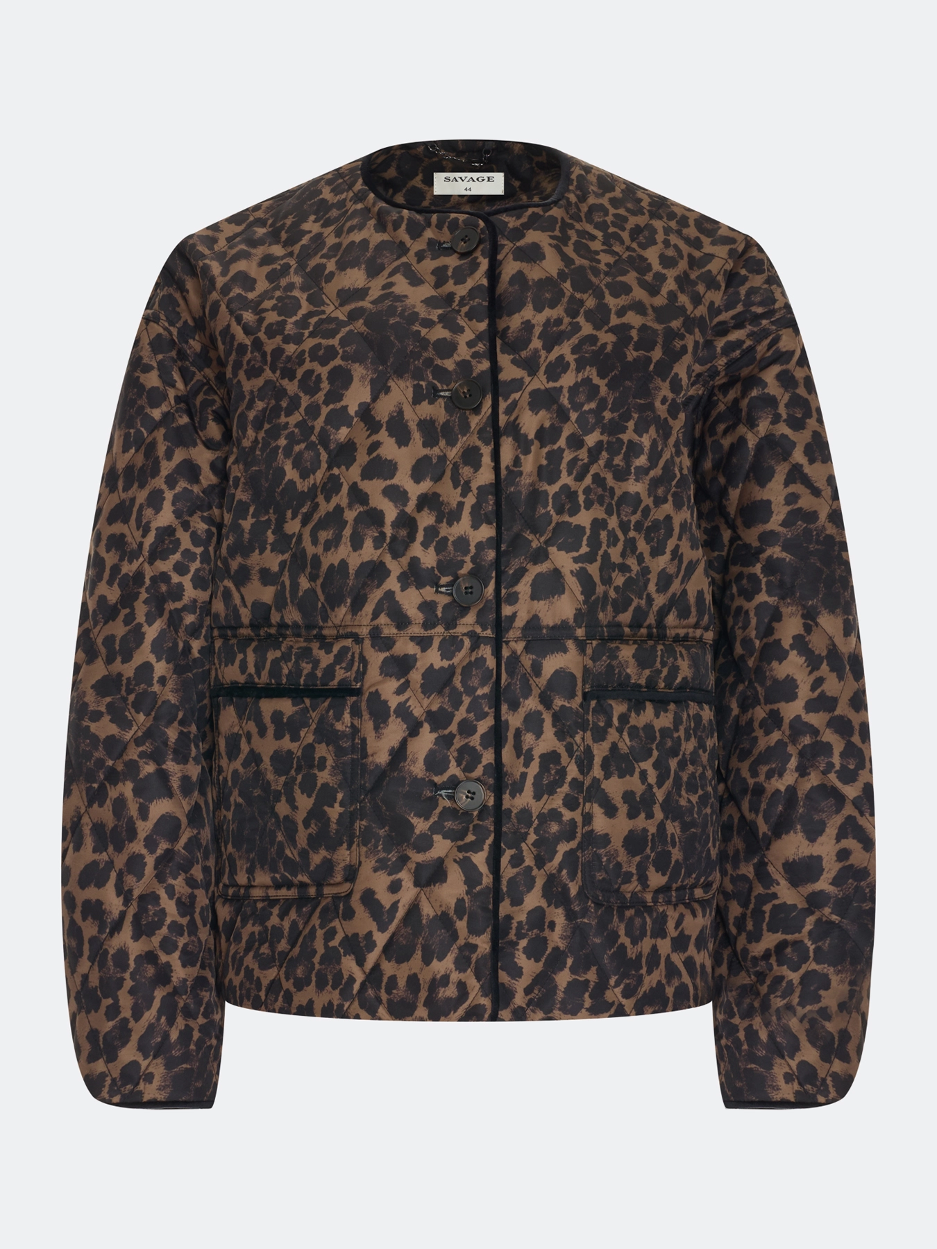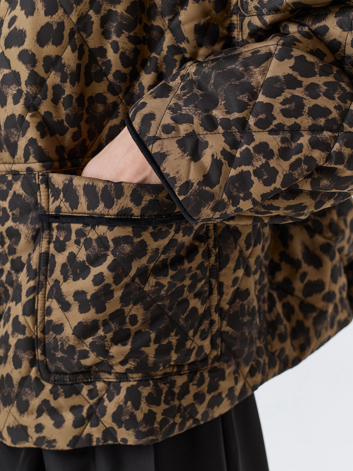 Легкая утепленная куртка с анималистичным принтом. Свободный силуэт. Круглый вырез. Спущенная линия плеч. Застежка на пуговицы. Накладные боковые карманы. Дополнена велюровым кантом по горловине, планке и низу рукавов.