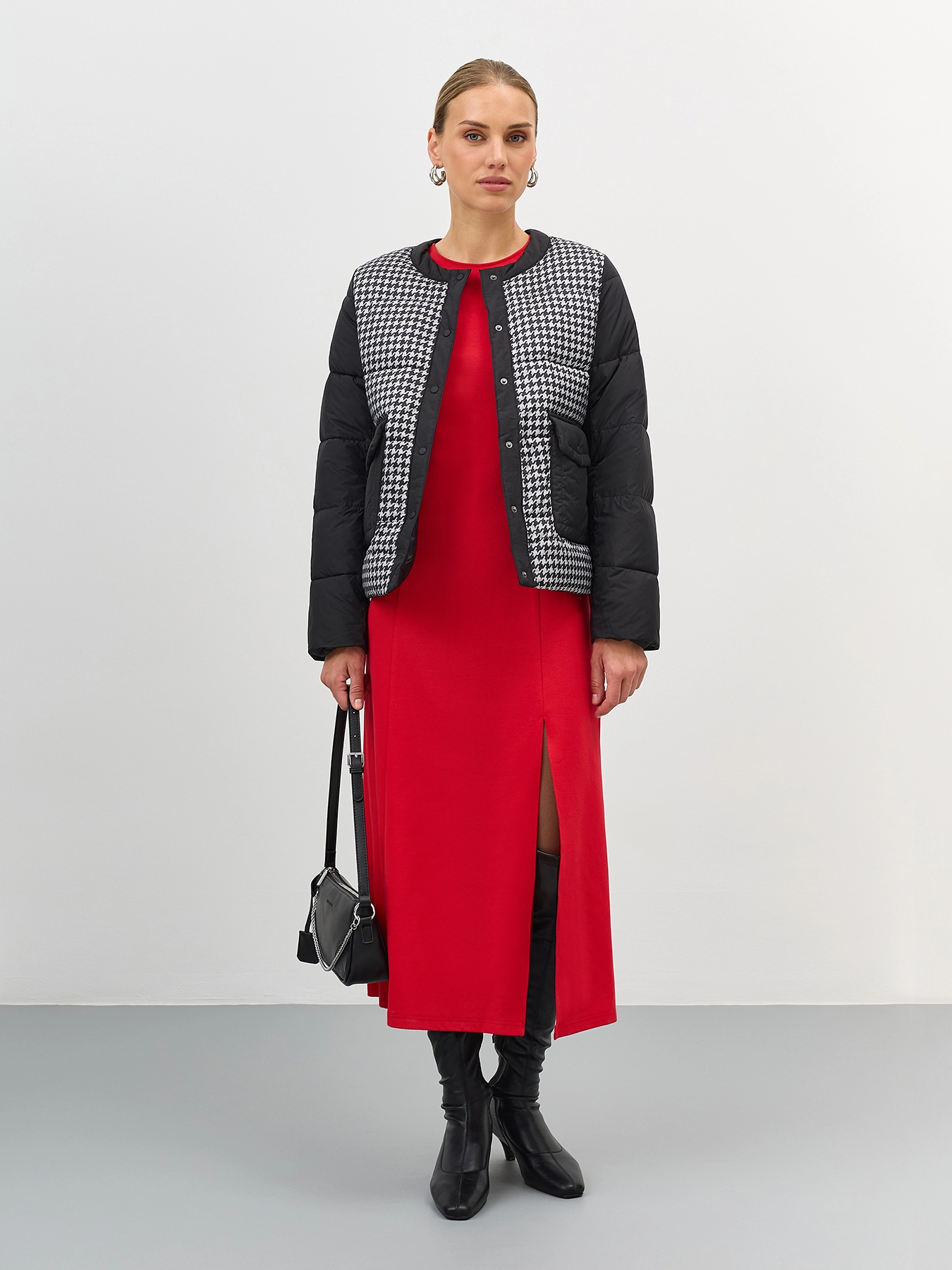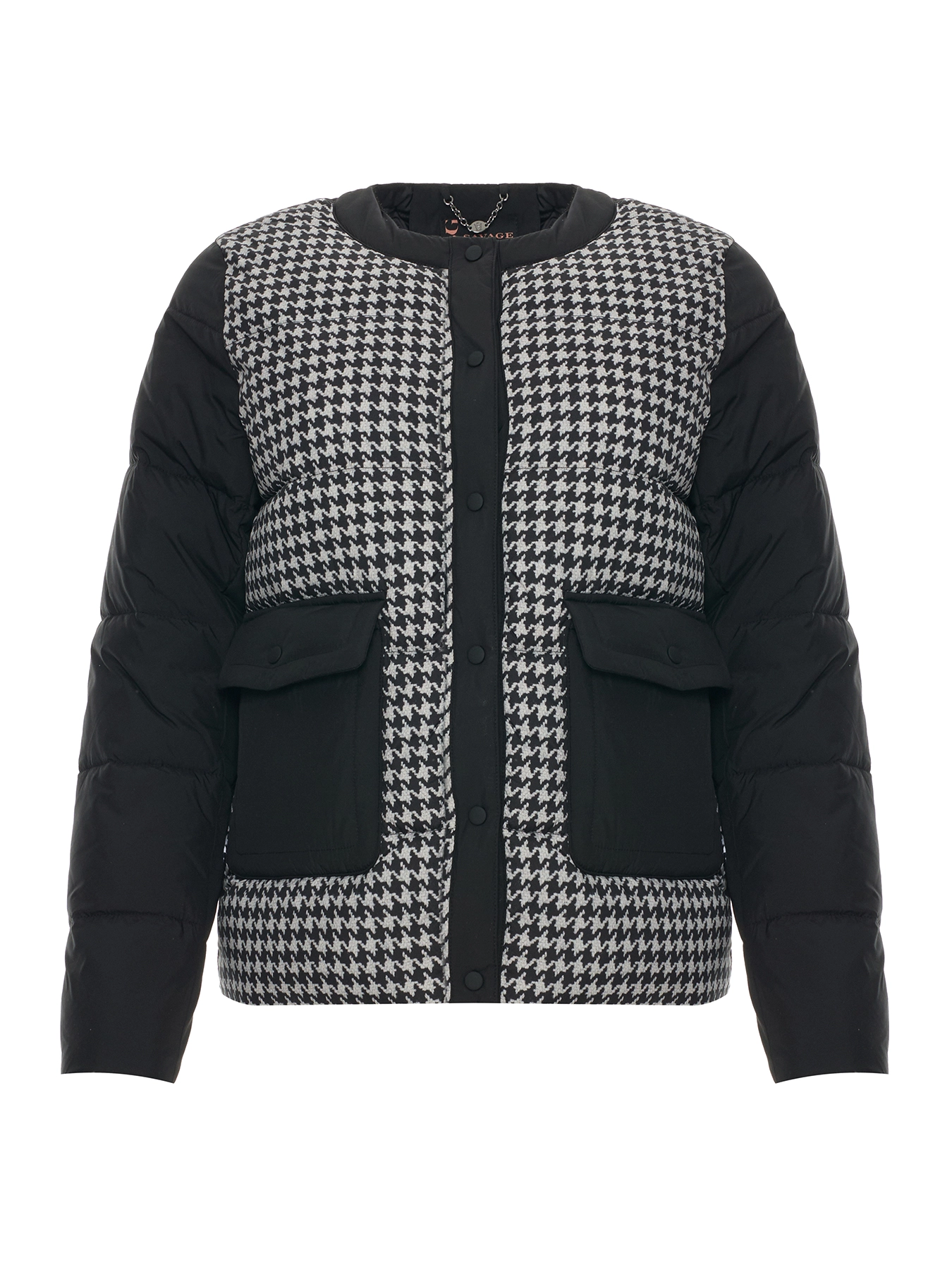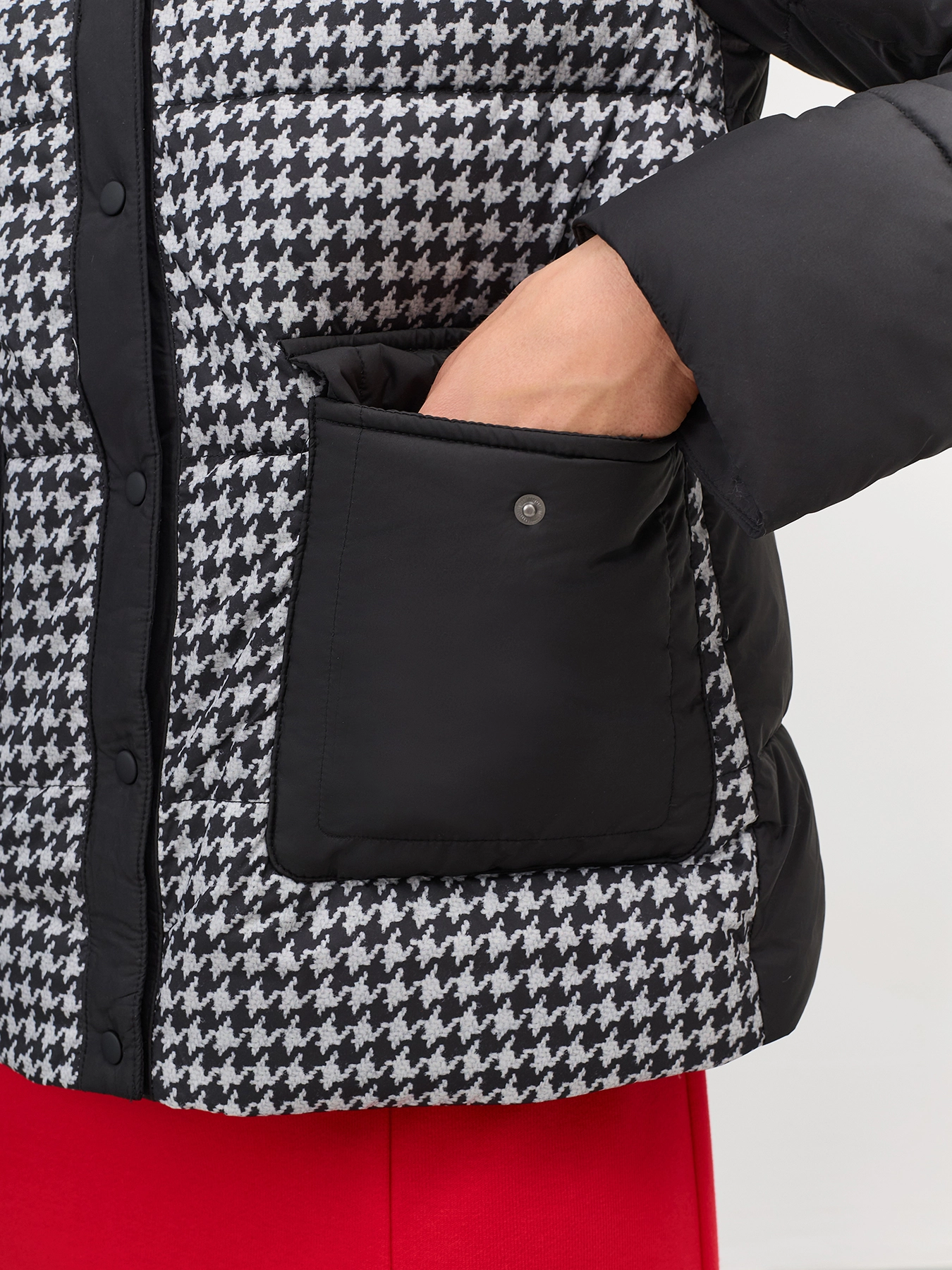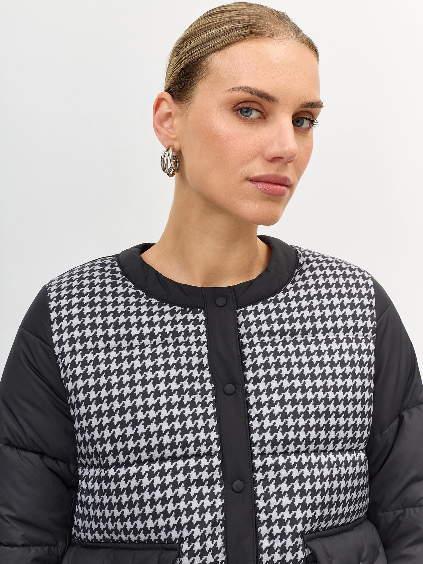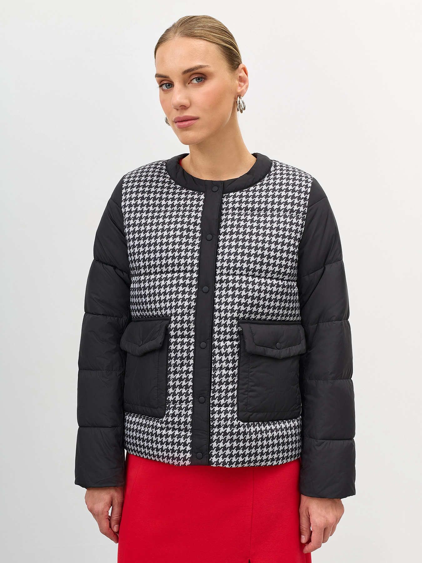 Куртка с принтом ''гусиная лапка" и контрастными деталями. Свободный силуэт. Круглый вырез. Контрастные накладные карманы с клапанами, планка и рукава. Застежка на кнопки.