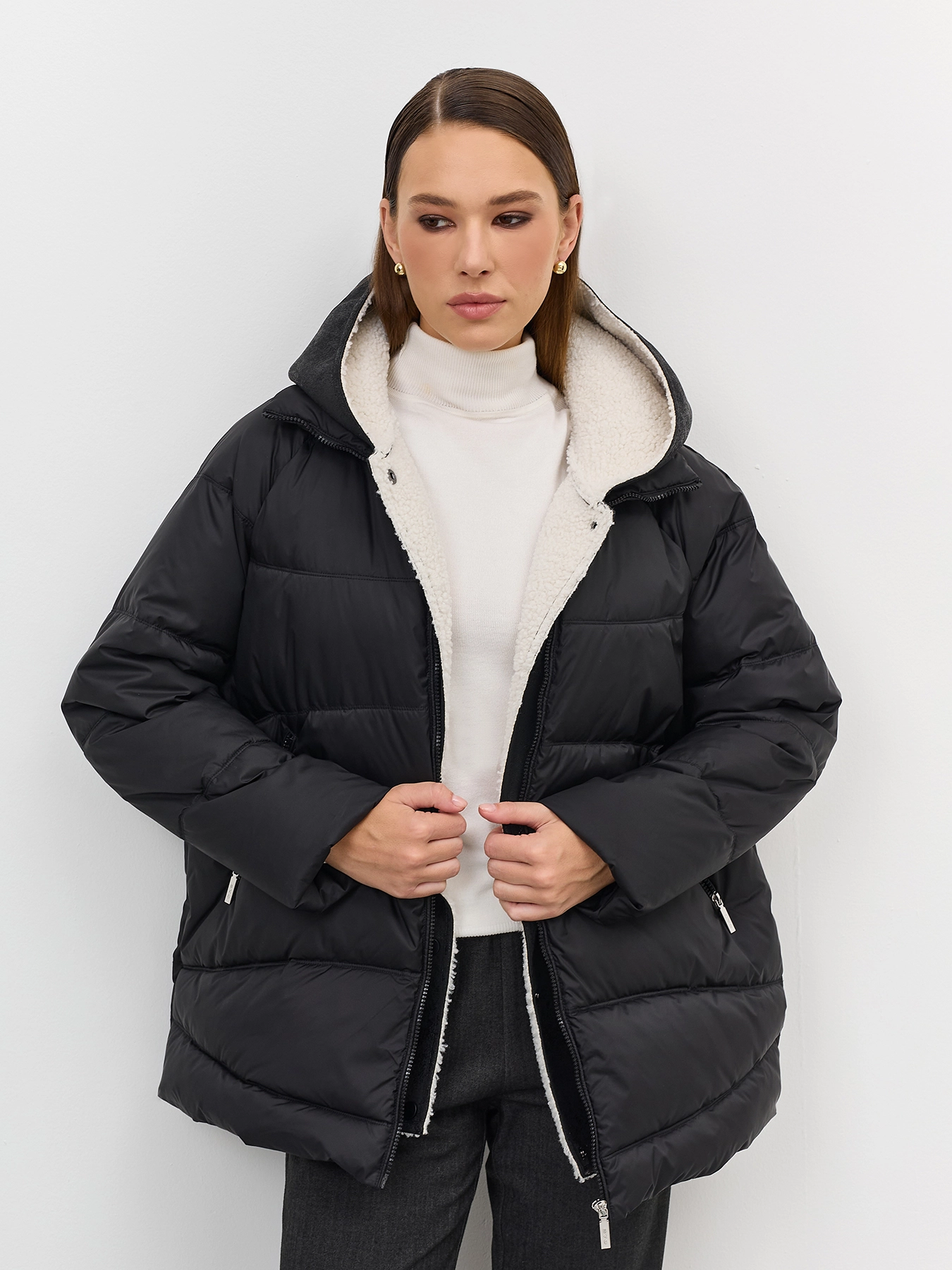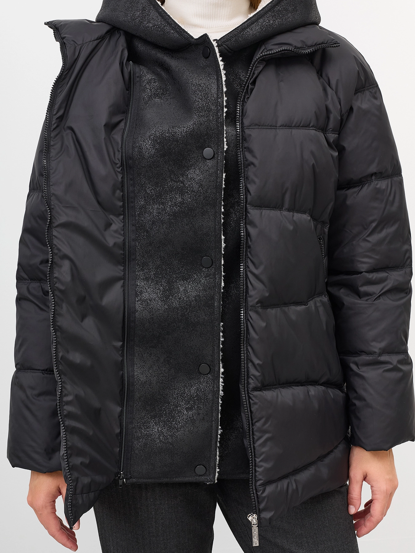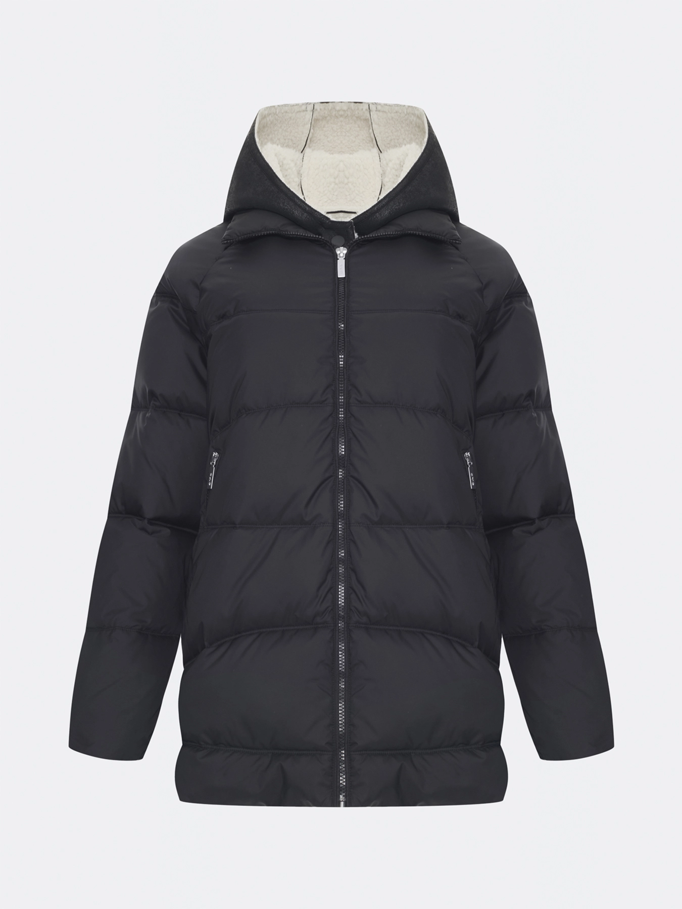 Удлиненная стеганная куртка. Свободный силуэт немного расширен к низу. Спущенная линия плеч. Боковые разрезы на потайных молниях. Застежка на молнию. Завышенные боковые карманы на молнии. Воротник стойка меняется на отложной воротник. Дополнена съемной манишкой из мягкой искуственной овчины на кнопках с капюшоном.