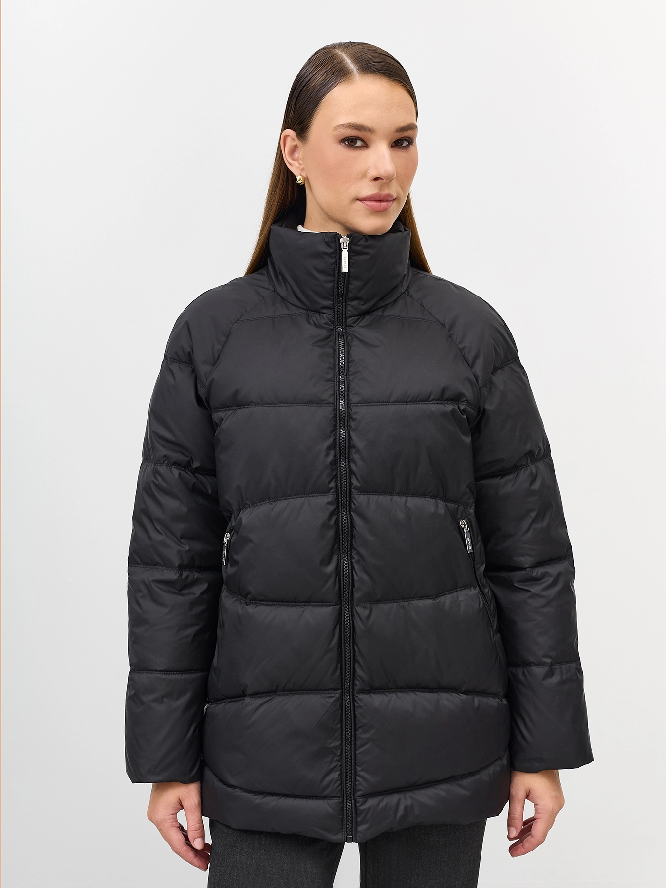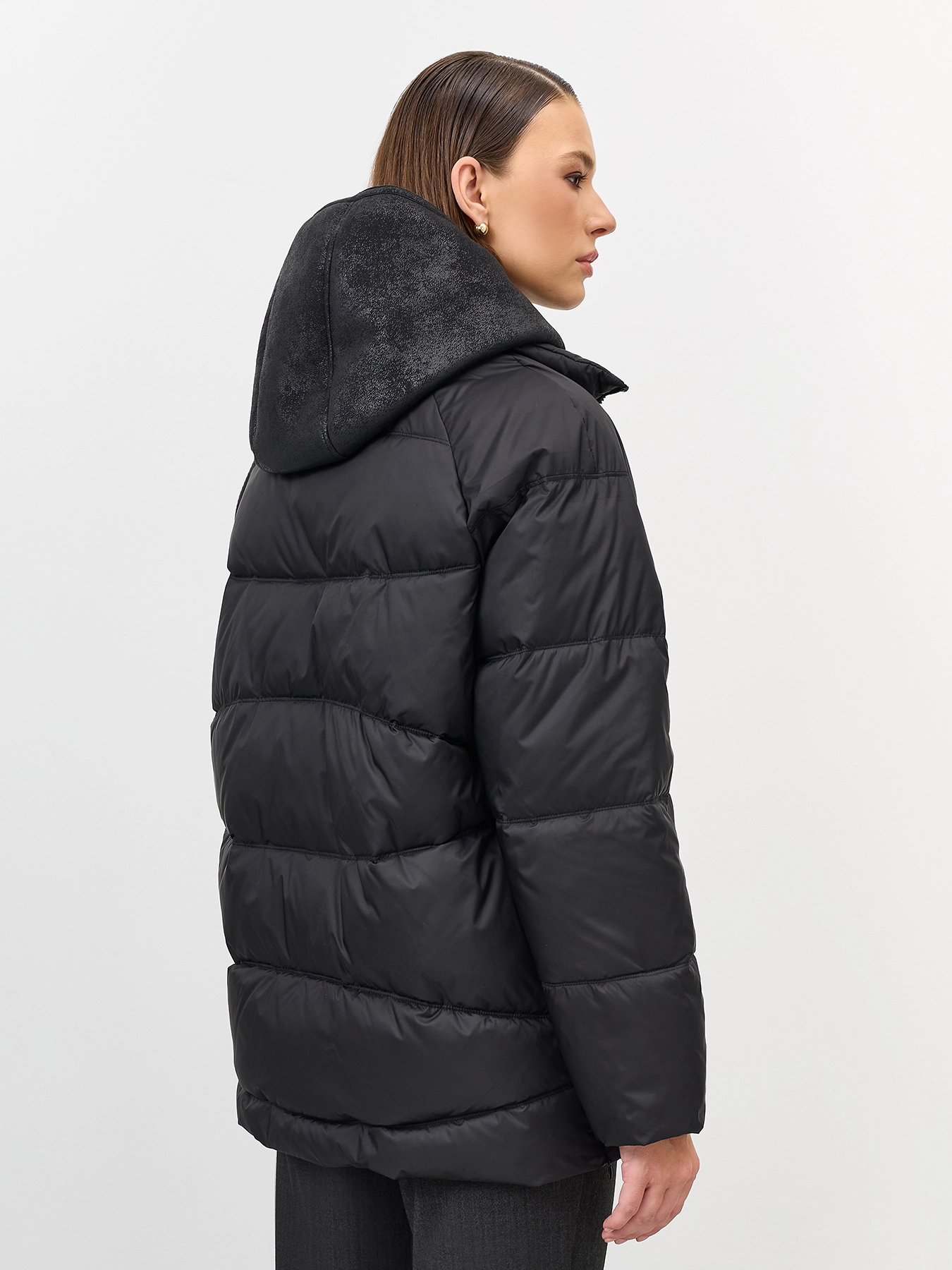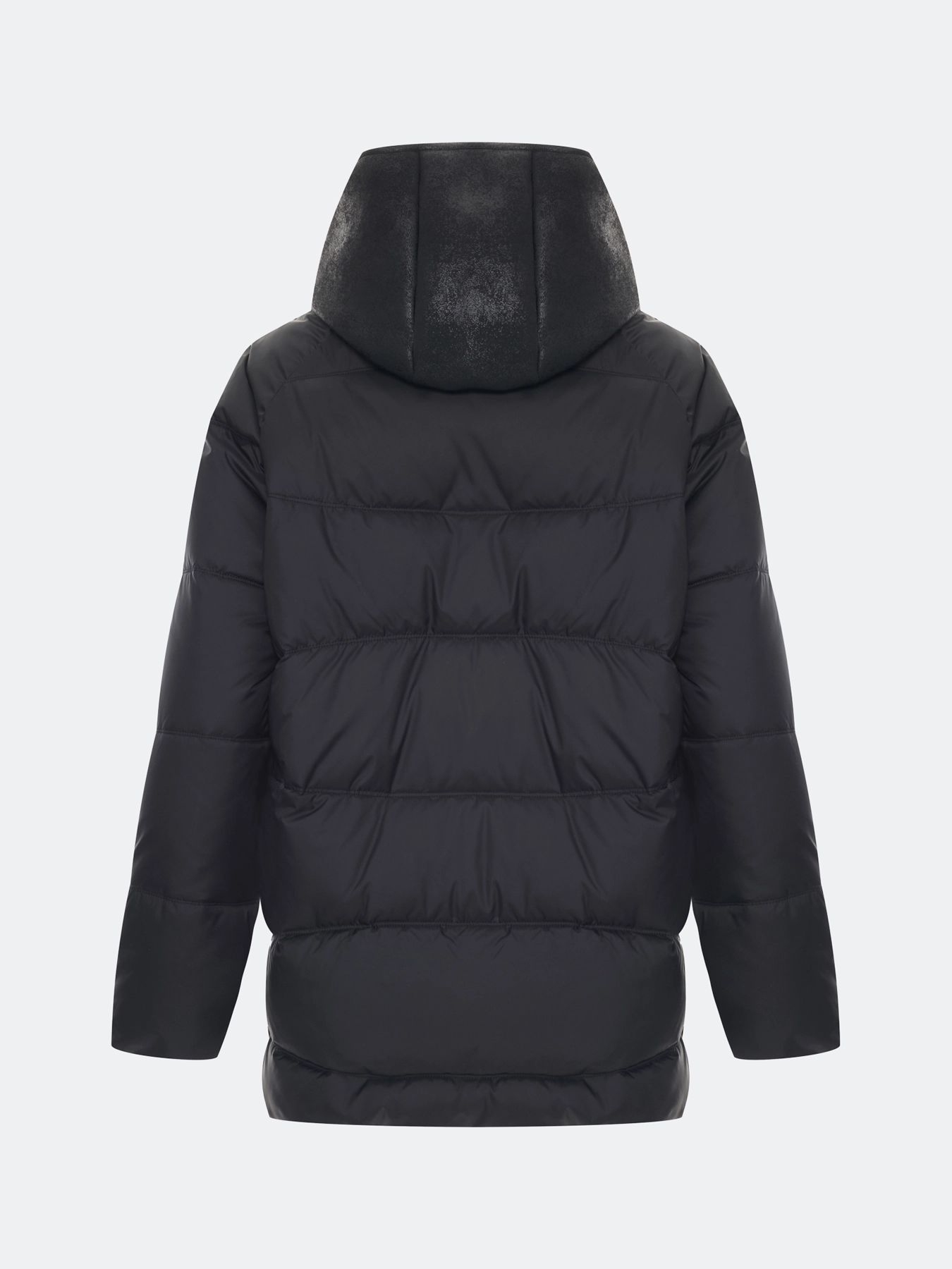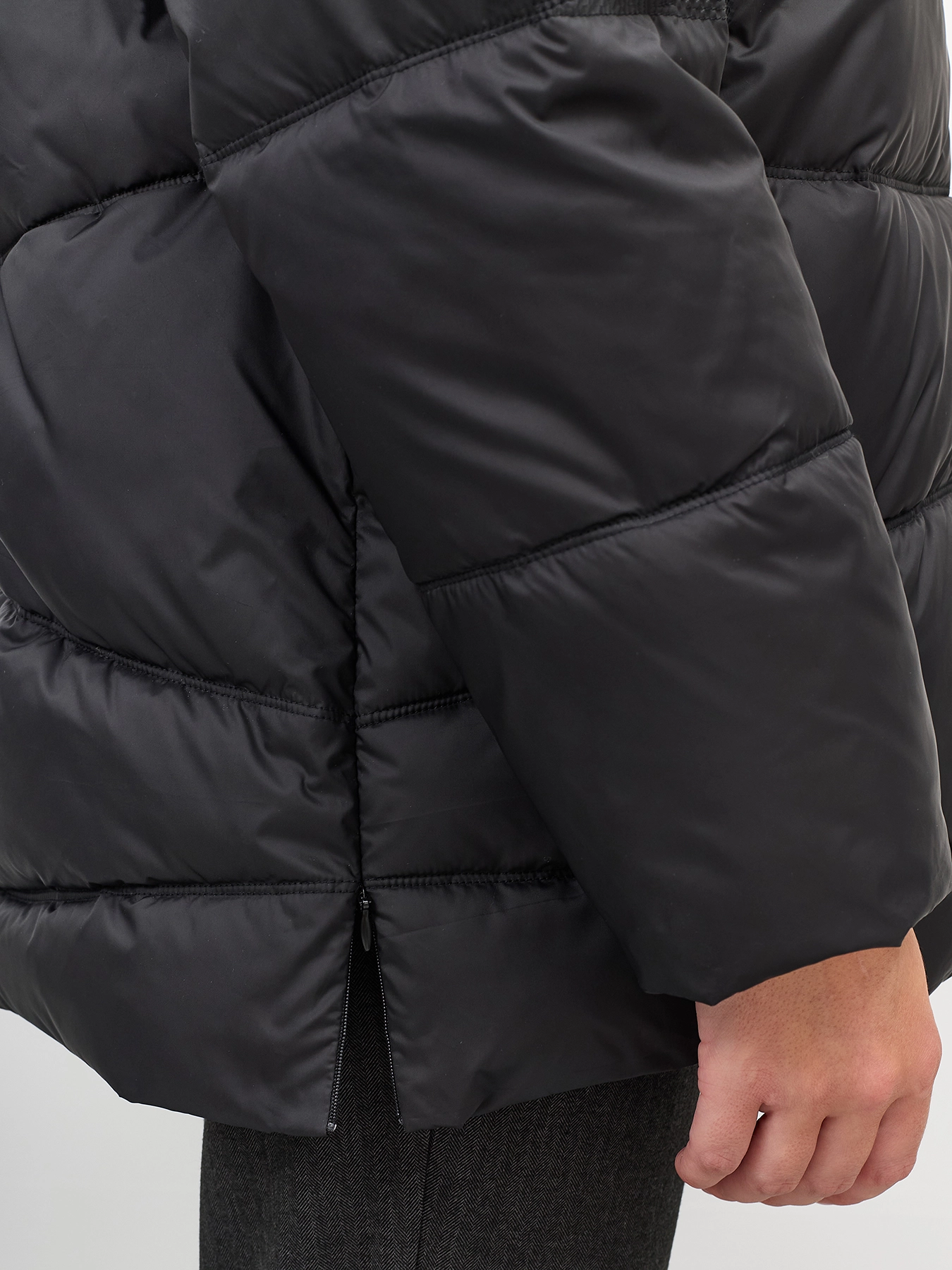 Удлиненная стеганная куртка. Свободный силуэт немного расширен к низу. Спущенная линия плеч. Боковые разрезы на потайных молниях. Застежка на молнию. Завышенные боковые карманы на молнии. Воротник стойка меняется на отложной воротник. Дополнена съемной манишкой из мягкой искуственной овчины на кнопках с капюшоном.