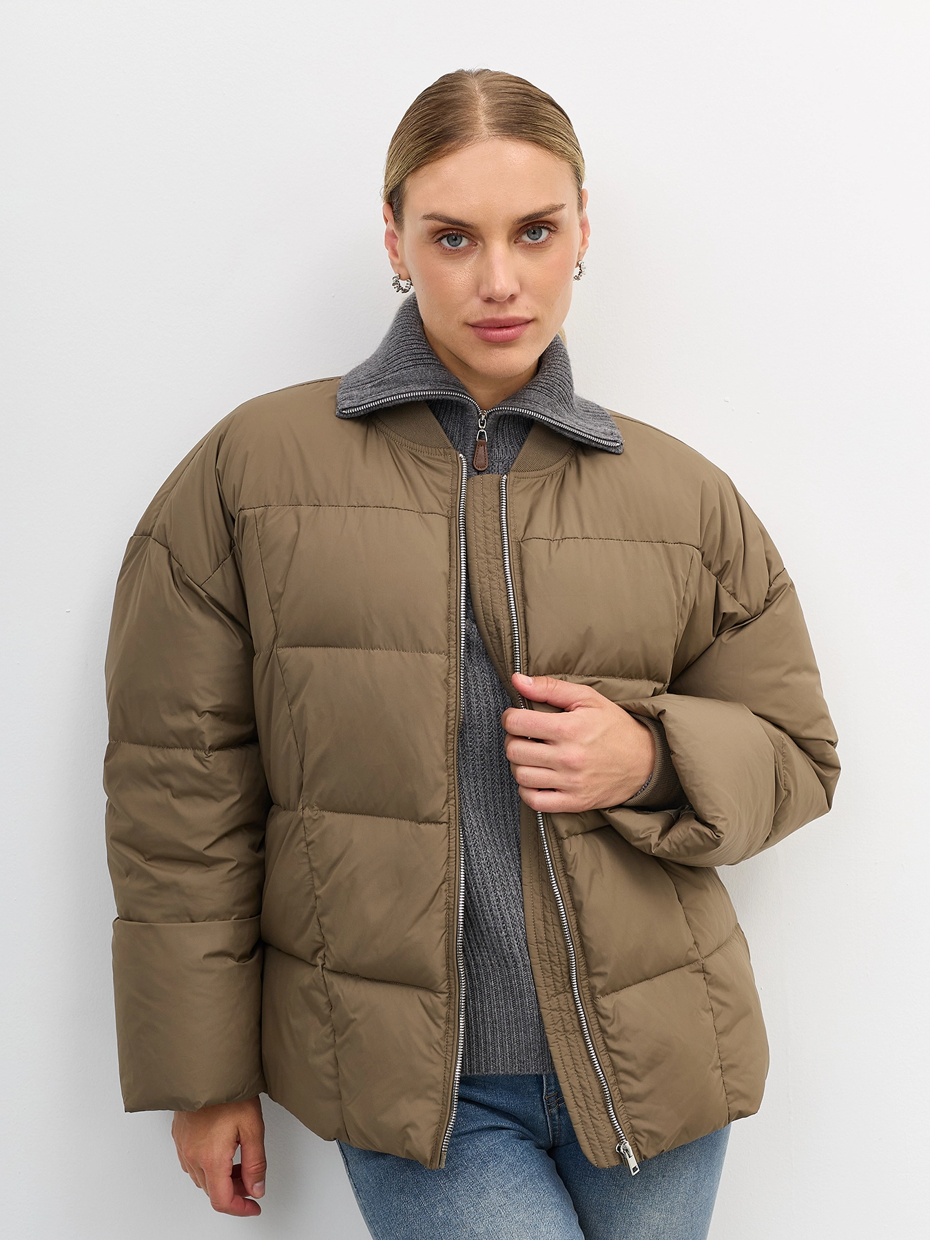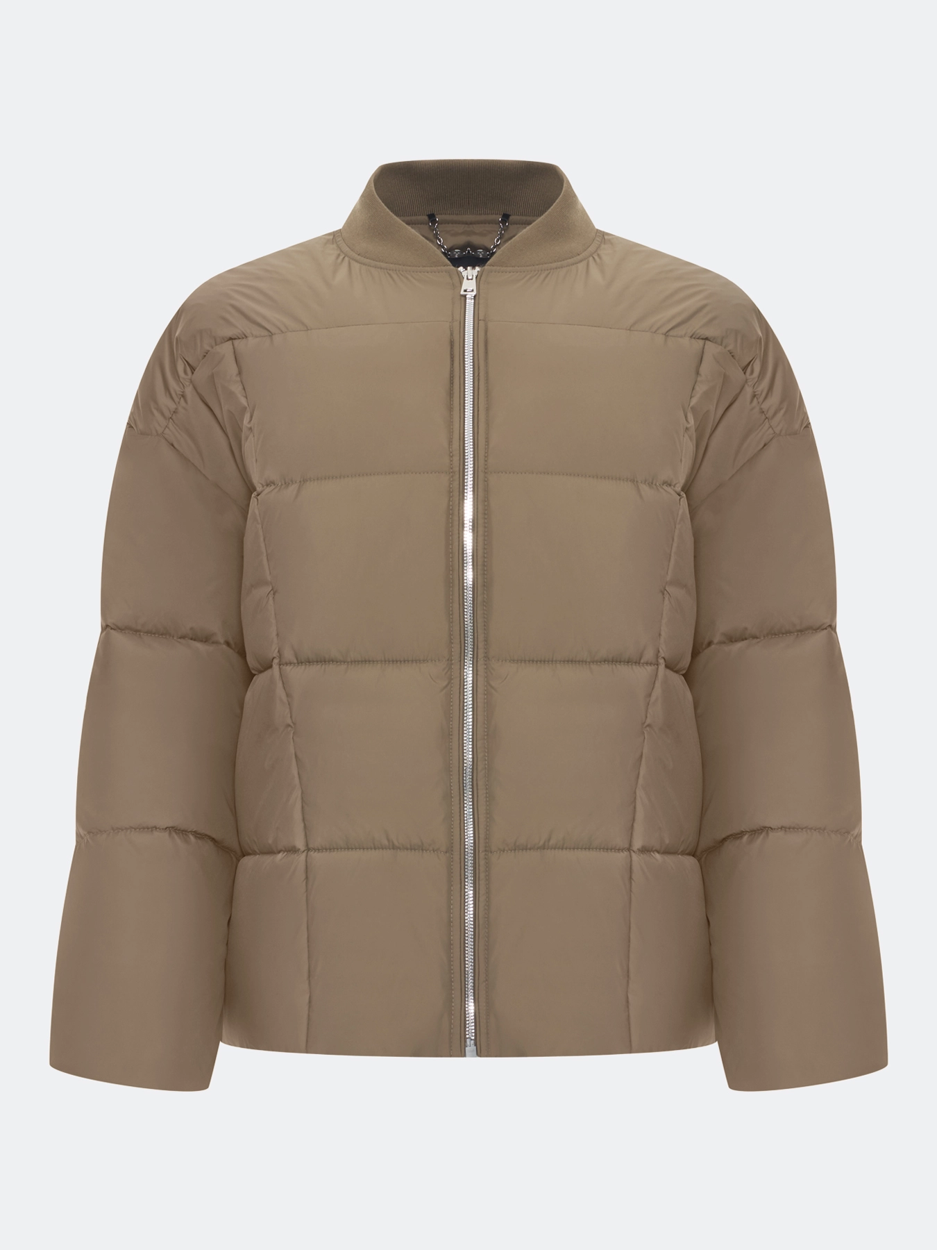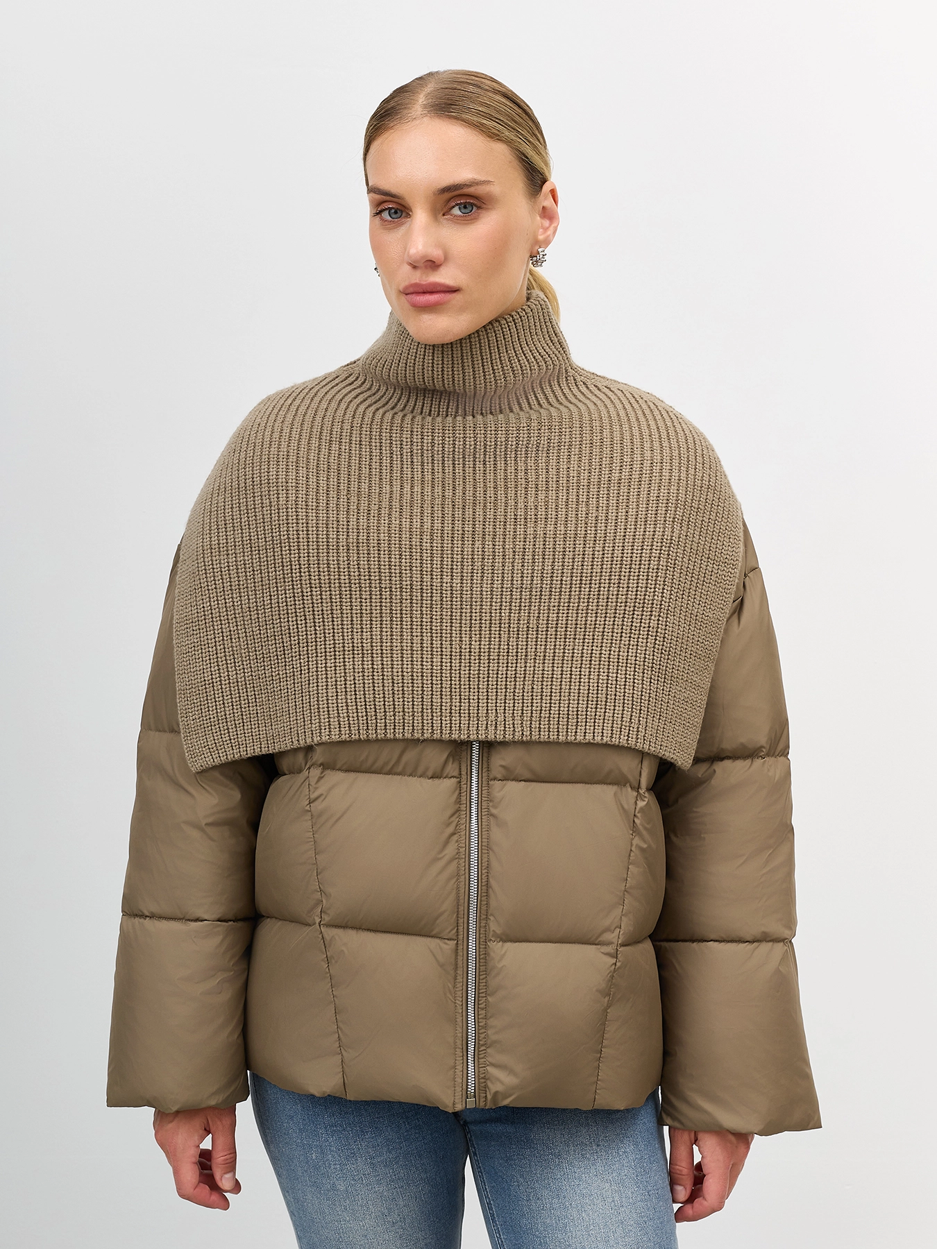 Утепленная куртка со съемной трикотажной манишкой в цвет. Квадратная стежка. Свободный силуэт. Спущенная линия плеч. Воротник небольшая стойка. Застежка на молнию. Боковые карманы на потайных молниях. Кулиса по низу изделия для защиты от ветра.