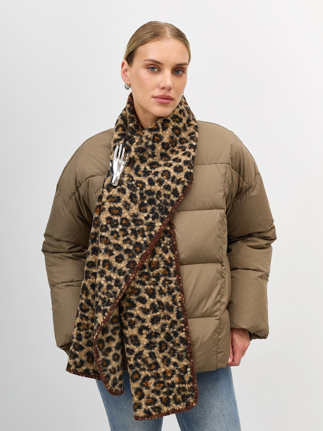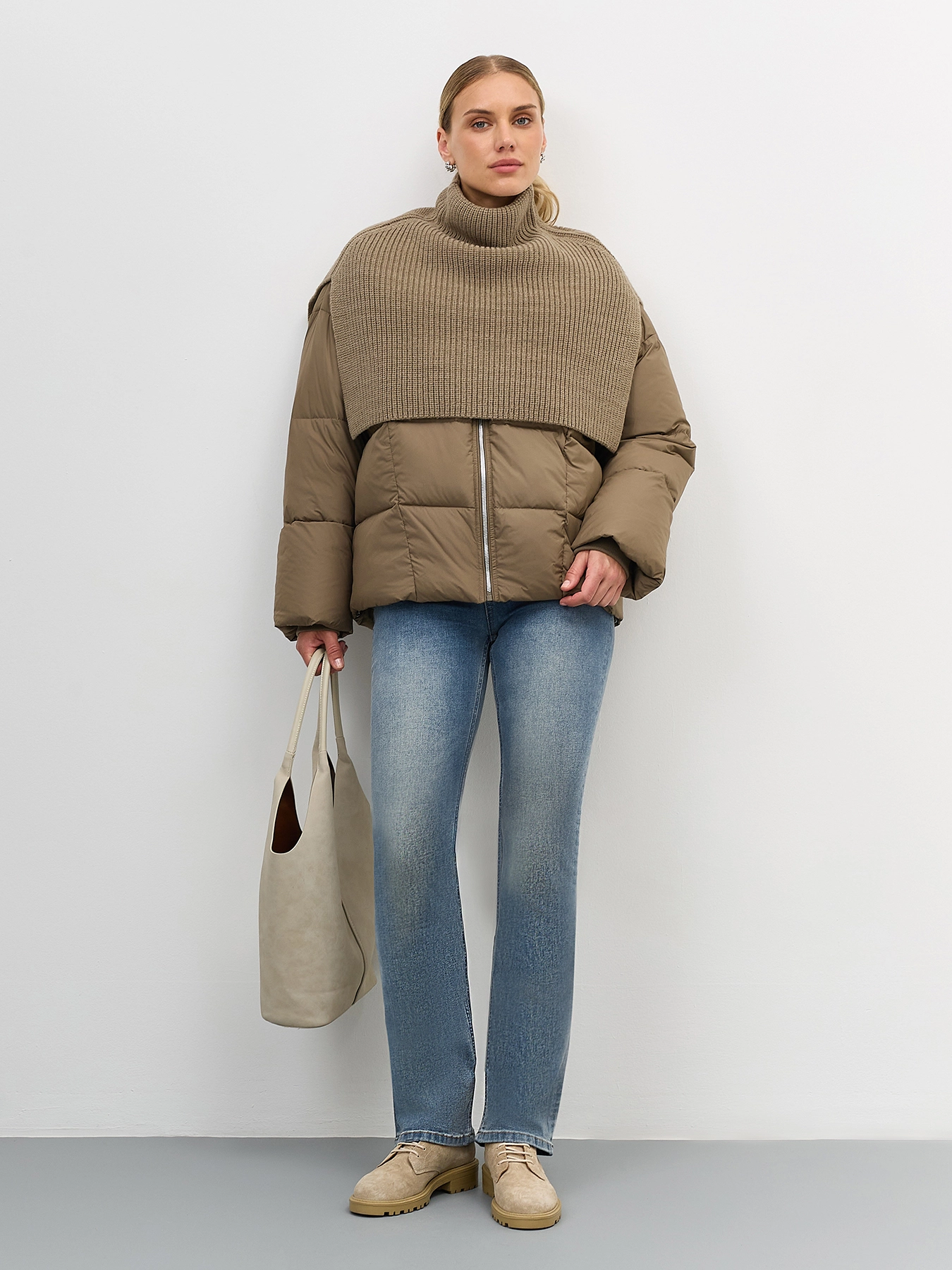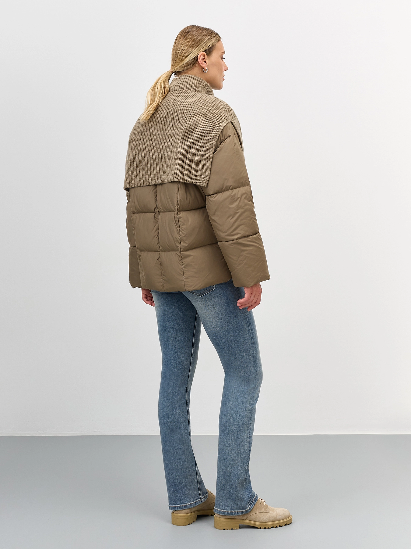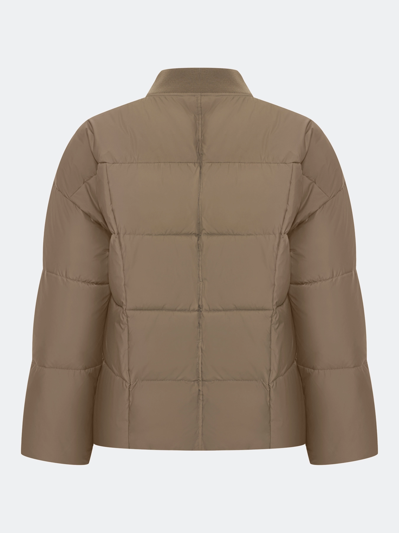 Утепленная куртка со съемной трикотажной манишкой в цвет. Квадратная стежка. Свободный силуэт. Спущенная линия плеч. Воротник небольшая стойка. Застежка на молнию. Боковые карманы на потайных молниях. Кулиса по низу изделия для защиты от ветра.