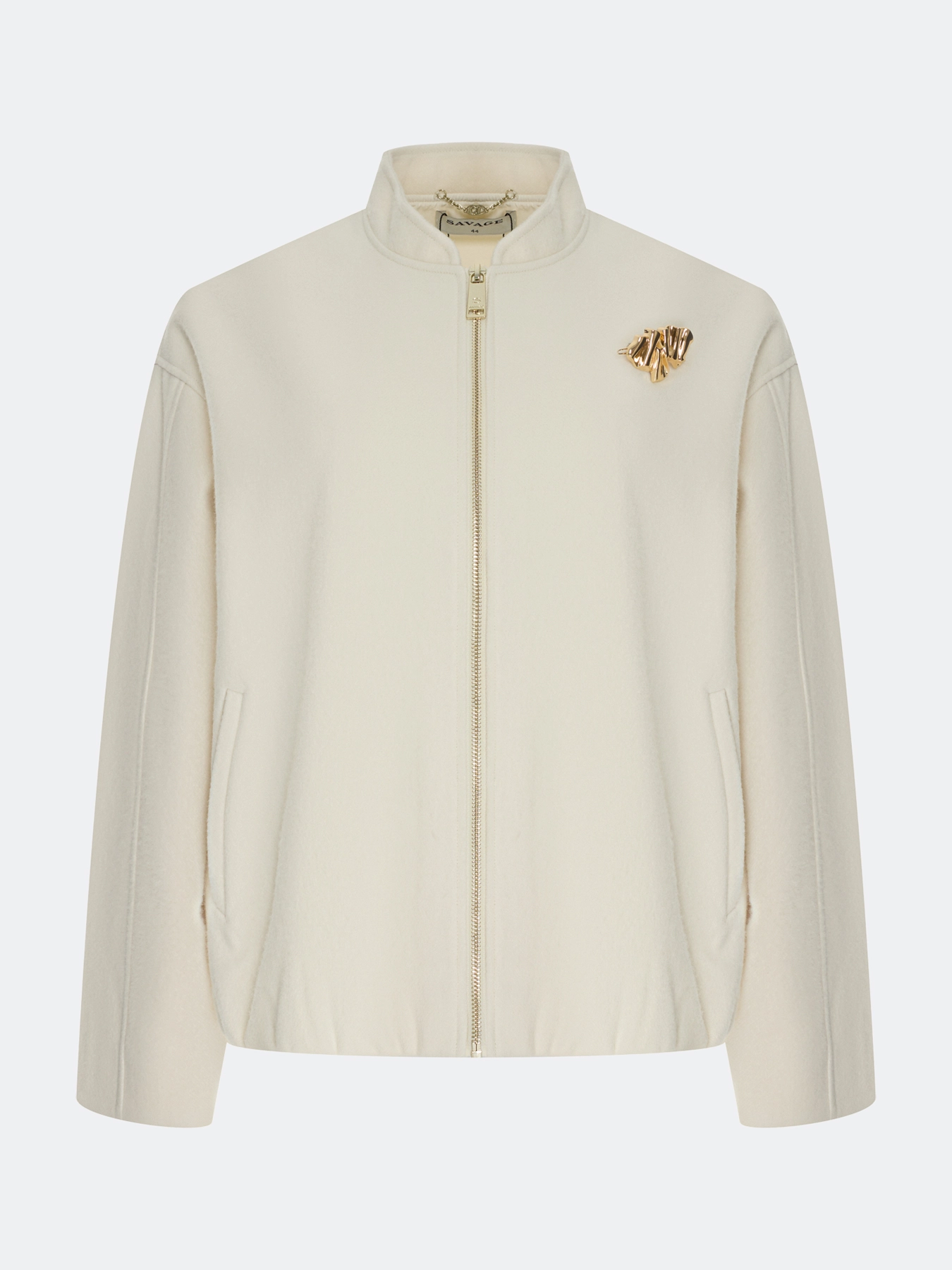 Oversize бомбер с акцентной брошью. Свободный силуэт. Воротник стойка. Застежка на молнию. Спущенная линия плеч. Дополнен резинкой по низу изделия. В составе шерсть.