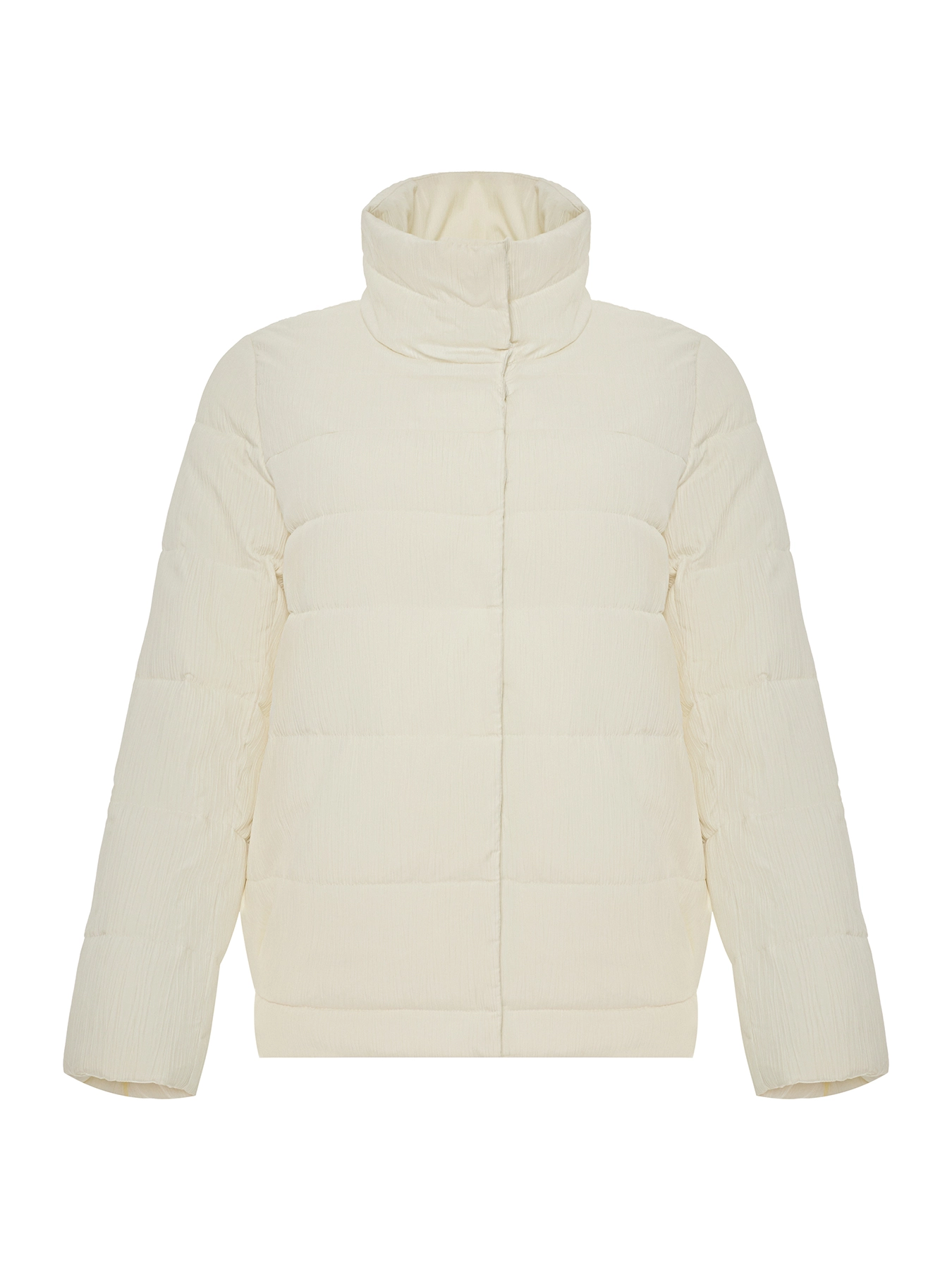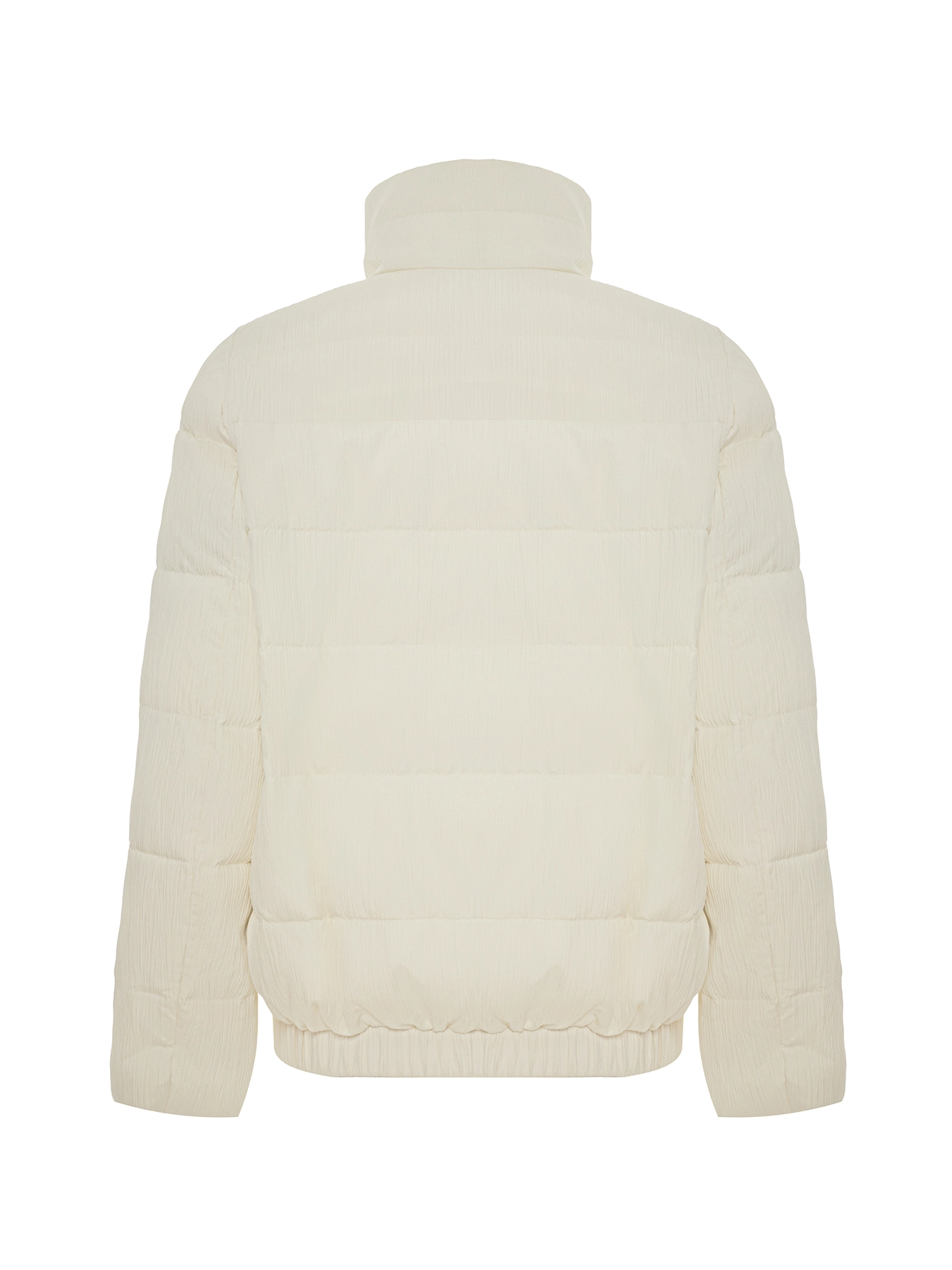 Утепленная куртка с высоким воротником стойкой. Застежка на кнопки. Втачной рукав. Резинка по спинке снизу.