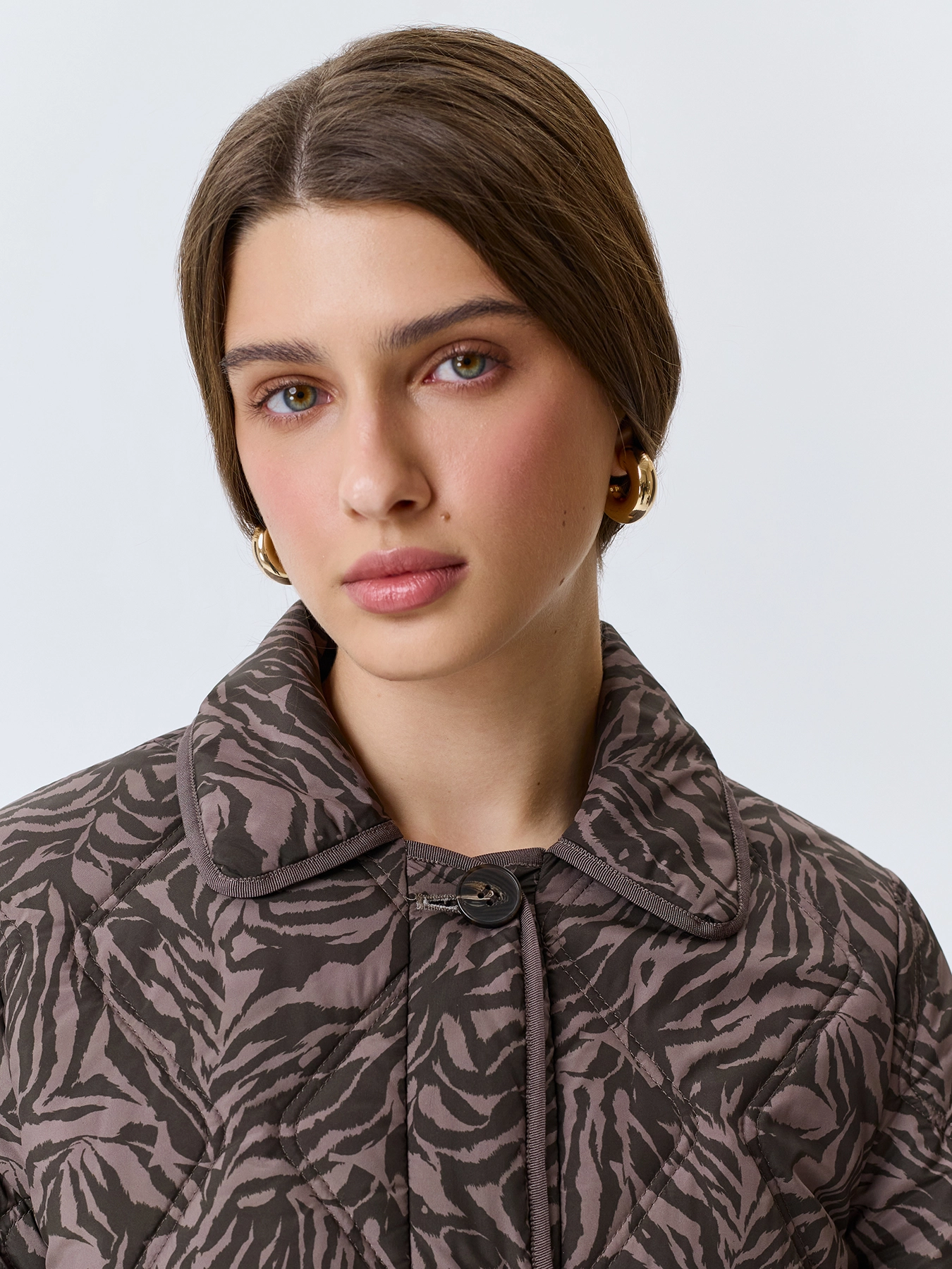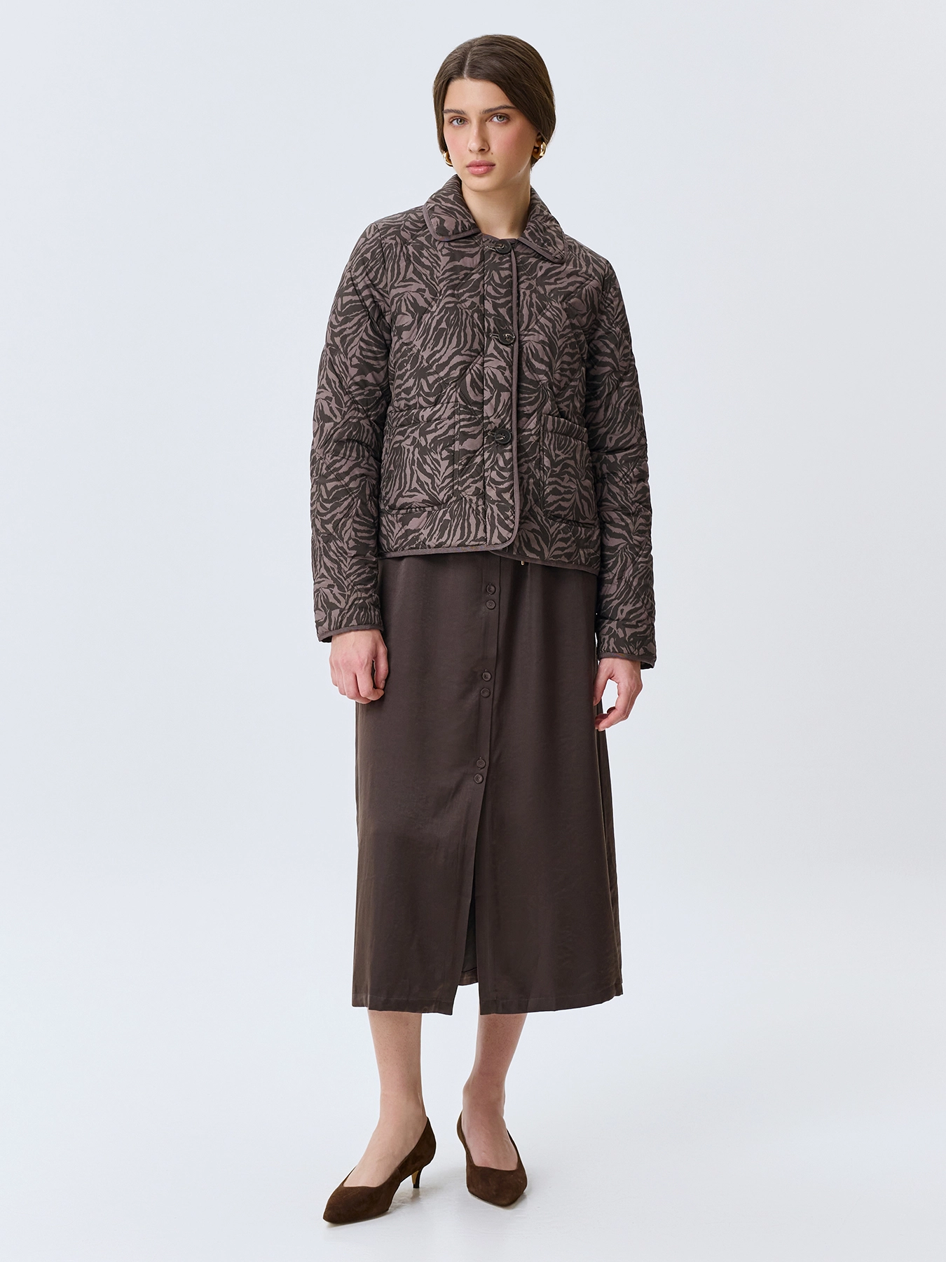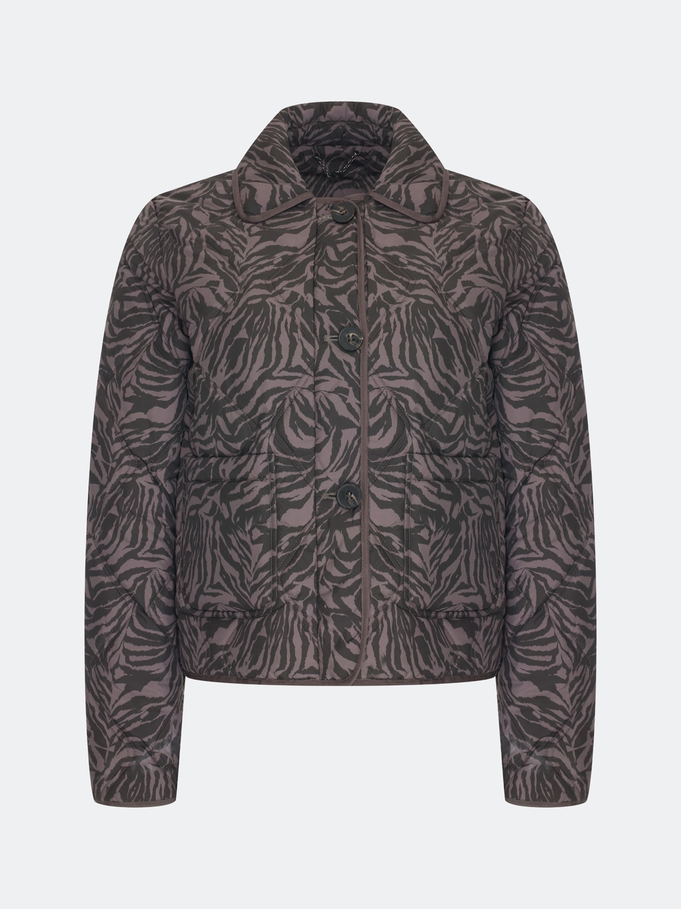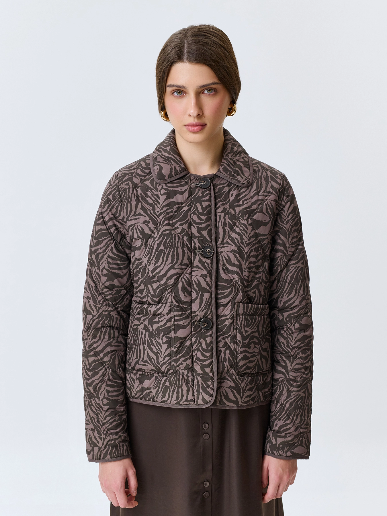 Утепленный жакет с анималистичным принтом. Прямой силуэт. Отложной воротник. Застежка на пуговицы. Накладные боковые карманы. Дополнен кантом по воротнику, низу изделия и рукавов. Искусственный утеплитель.