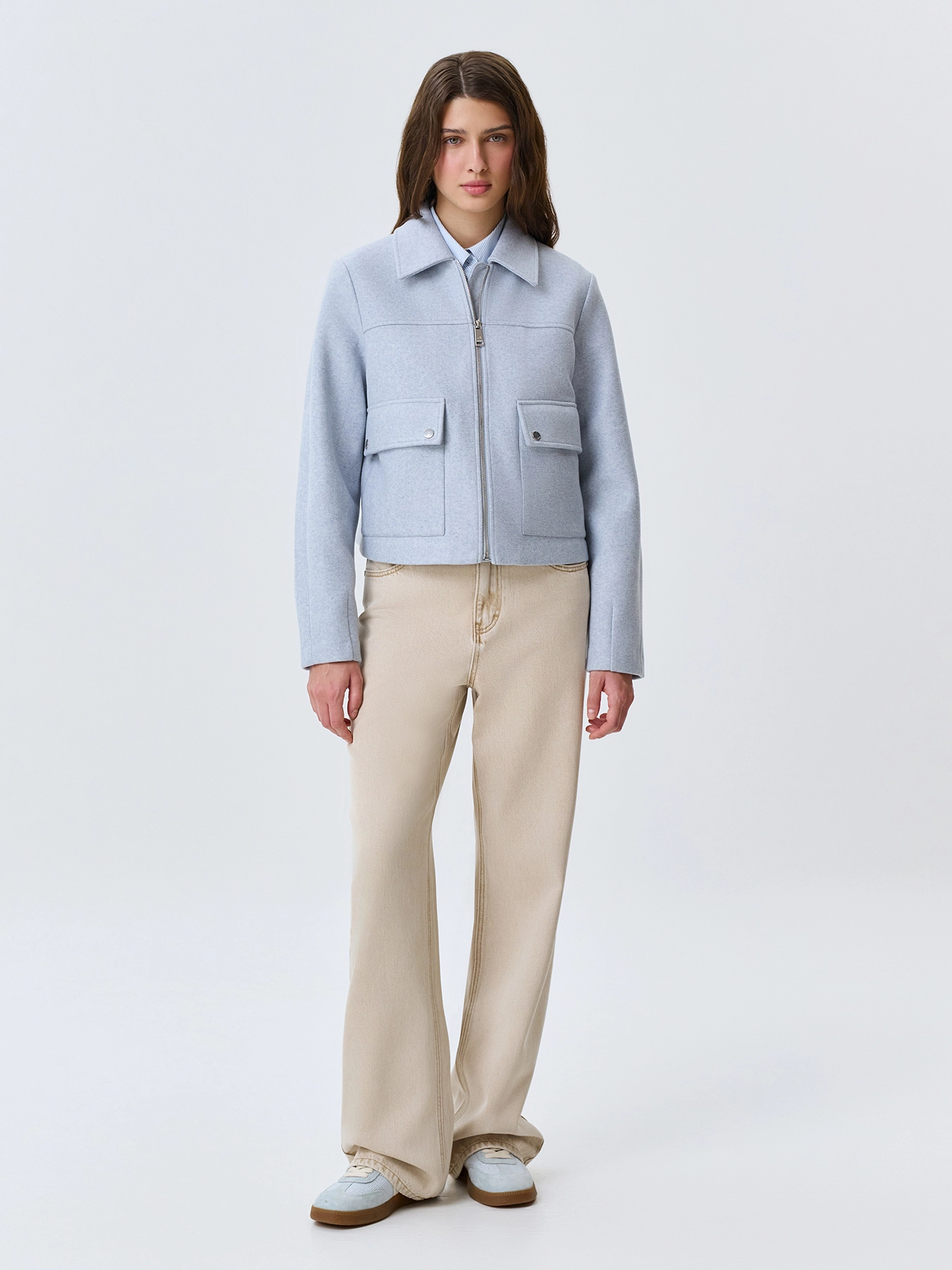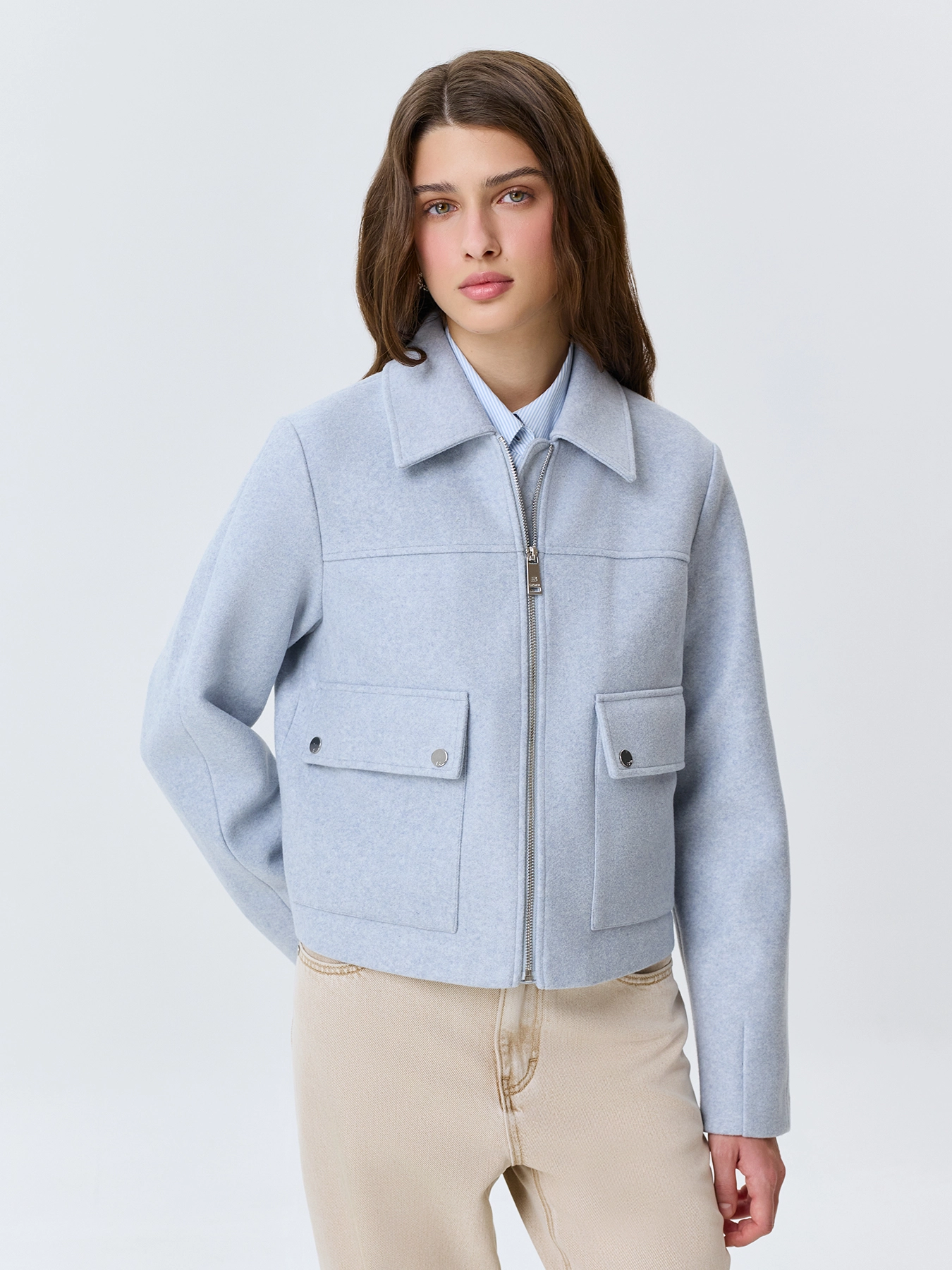 Яркий весенний жакет из текстиля. Прямой силуэт. Отложной воротник. Застежка на молнию. Накладные боковые карманы с клапанами на кнопках.