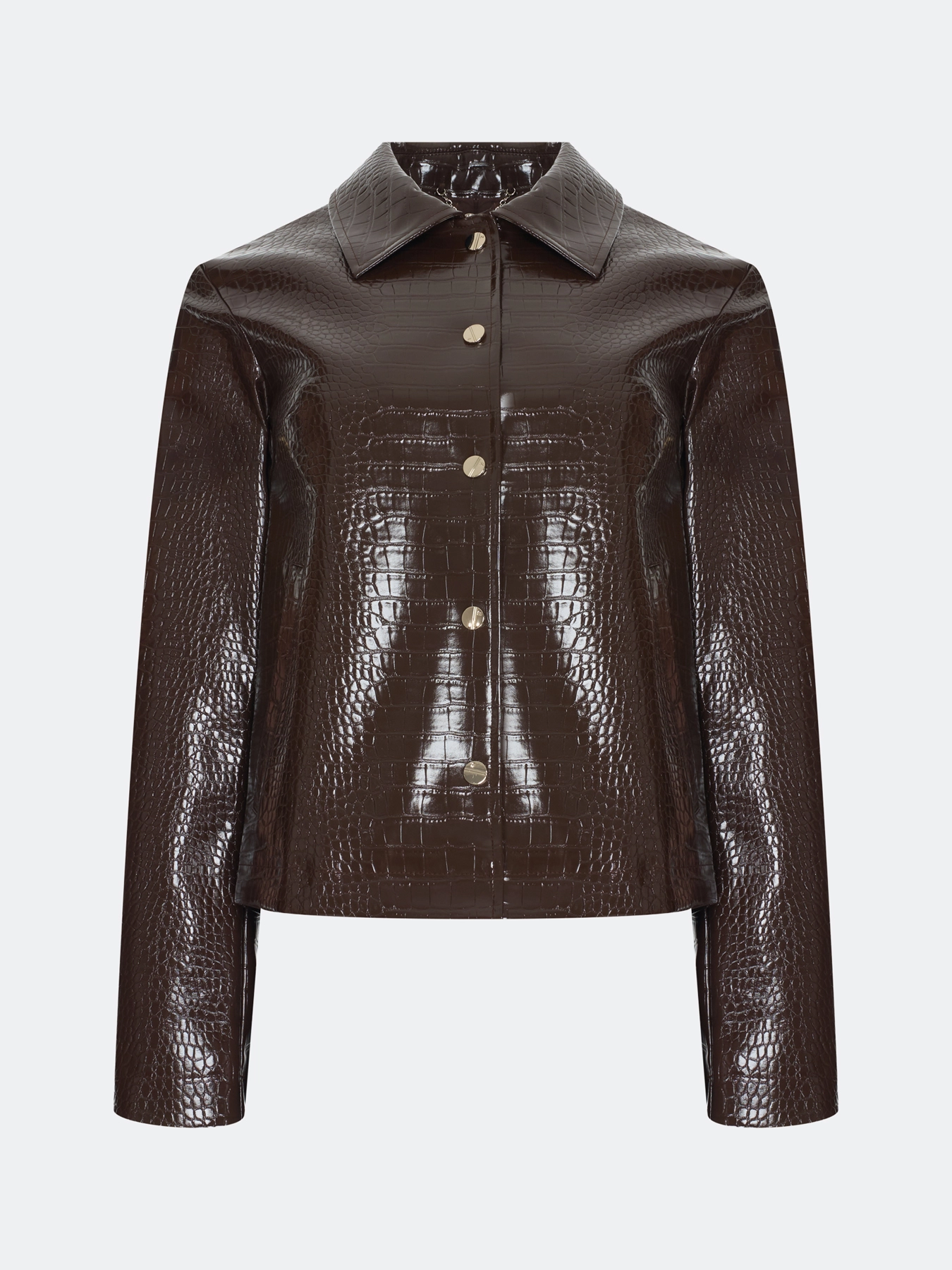 Жакет из искусственной кожи с фактурой питон. Прямой силуэт. Отложной воротник. Застежка на кнопки. Боковые карманы с листочками. Длинные втачные рукава.
