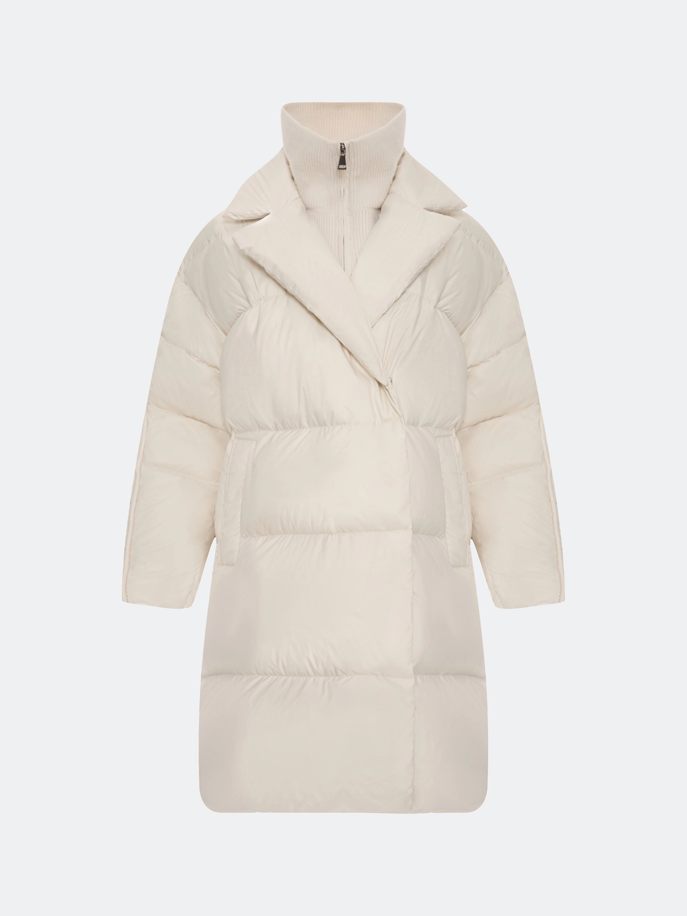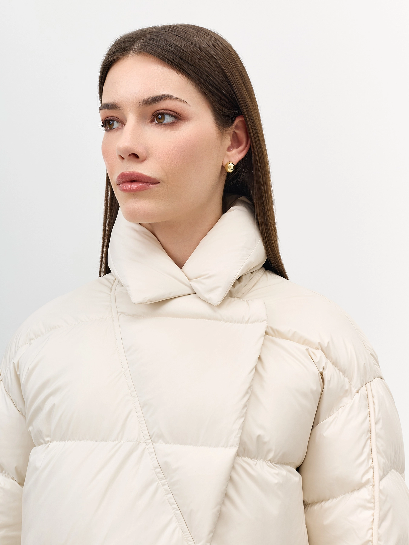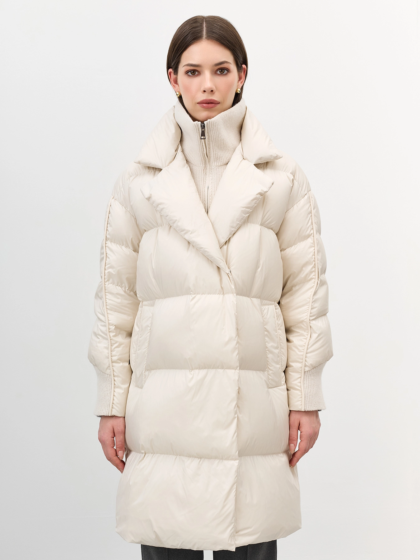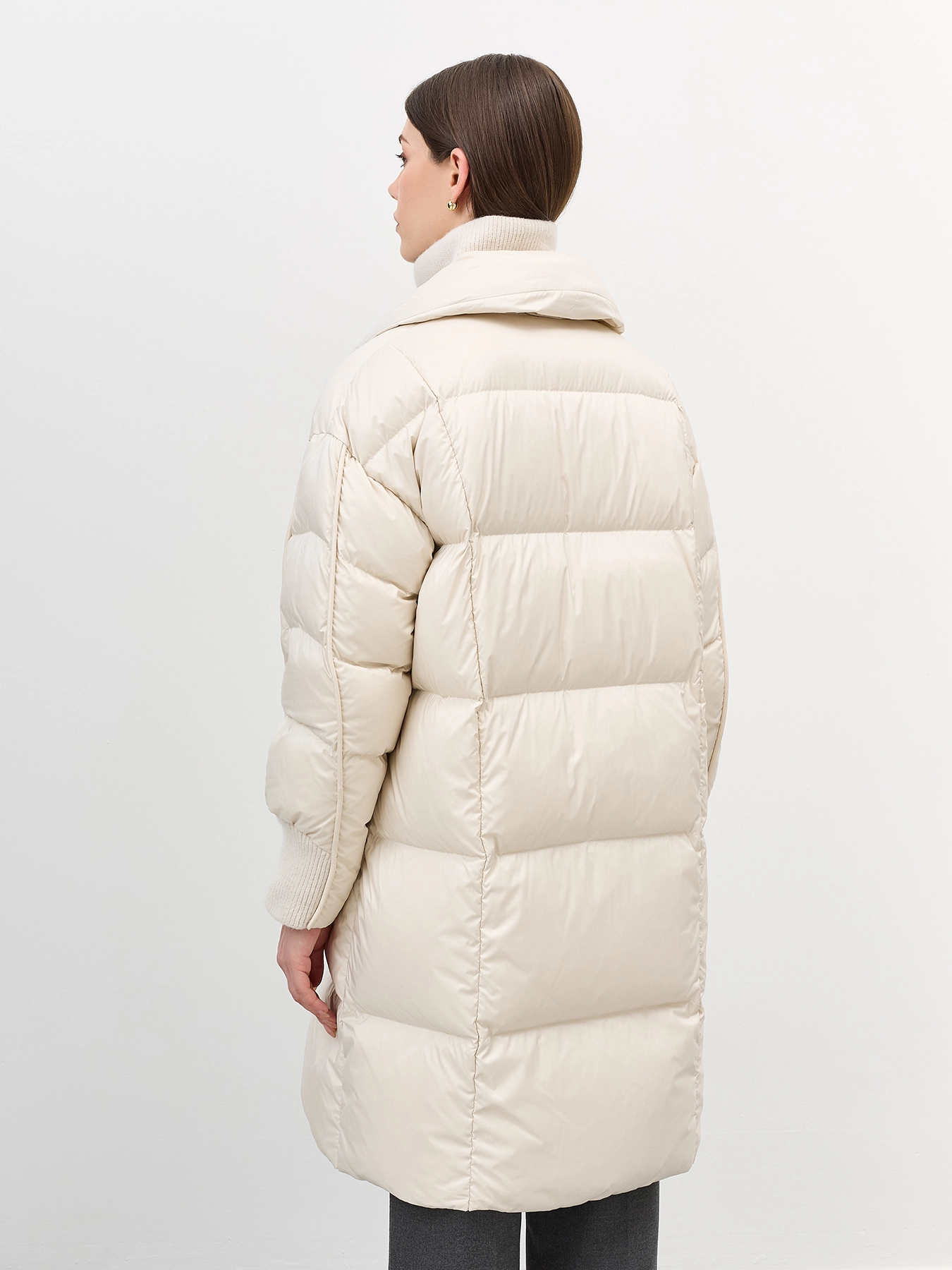 Пуховик на запах с трикотажной манишкой свободного силуэта. Длина до линии колен. Спущенная линия плеч. Английский воротник. Боковые карманы с листочками. Дополнен объемными кантнами по рукавам. Застежка на кнопки. Трикотажная манишка с воротником стойкой и застежкой на молнию. Трикотажные манжеты по низу рукавов. Утеплитель- натуральный пух.