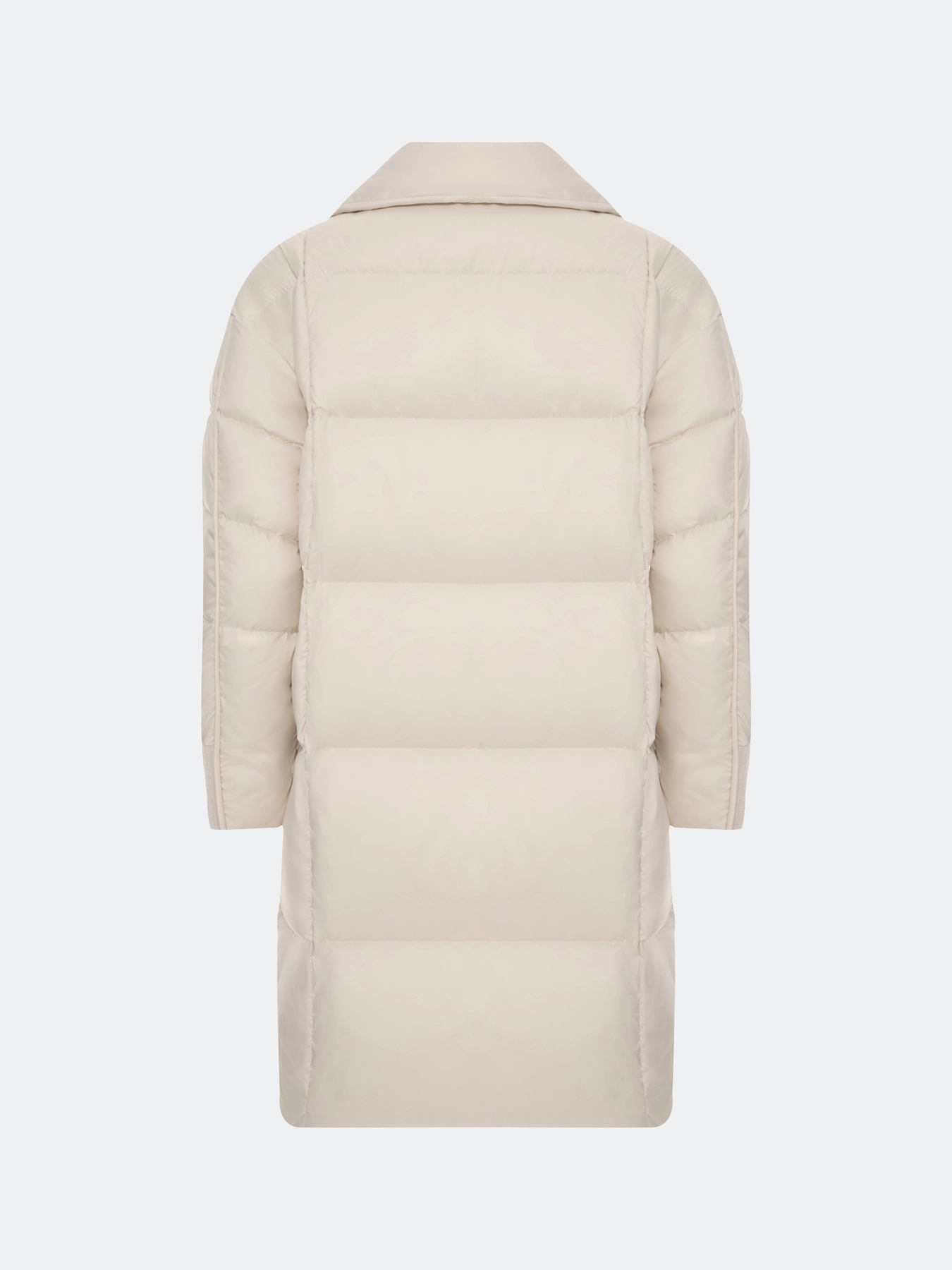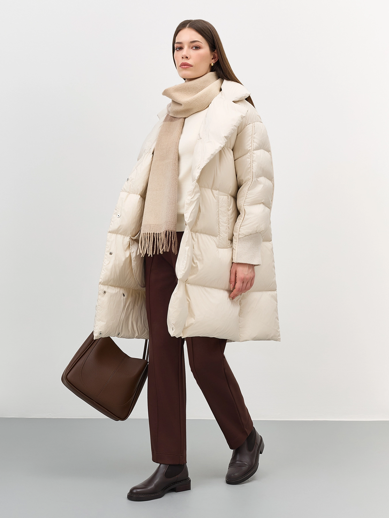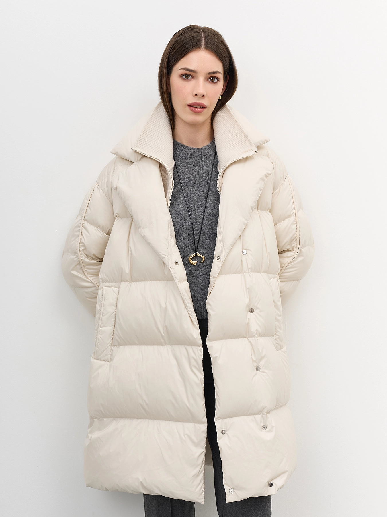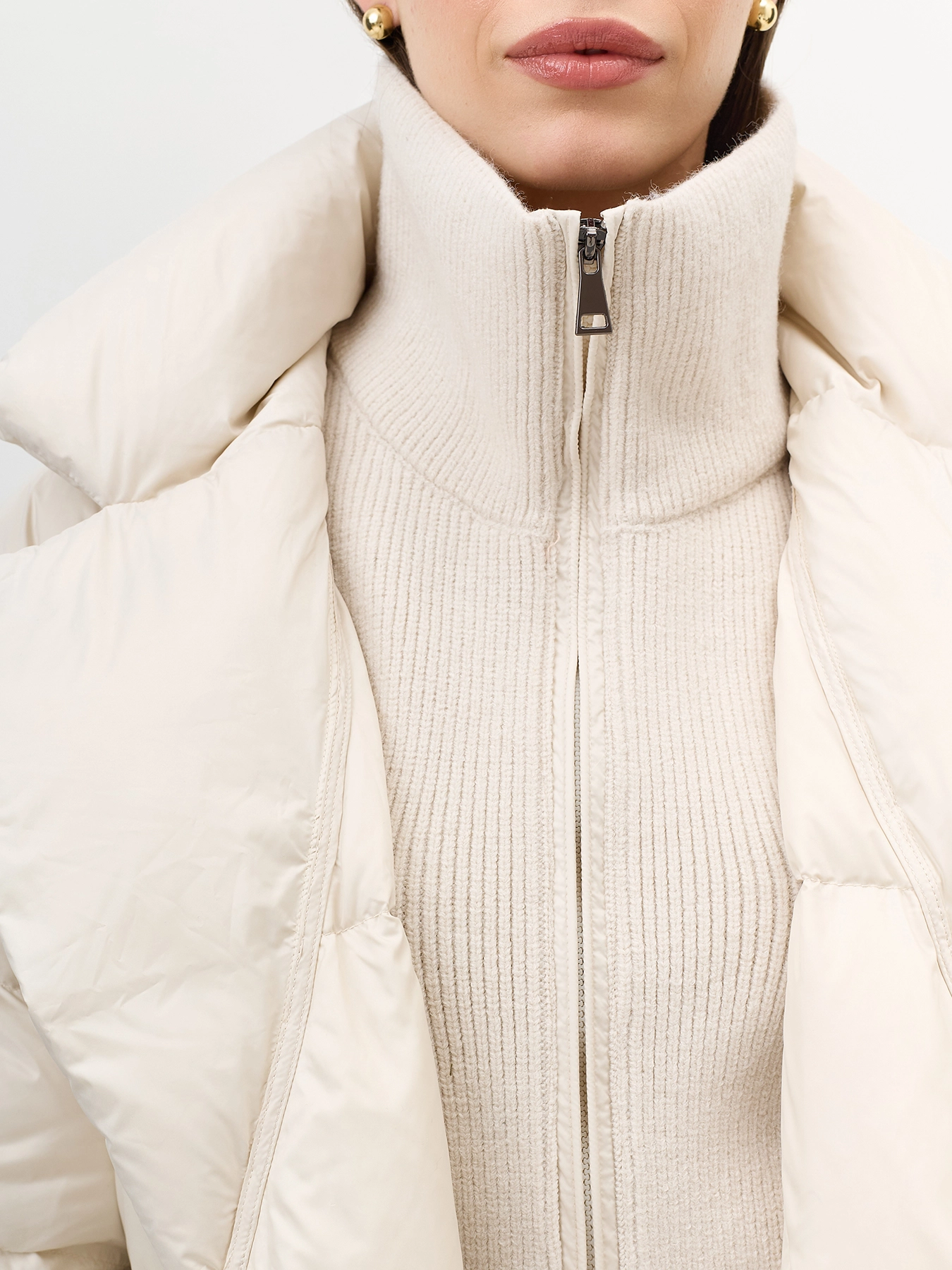 Пуховик на запах с трикотажной манишкой свободного силуэта. Длина до линии колен. Спущенная линия плеч. Английский воротник. Боковые карманы с листочками. Дополнен объемными кантнами по рукавам. Застежка на кнопки. Трикотажная манишка с воротником стойкой и застежкой на молнию. Трикотажные манжеты по низу рукавов. Утеплитель- натуральный пух.