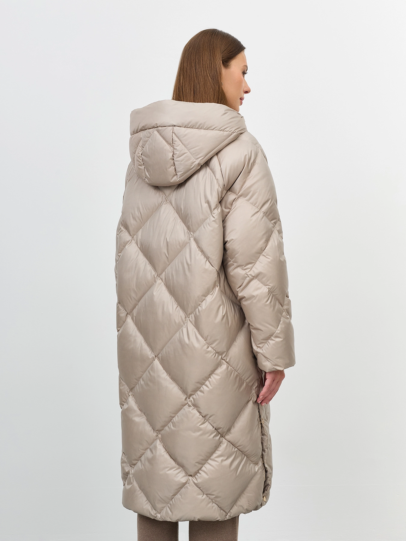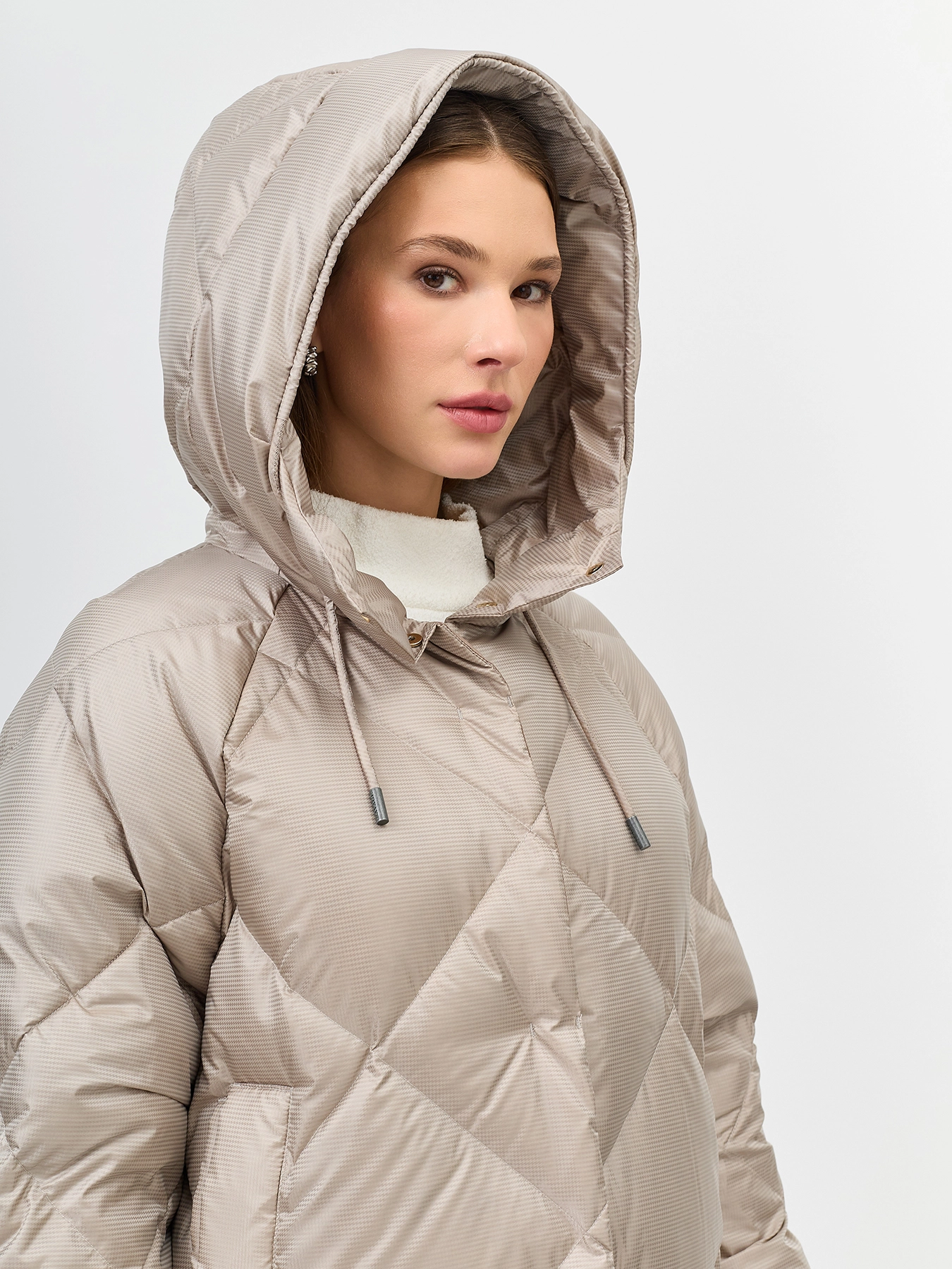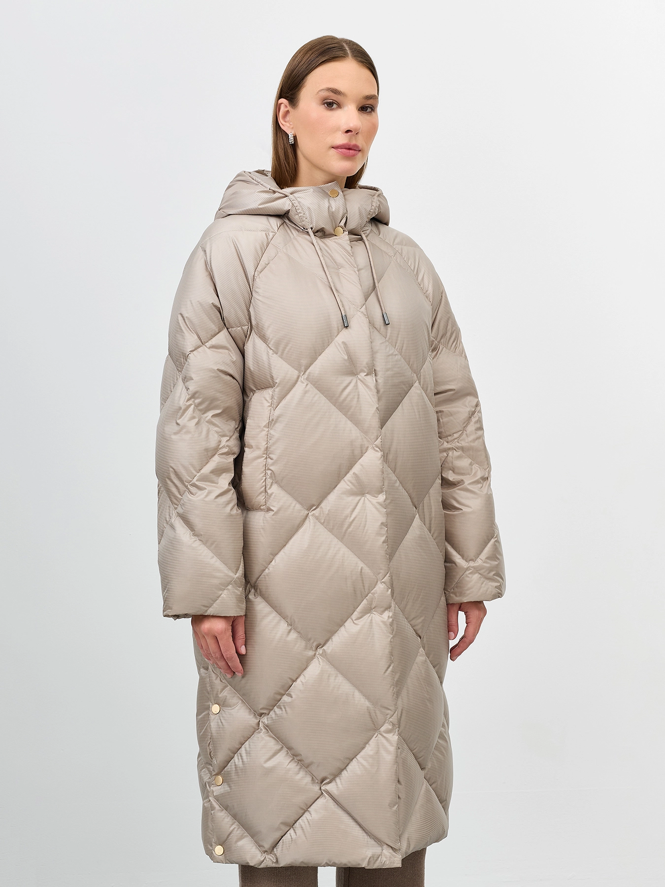 Пуховое пальто с ромбовидной стежкой из фактурной жаккардовой ткани с блеском. Длина миди. Свободный силуэт. Воротник стойка дополнен капюшоном с утяжниками. Боковые карманы с листочками. Застежка на молнию и кнопки. Трикотажные манжеты по низу рукавов реглан. Дополнено длинными разрезами на кнопках в боковых швах. Утеплитель- натуральный пух.