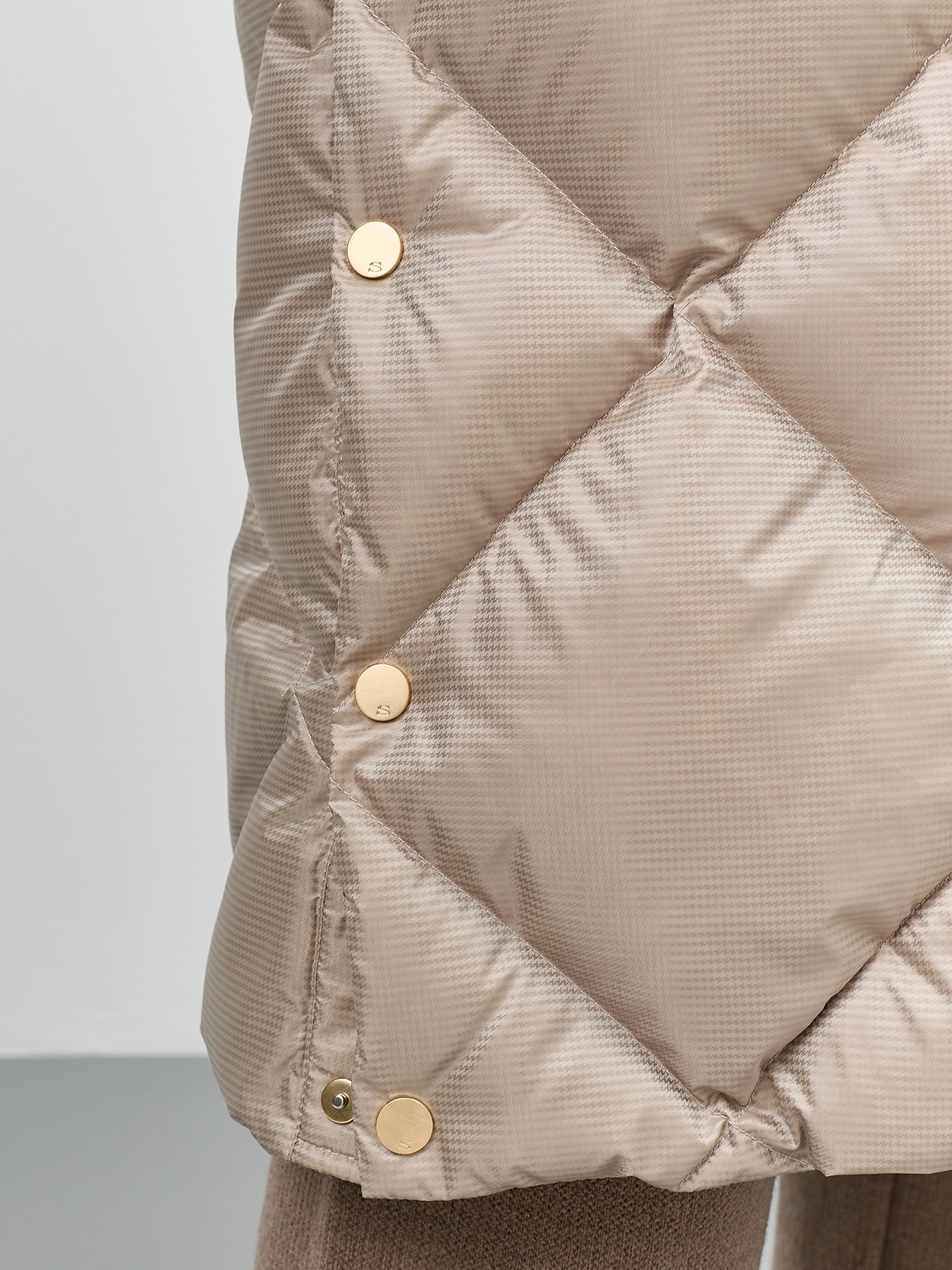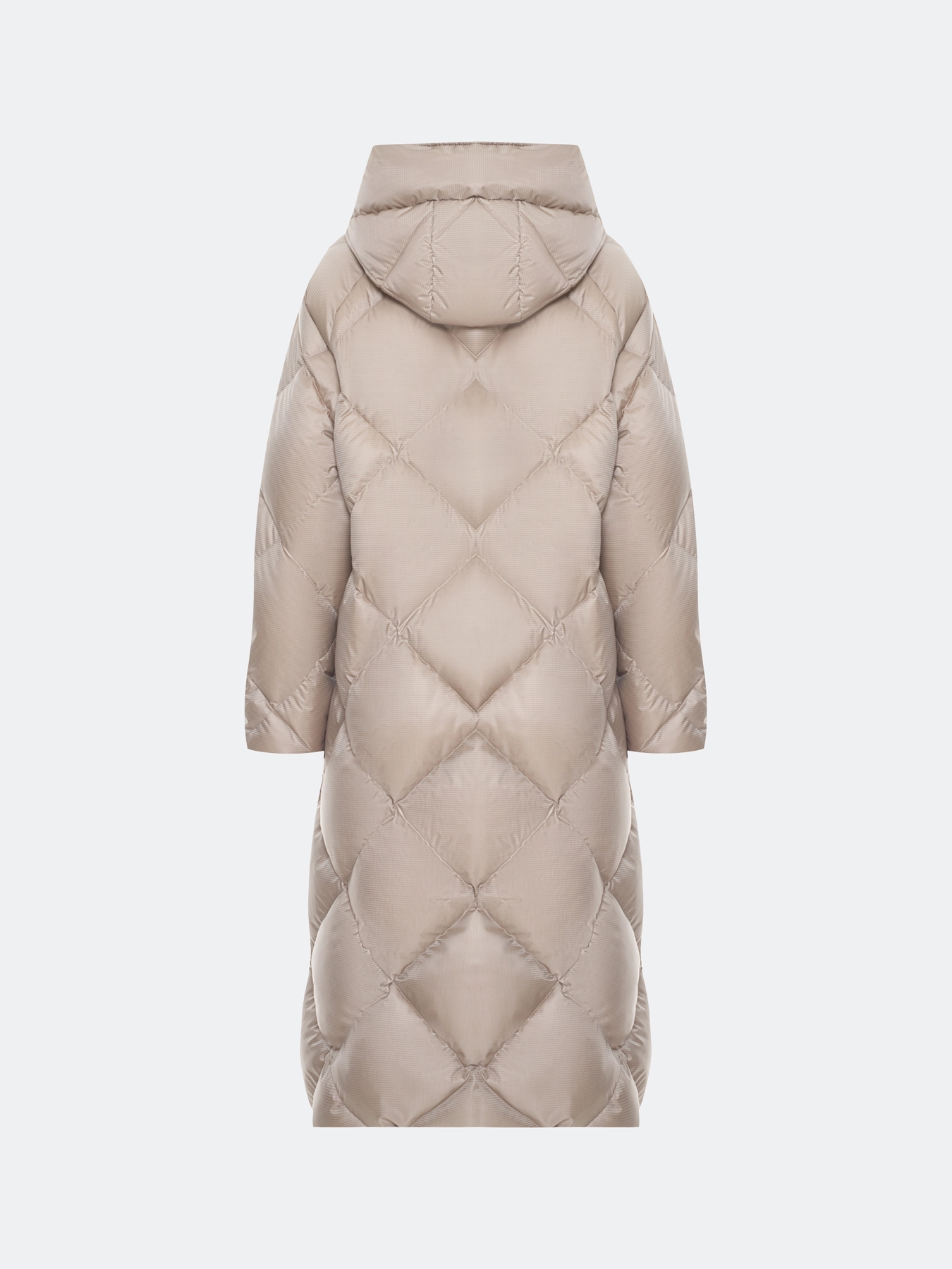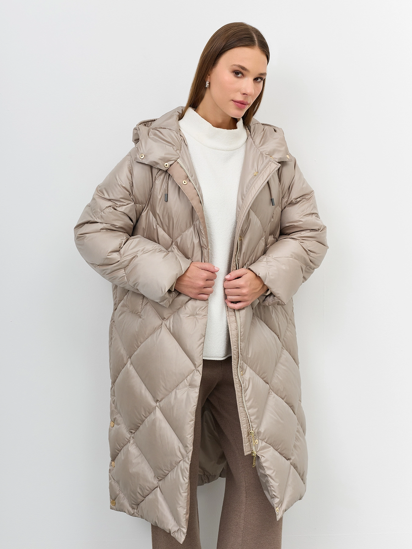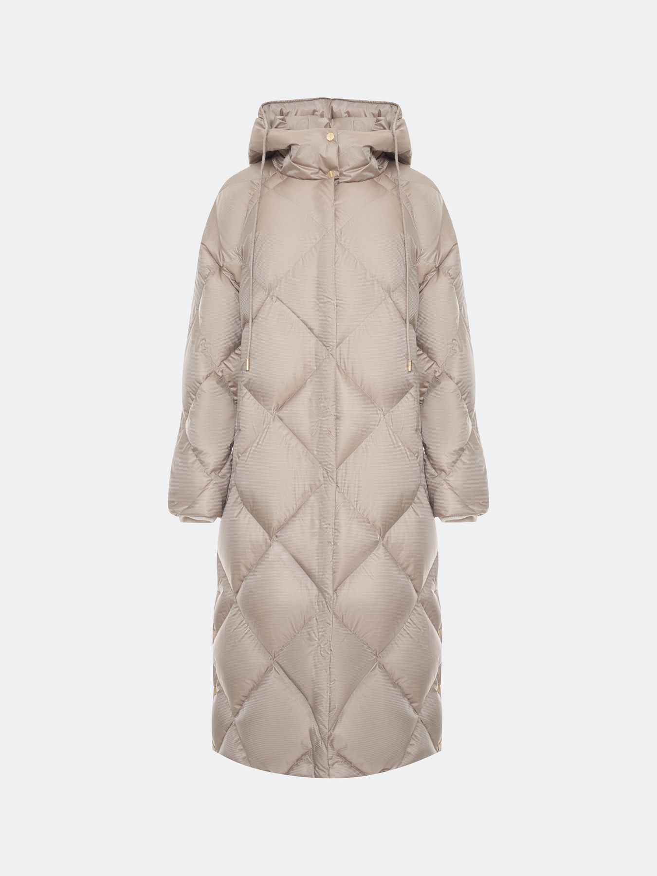Пуховое пальто с ромбовидной стежкой из фактурной жаккардовой ткани с блеском. Длина миди. Свободный силуэт. Воротник стойка дополнен капюшоном с утяжниками. Боковые карманы с листочками. Застежка на молнию и кнопки. Трикотажные манжеты по низу рукавов реглан. Дополнено длинными разрезами на кнопках в боковых швах. Утеплитель- натуральный пух.
