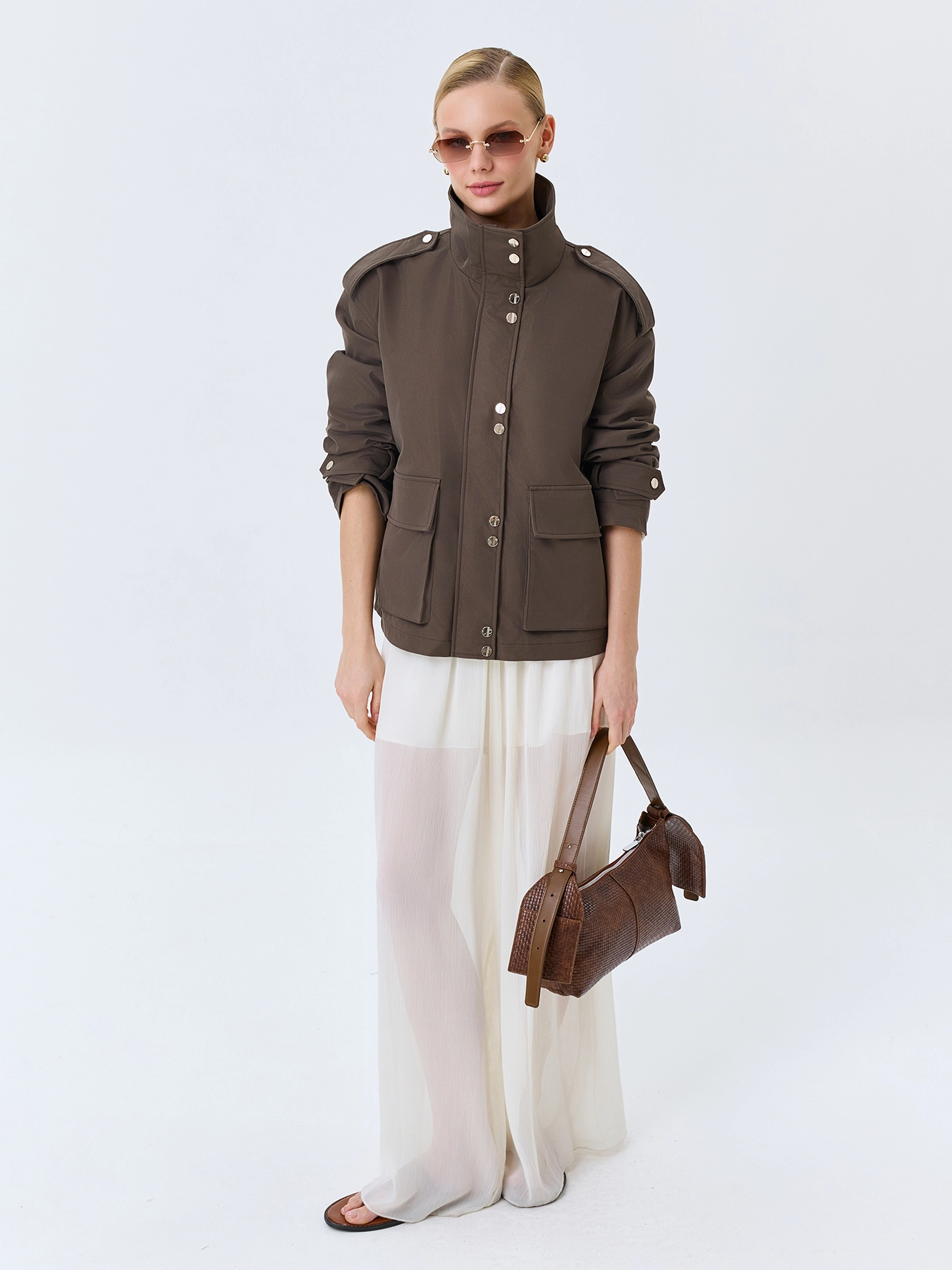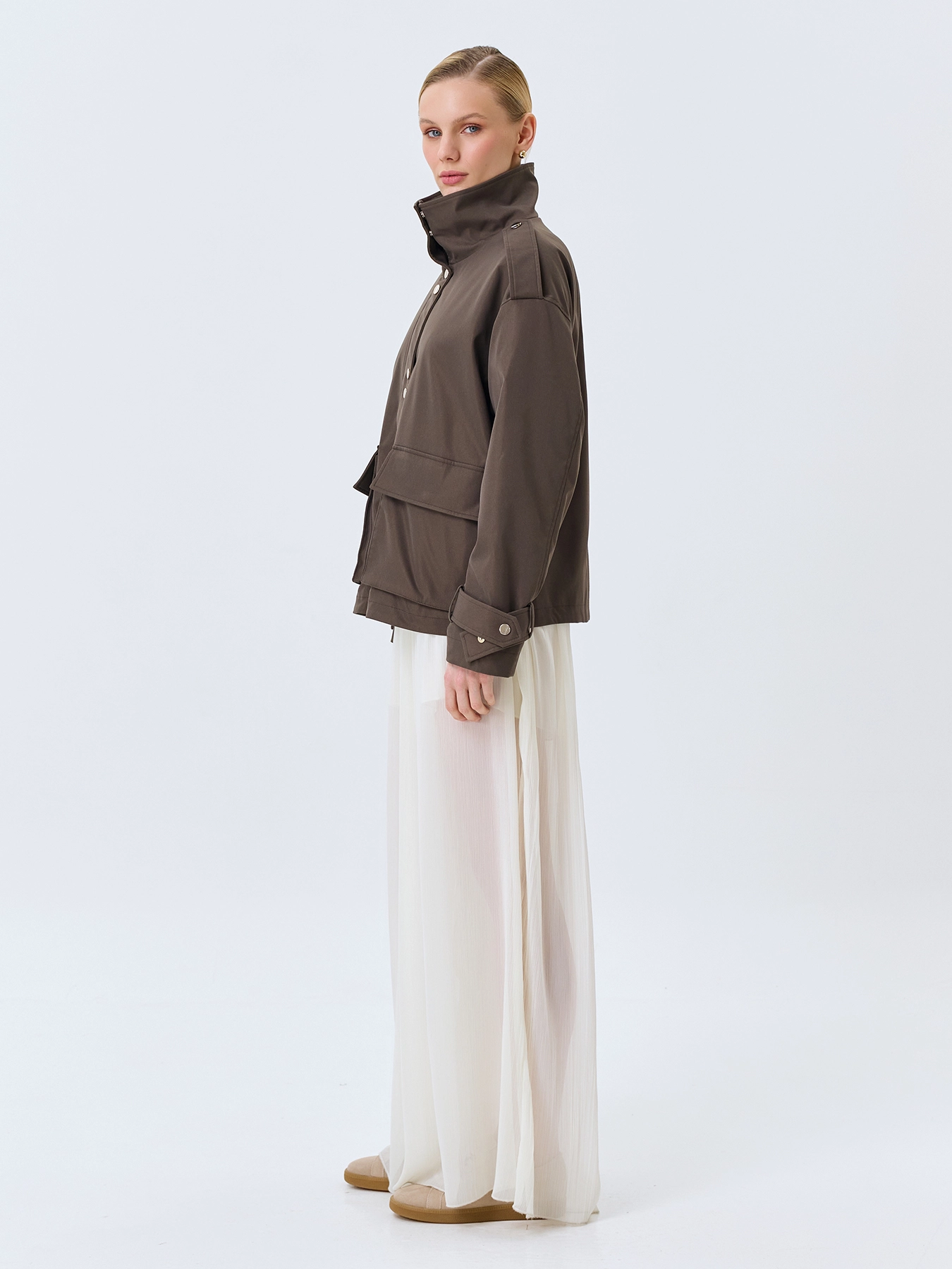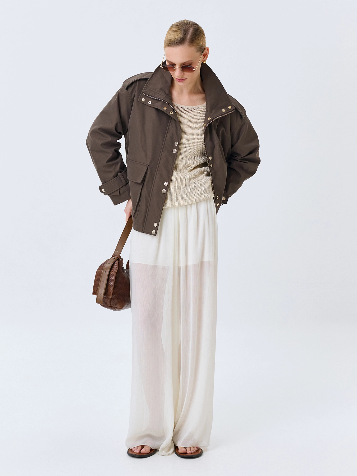 Свободная ветровка с принтованной подкладкой. Воротник высокая стойка на кнопках. Застежка на молнию и кнопки. Накладные боковые карманы с клапанами. Длинные рукава с акцентными манжетами по низу. Дополнена акцентной металлической фурнитурой.