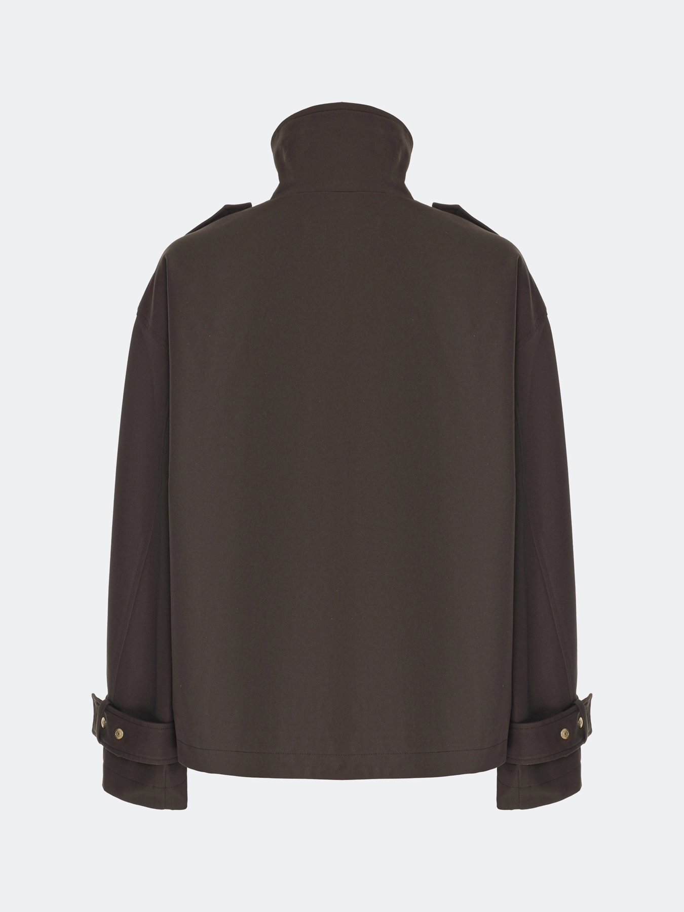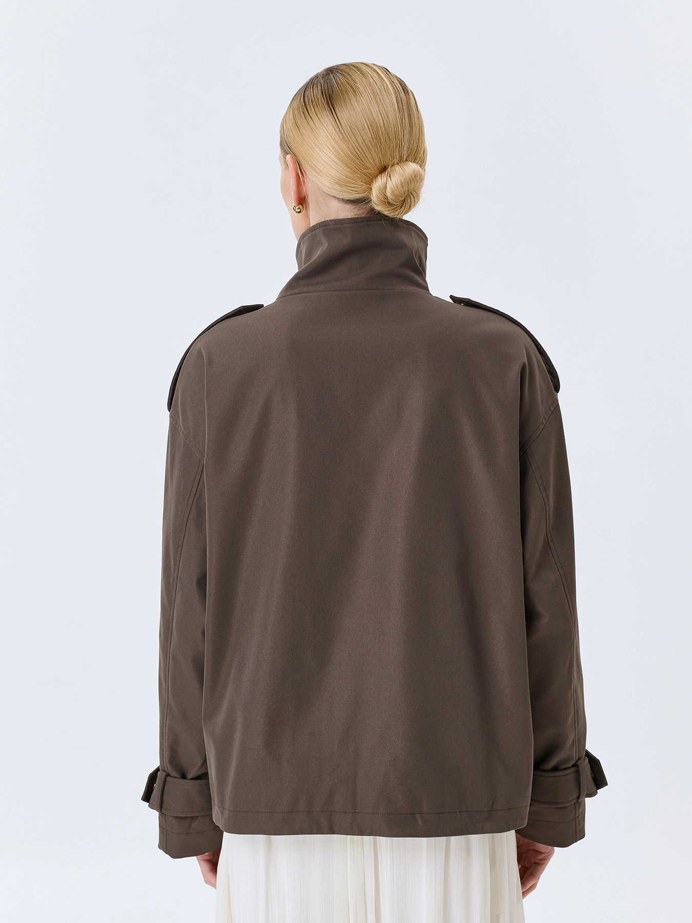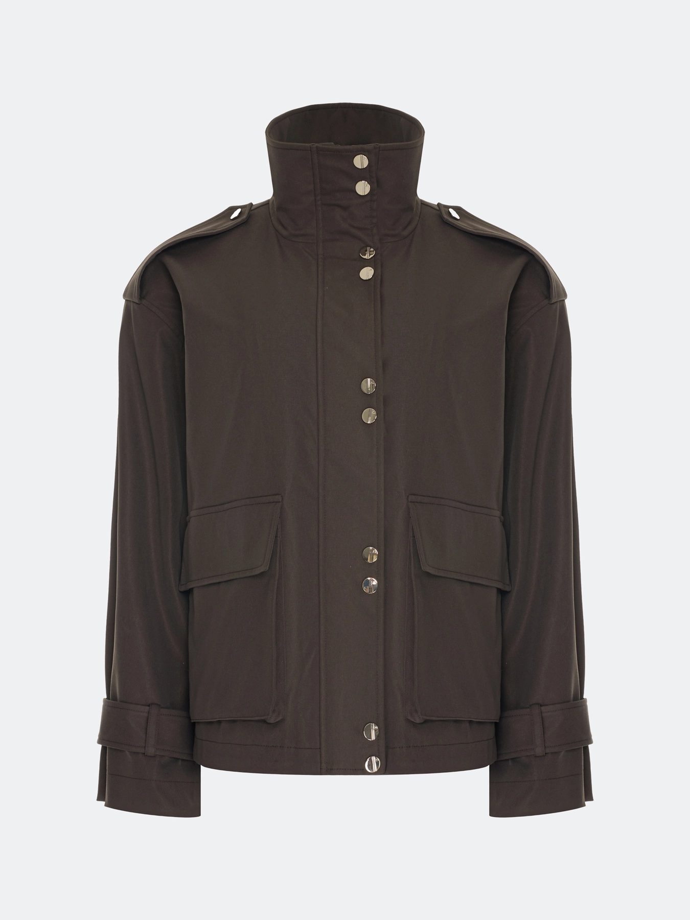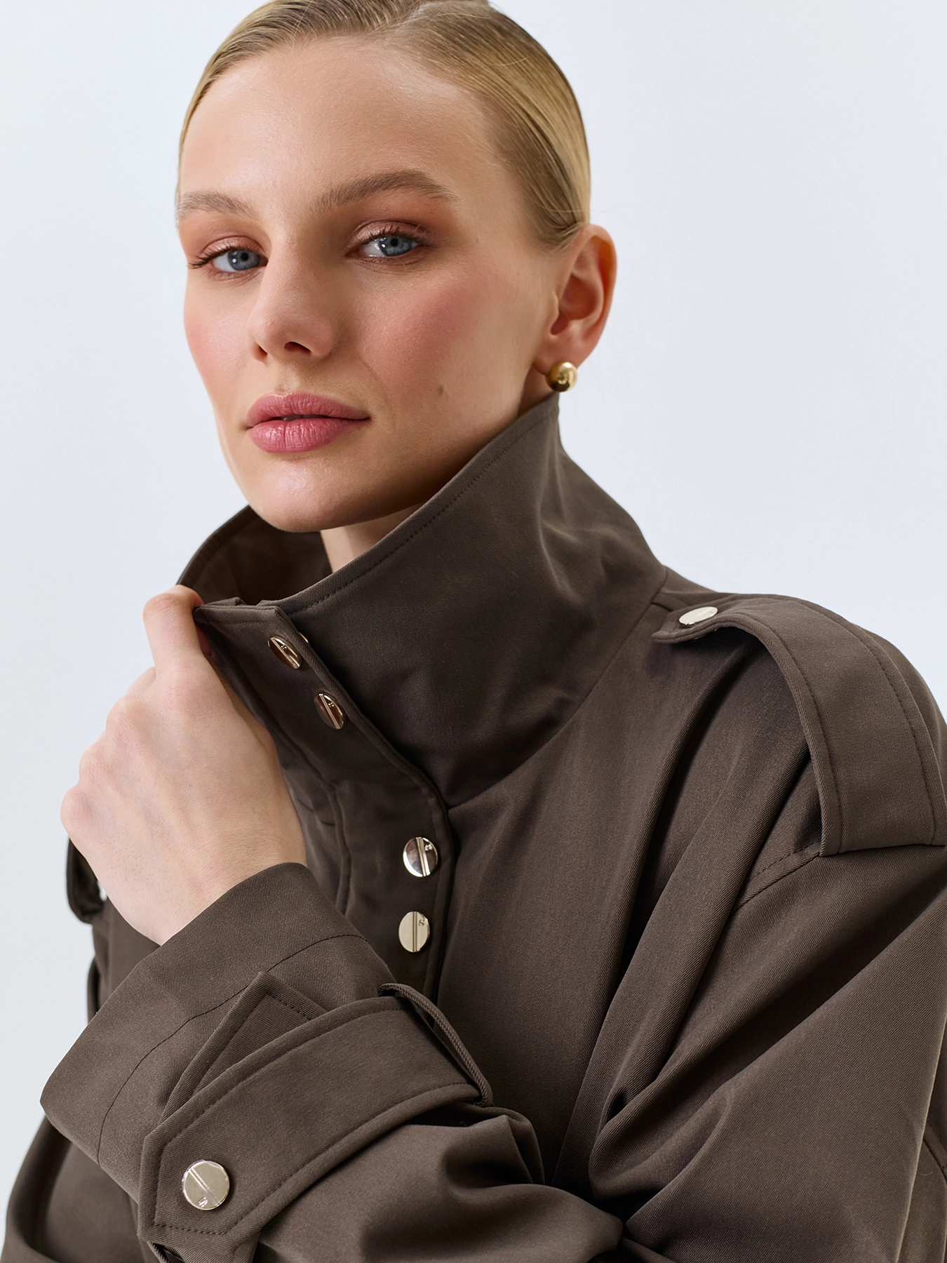 Свободная ветровка с принтованной подкладкой. Воротник высокая стойка на кнопках. Застежка на молнию и кнопки. Накладные боковые карманы с клапанами. Длинные рукава с акцентными манжетами по низу. Дополнена акцентной металлической фурнитурой.