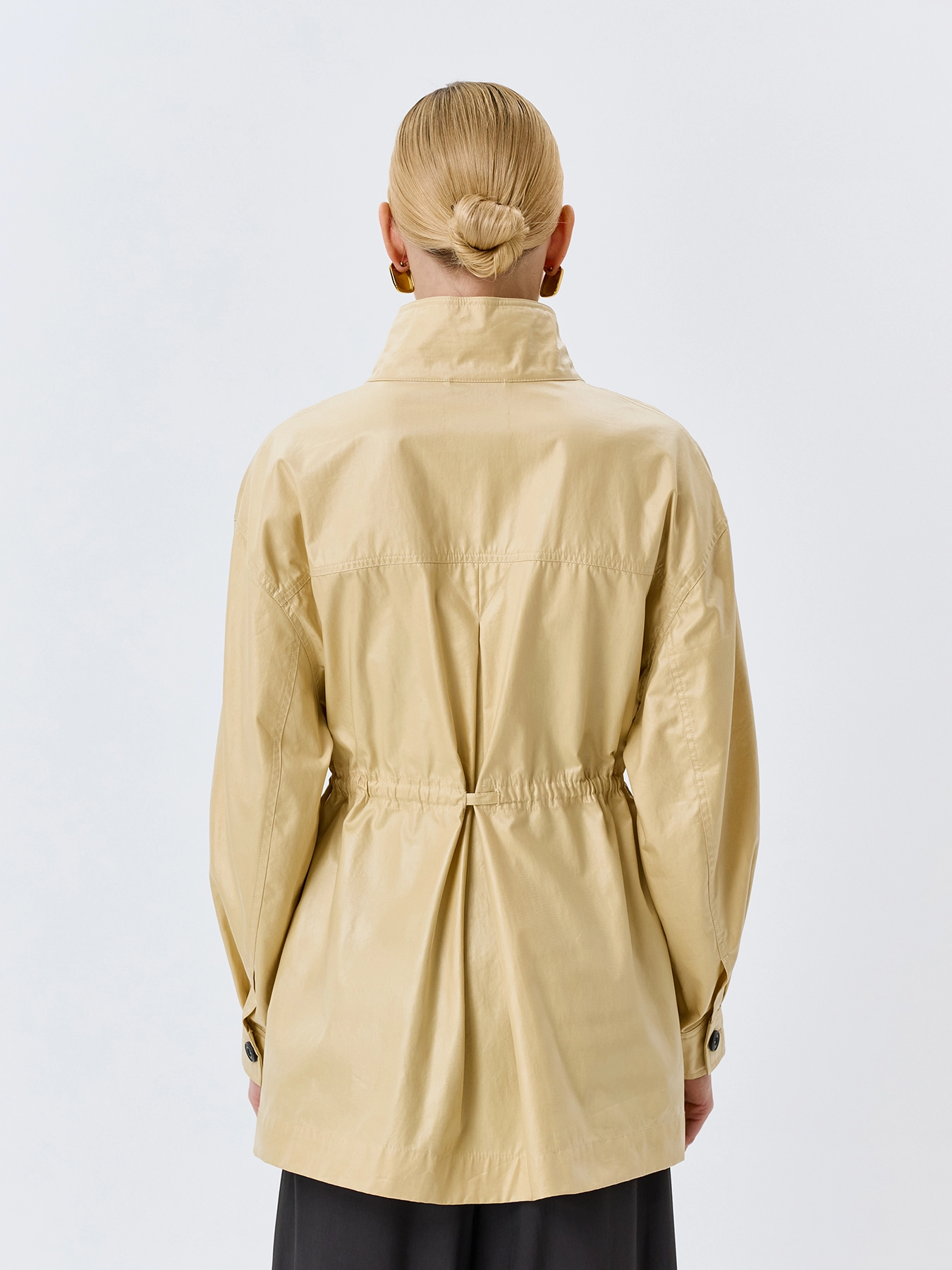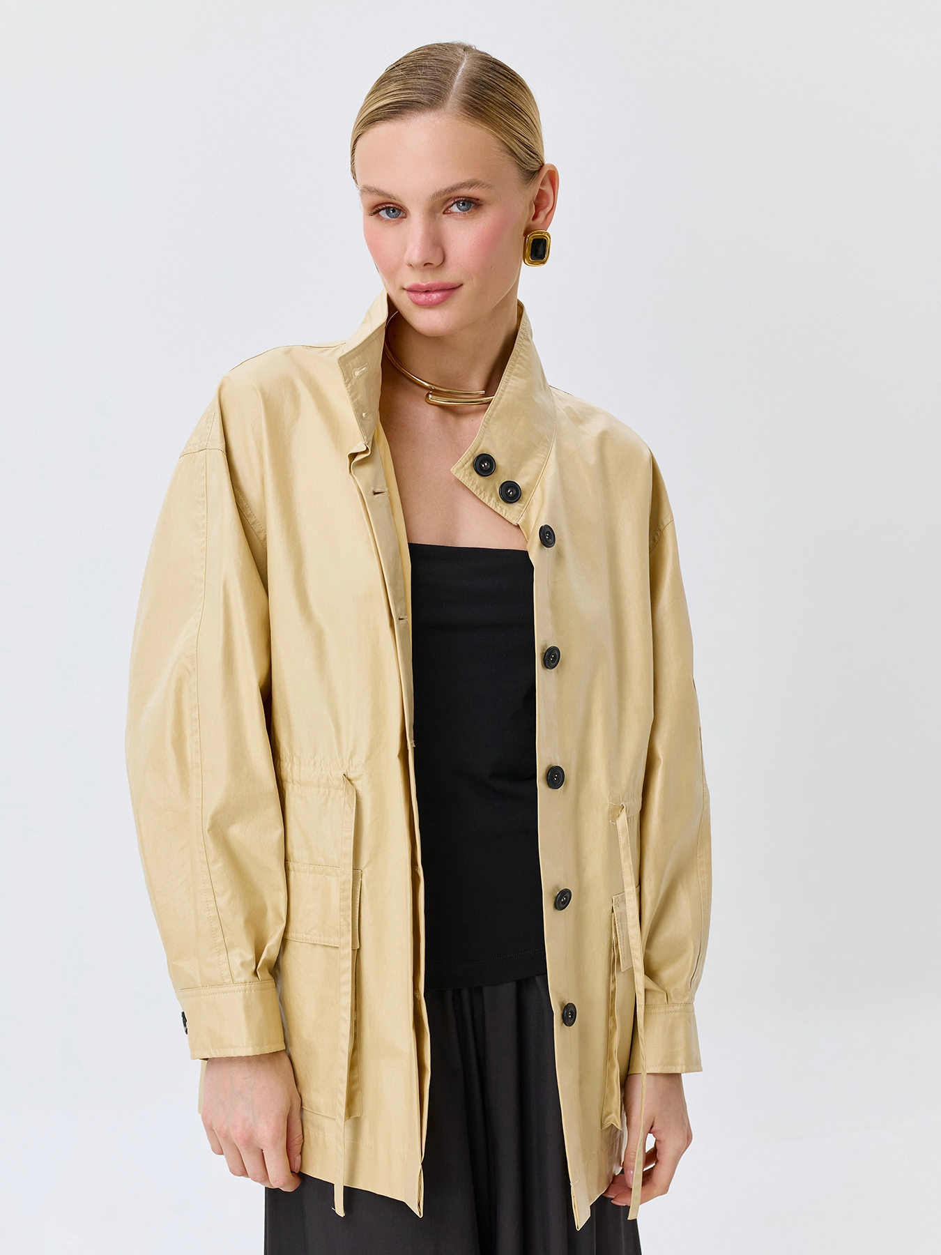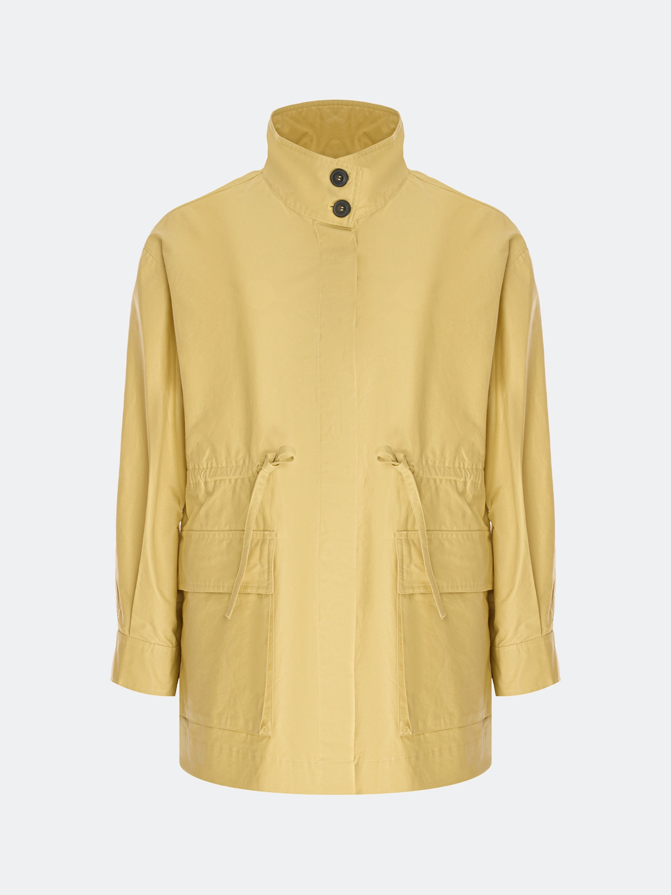 Яркая ветровка из нейлона и хлопка. Свободный силуэт можно приталить кулисой по линии талии. Воротник высокая стойка на контрастных пуговицах. Застежка на пуговицы. Спущенная линия плеч. Накладные боковые карманы с клапанами. Ткань с водонепроницаемым эффектом.