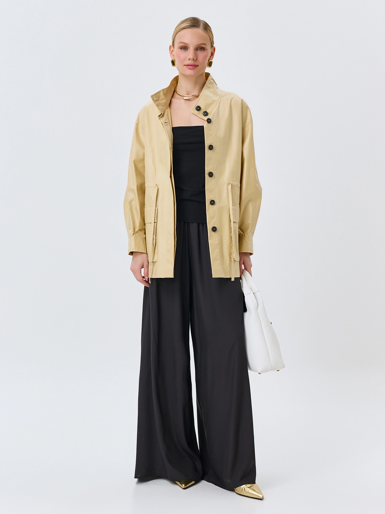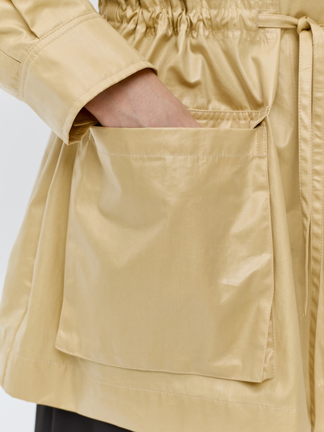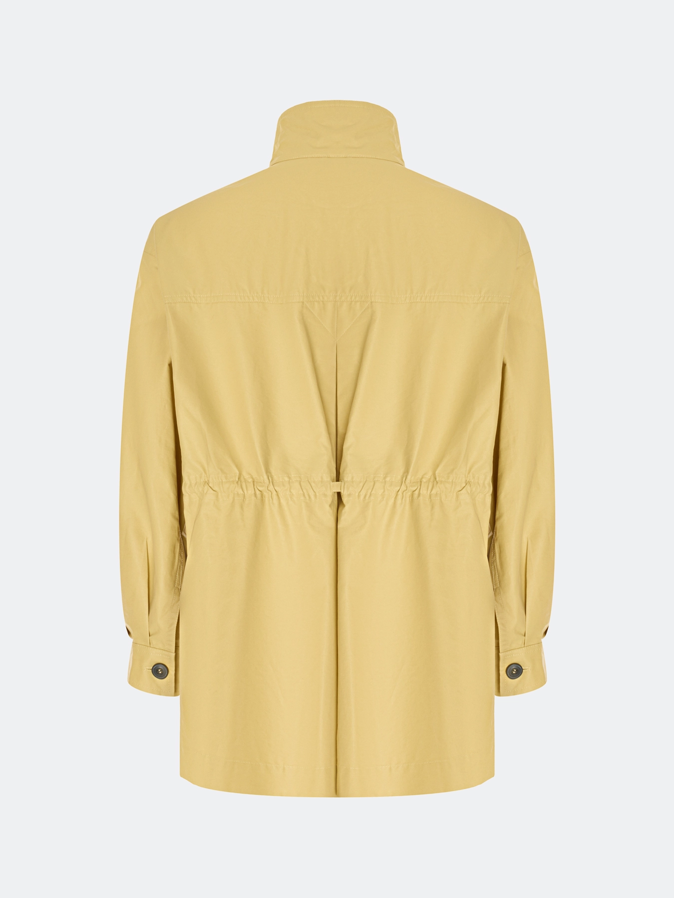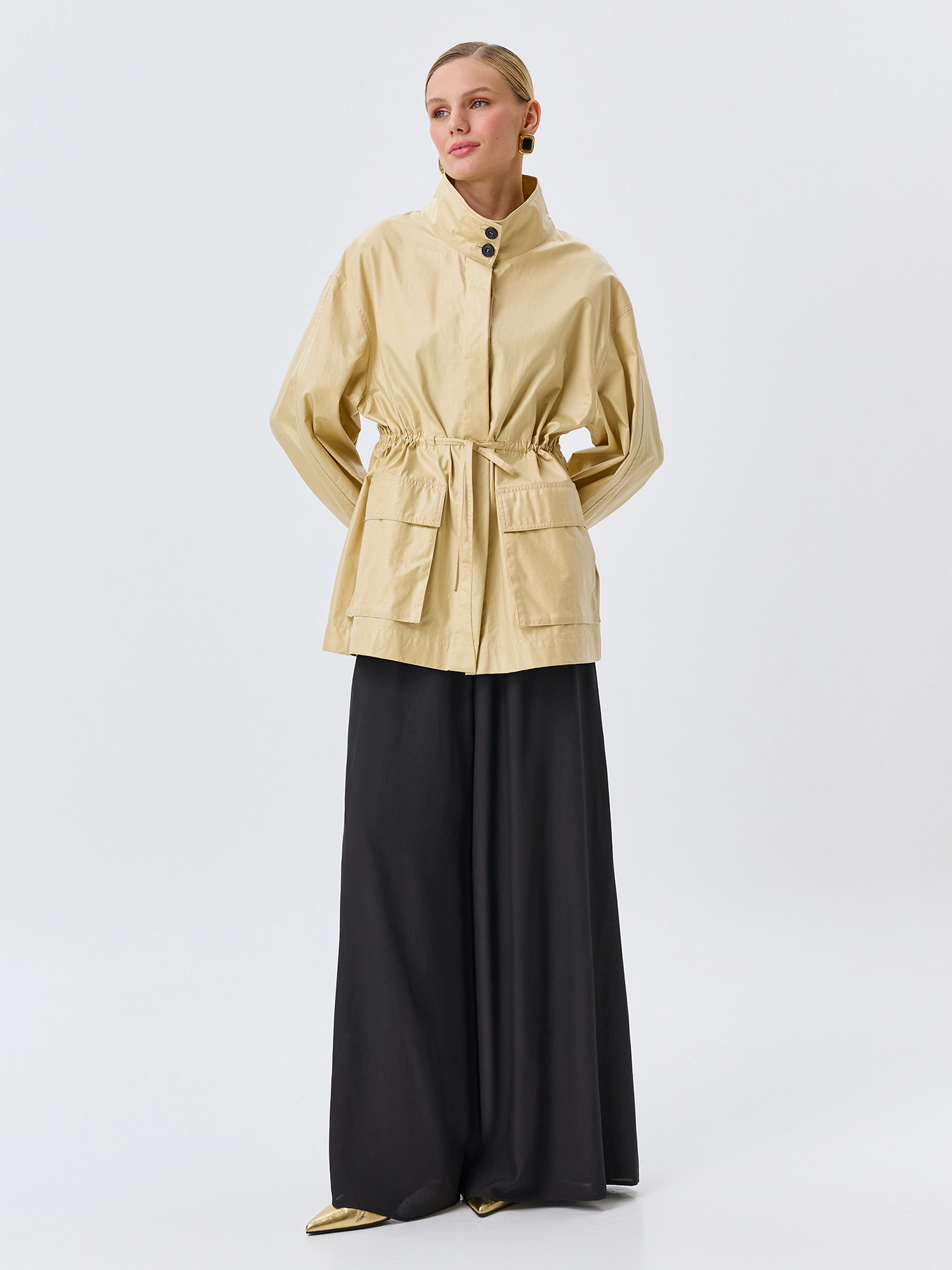 Яркая ветровка из нейлона и хлопка. Свободный силуэт можно приталить кулисой по линии талии. Воротник высокая стойка на контрастных пуговицах. Застежка на пуговицы. Спущенная линия плеч. Накладные боковые карманы с клапанами. Ткань с водонепроницаемым эффектом.
