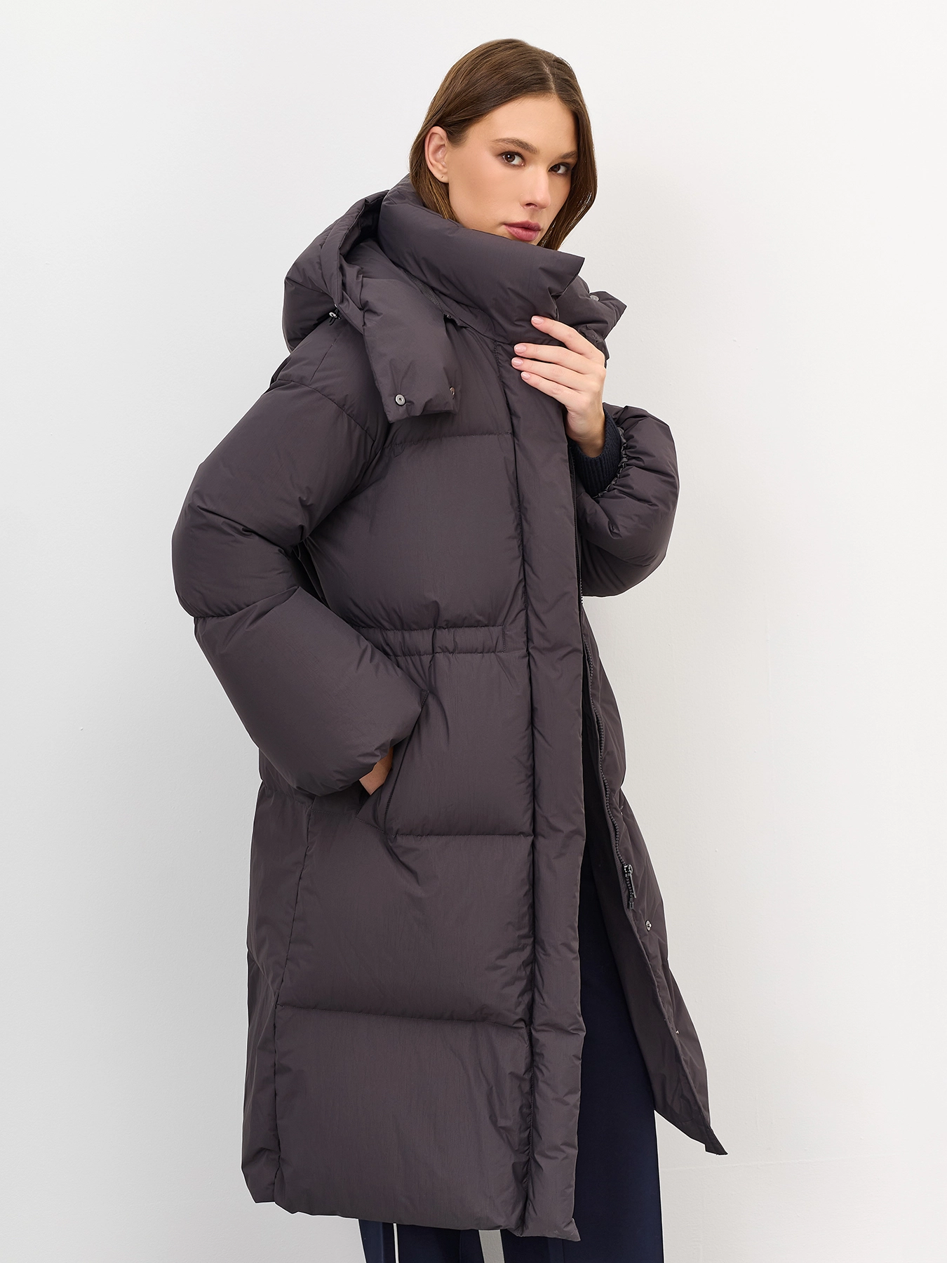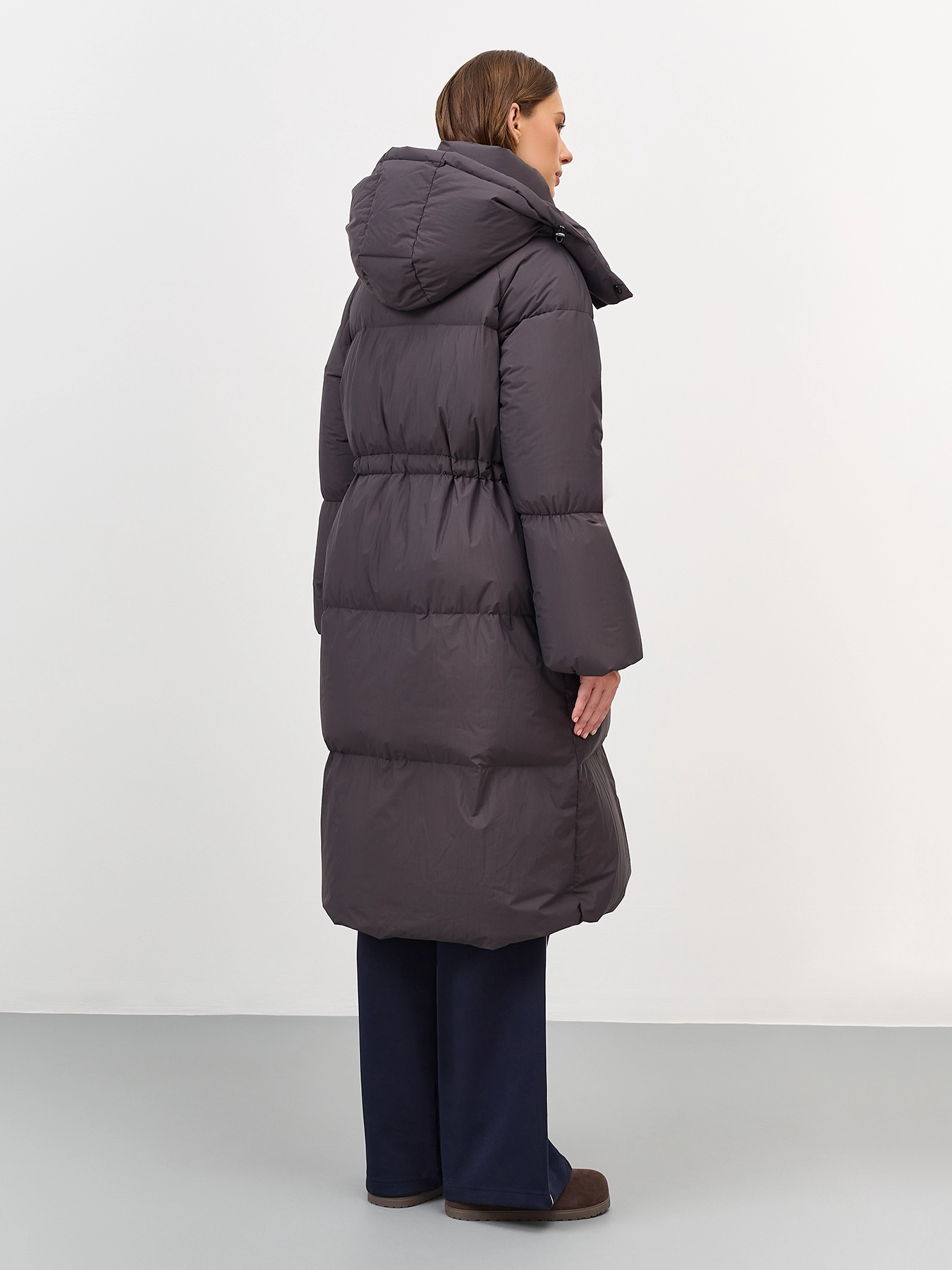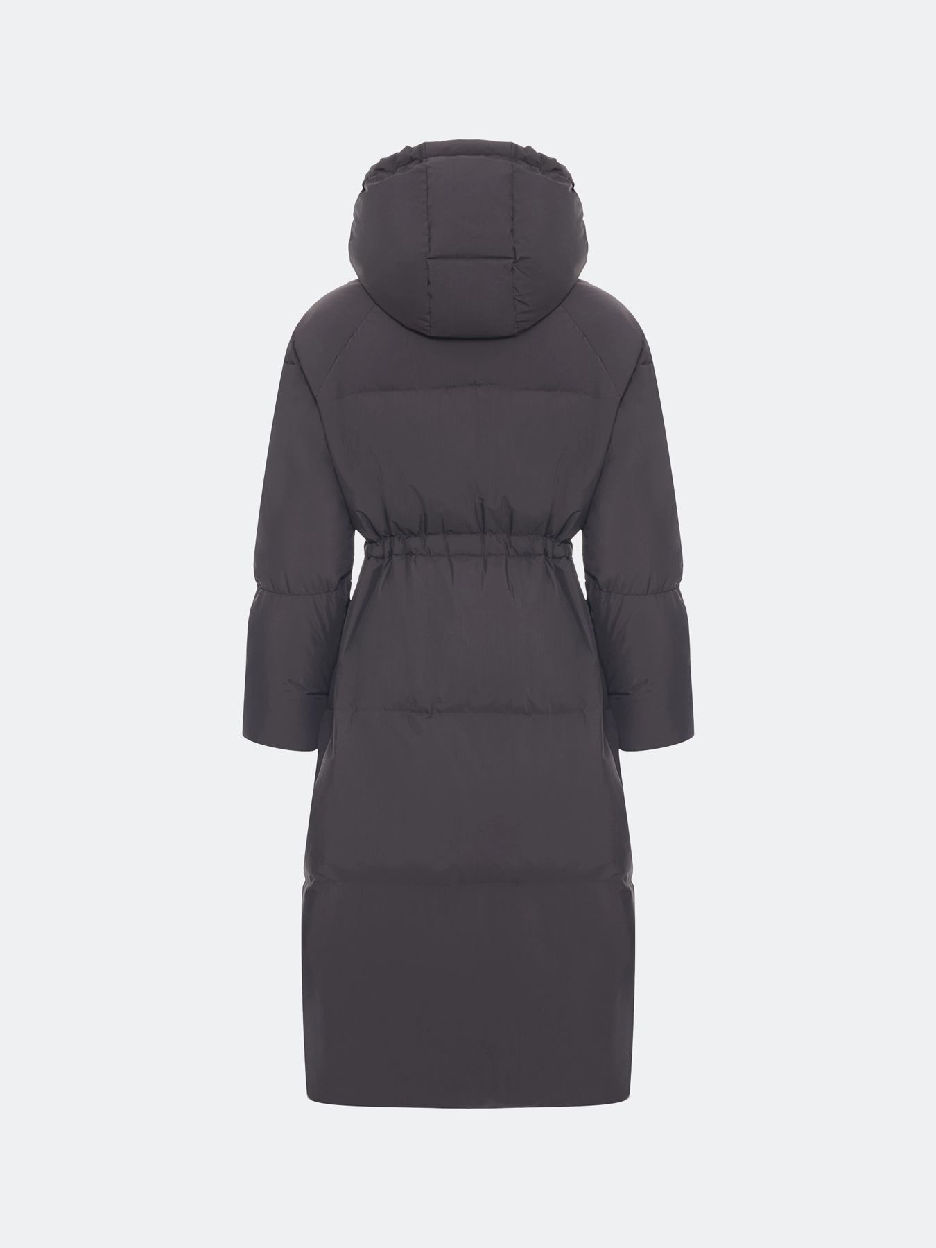 Приталенное пуховое пальто из с крэш эффектом. Свободный силуэт притален кулисой по линии талии. Спущенная линия плеч. Длинные расширеные к низу рукава. Воротник стойка дополнен съемным капюшоном с утяжниками на кнопках. Застежка на молнию и кнопки. Боковые карманы с листочками. Утеплитель- натуральный пух.