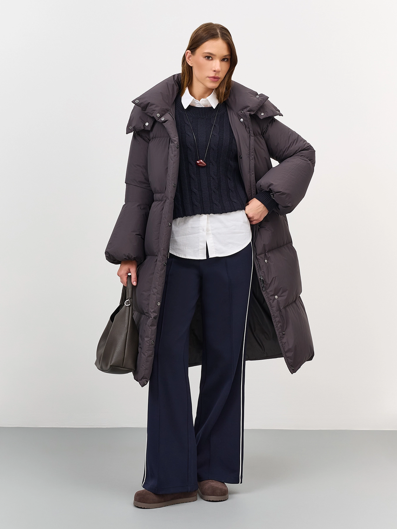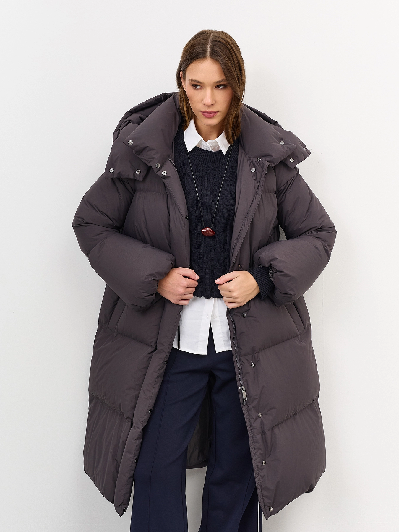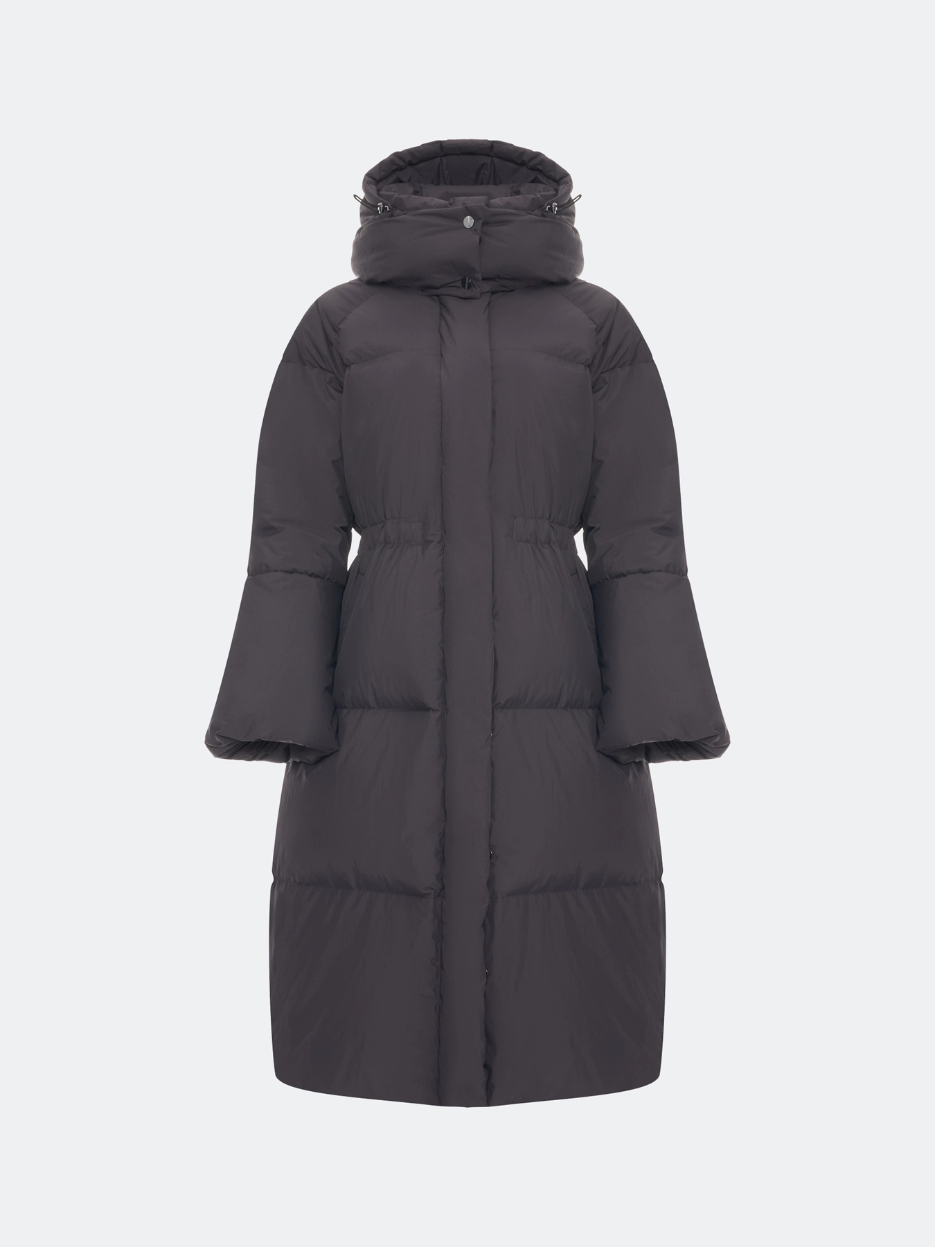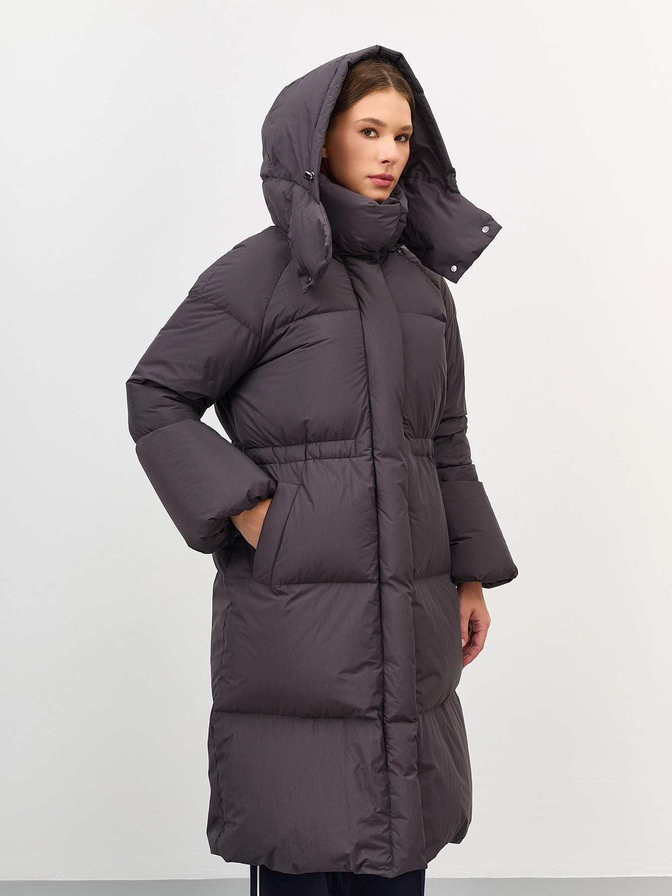 Приталенное пуховое пальто из с крэш эффектом. Свободный силуэт притален кулисой по линии талии. Спущенная линия плеч. Длинные расширеные к низу рукава. Воротник стойка дополнен съемным капюшоном с утяжниками на кнопках. Застежка на молнию и кнопки. Боковые карманы с листочками. Утеплитель- натуральный пух.