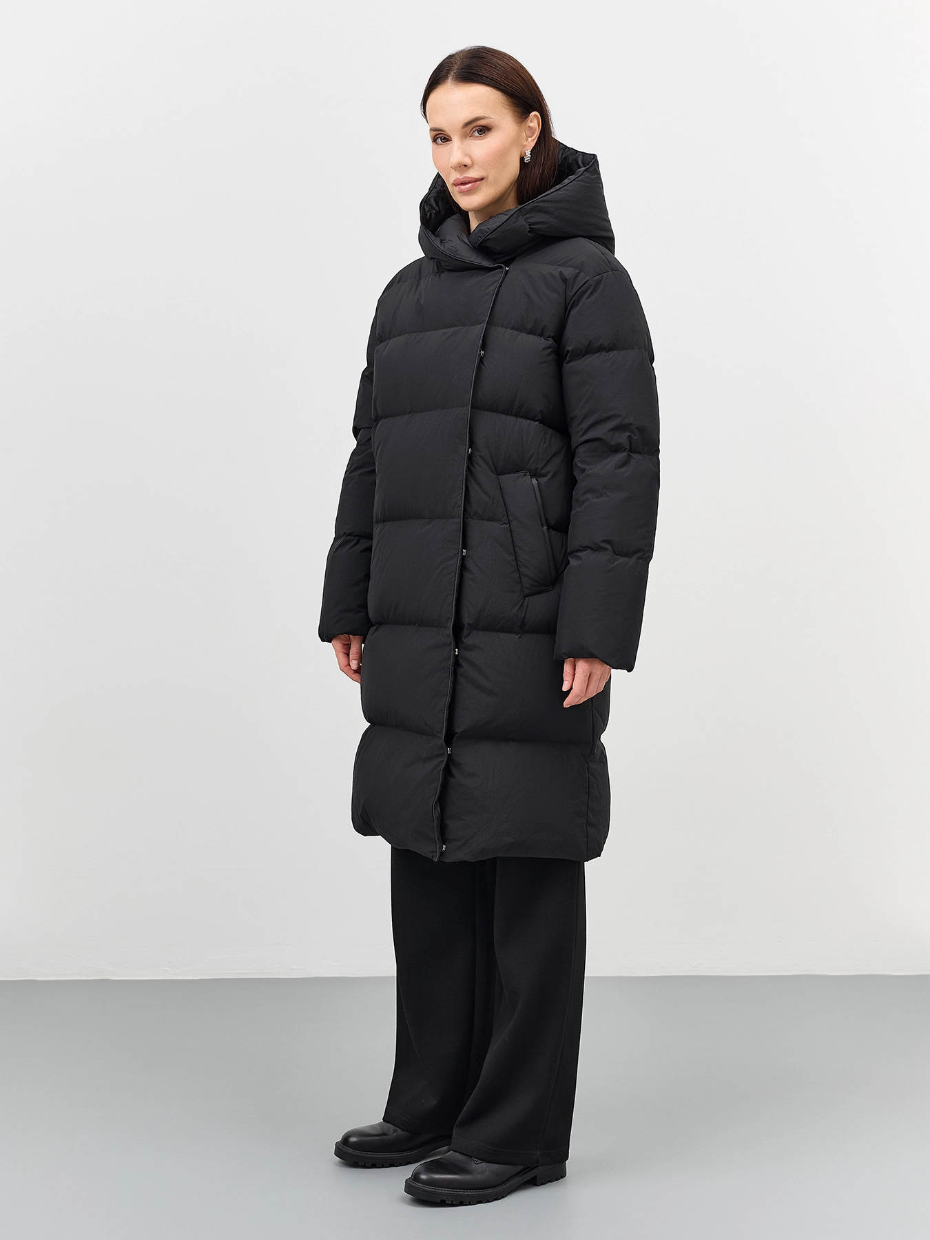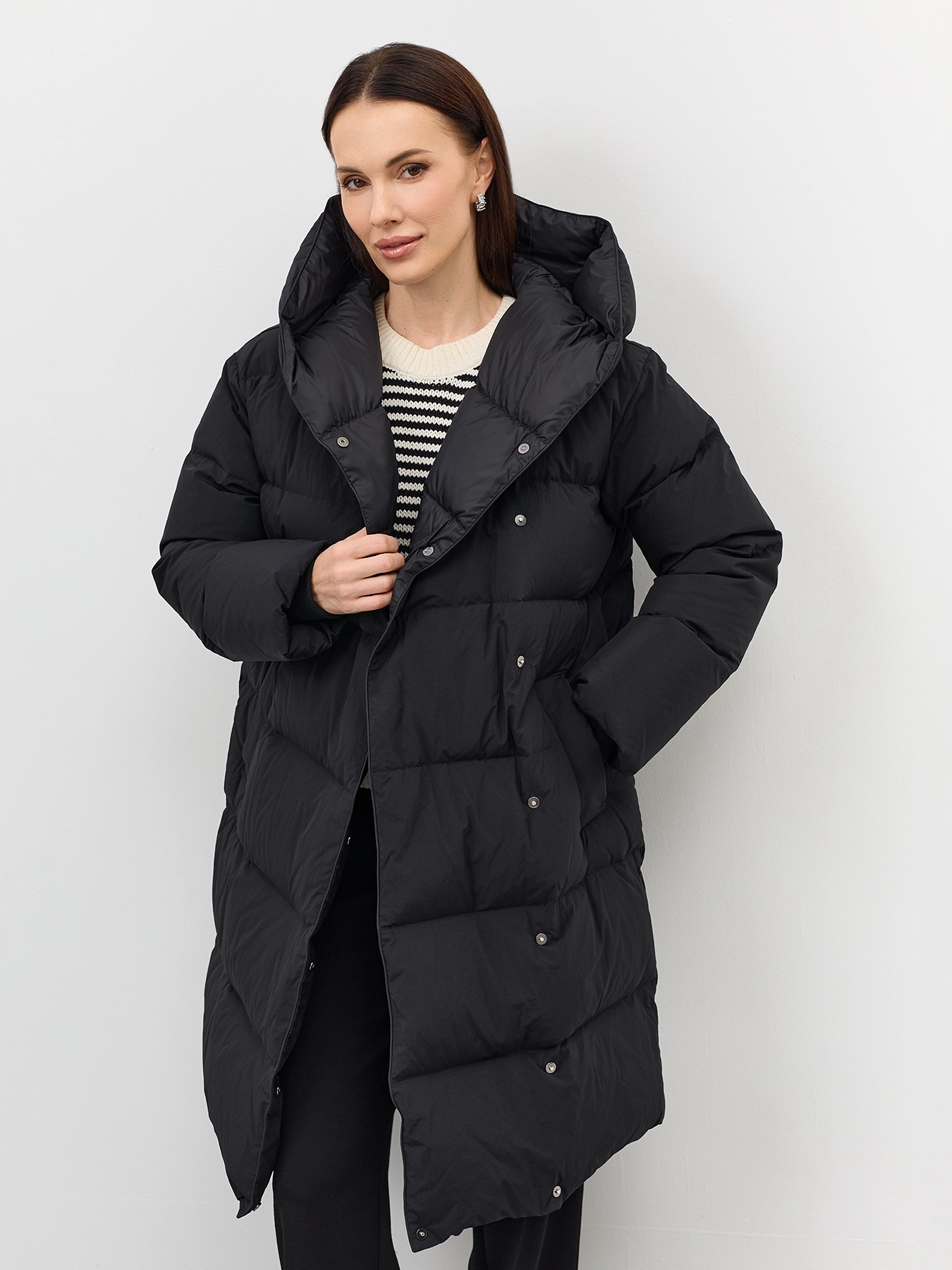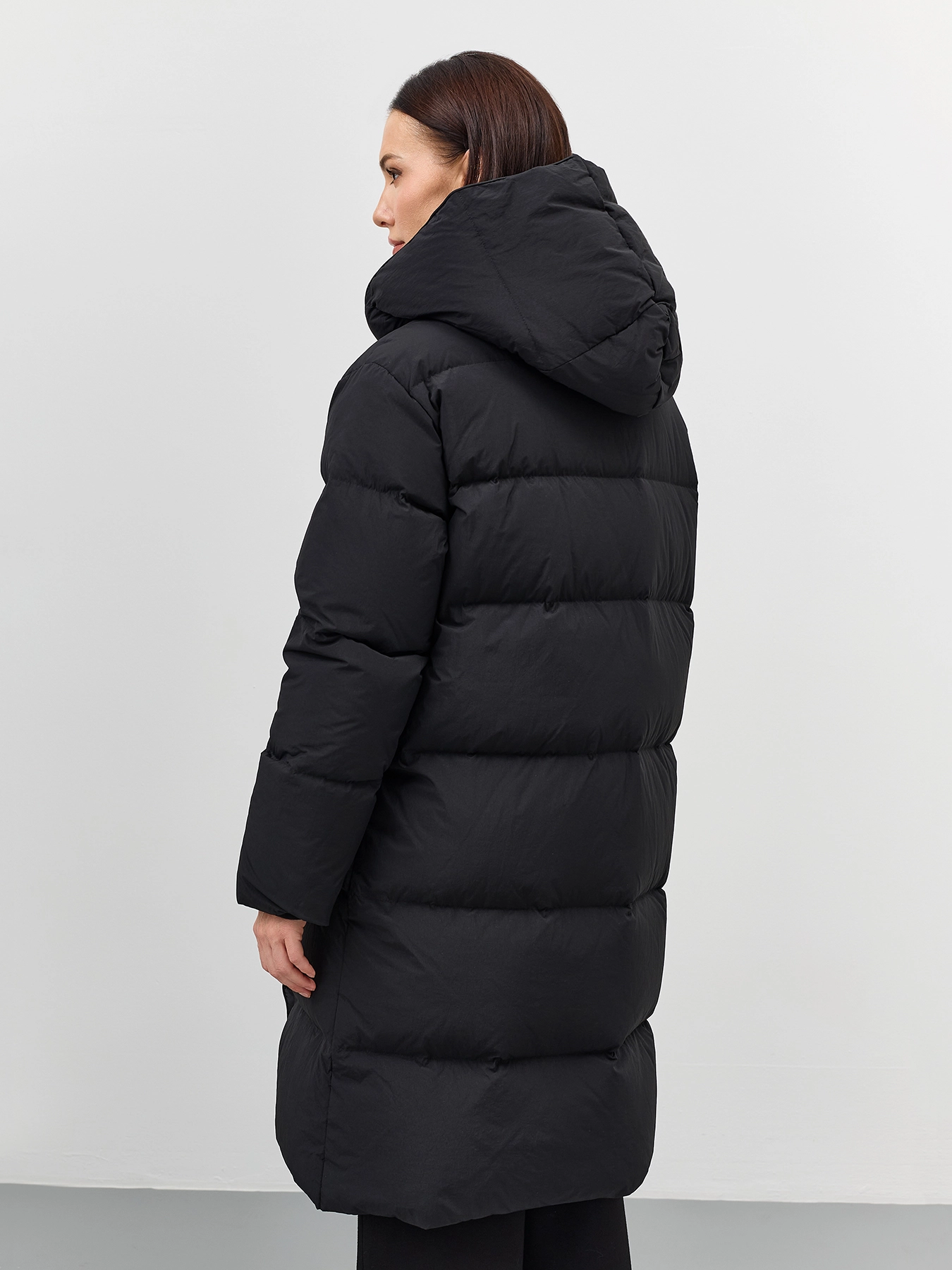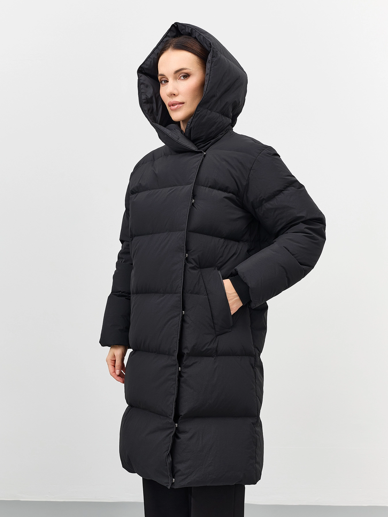 Пуховик на запах с несъёмным капюшоном с контрастной подкладкой. Прямой силуэт. Длина миди. Боковые карманы с листочками. Застежка на молнию и кнопки. Дополнен трикотажными манжетами по низу рукавов. Утеплитель- натуральный пух.