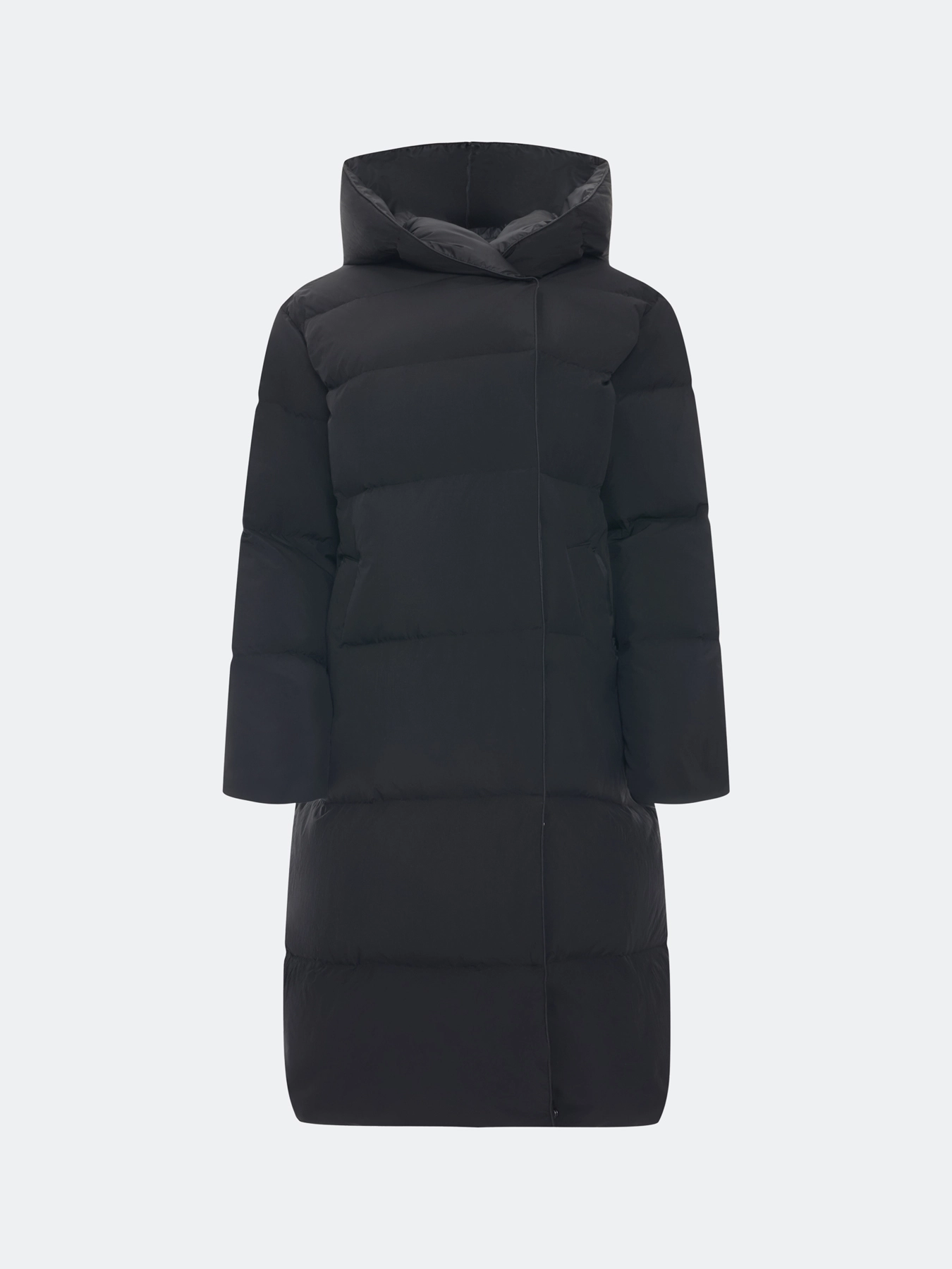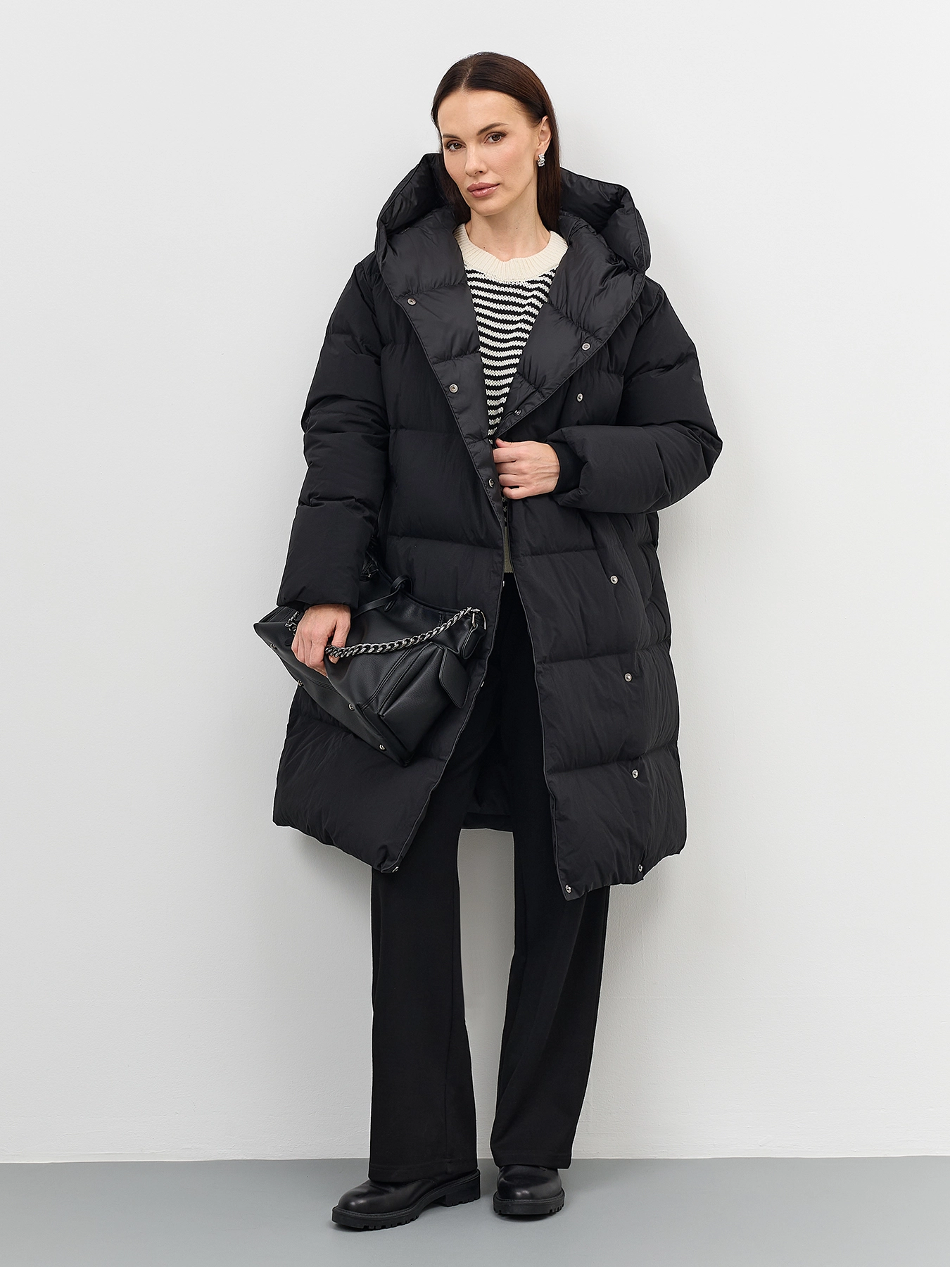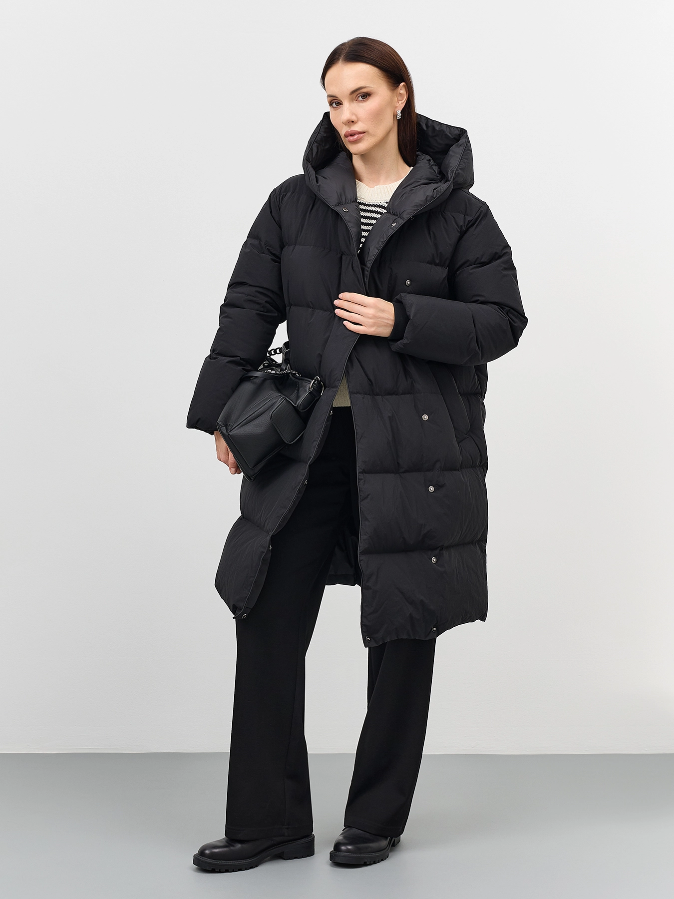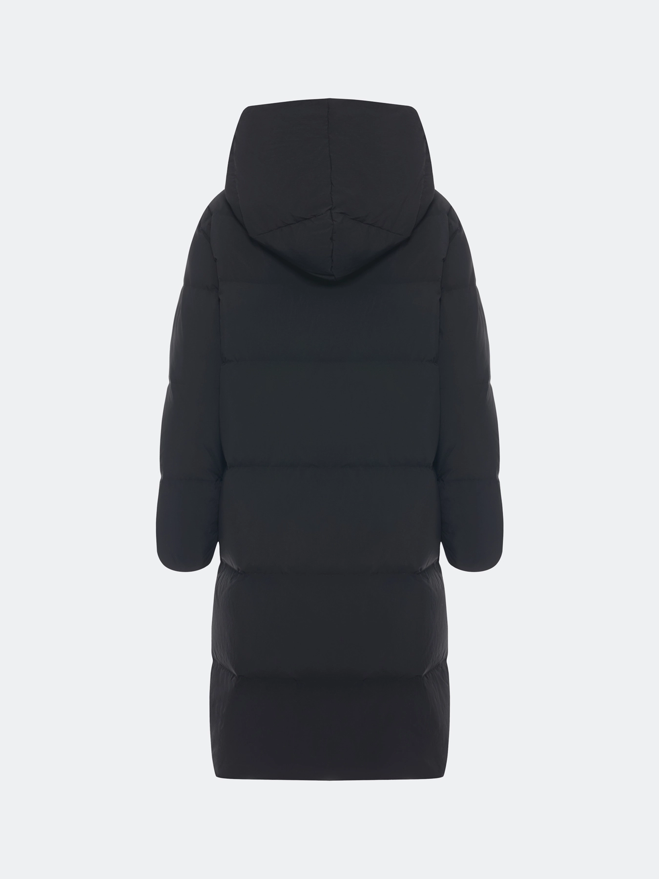 Пуховик на запах с несъёмным капюшоном с контрастной подкладкой. Прямой силуэт. Длина миди. Боковые карманы с листочками. Застежка на молнию и кнопки. Дополнен трикотажными манжетами по низу рукавов. Утеплитель- натуральный пух.