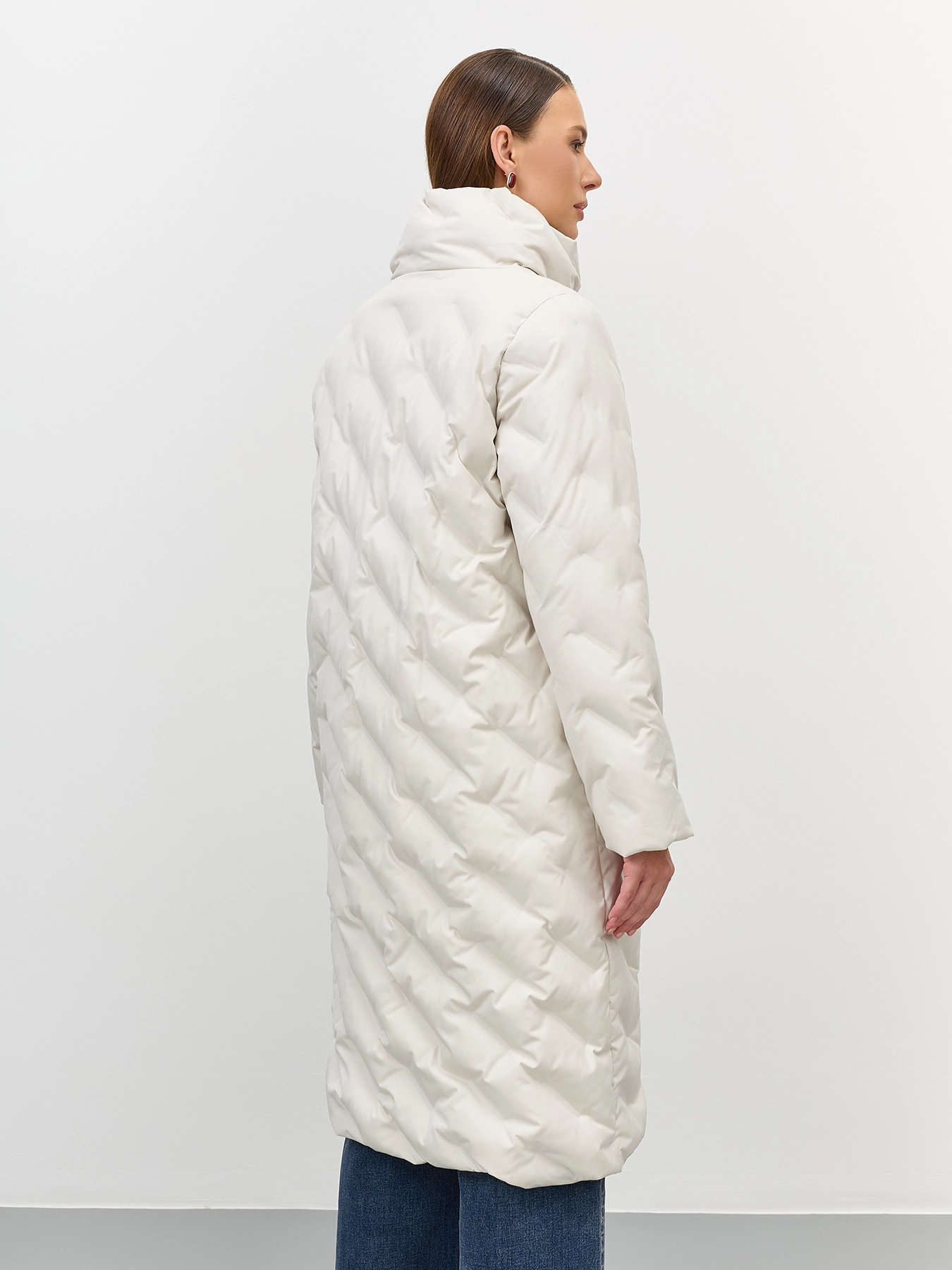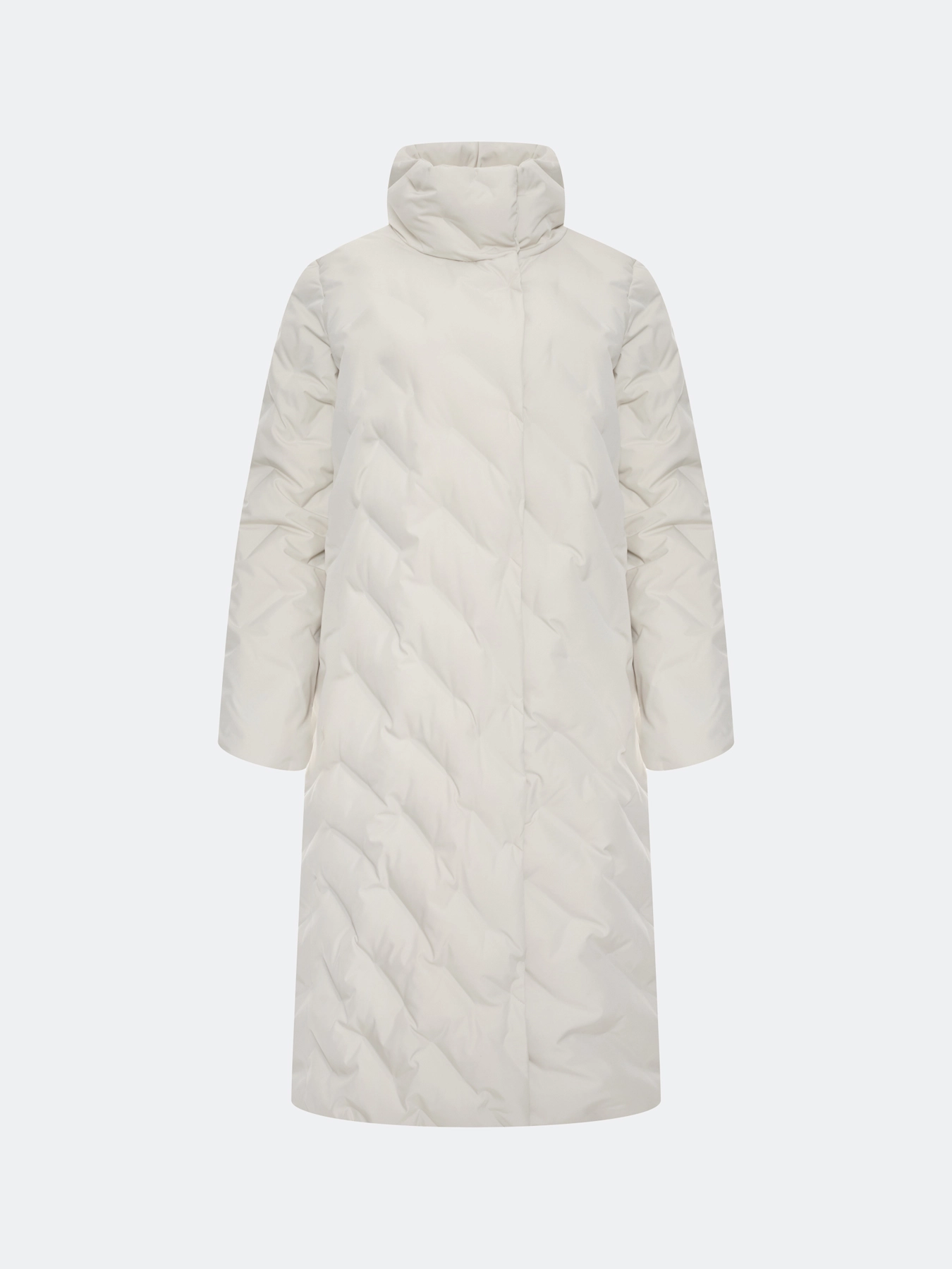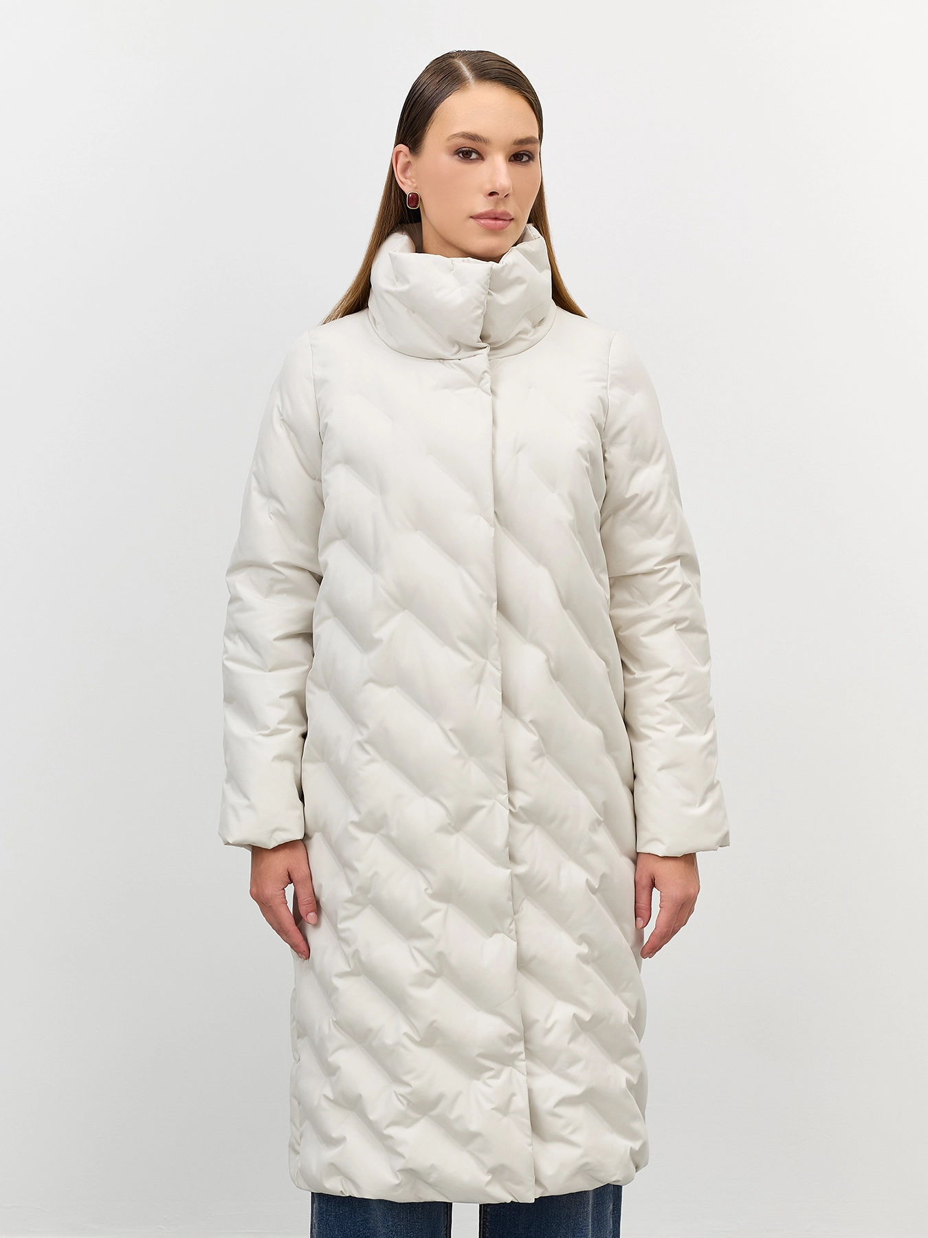 Удлиненное пальто с фантазийной горячей стежкой. Прямой силуэт. Длинные втачные рукава. Воротник высокая стойка. Застежка на скрытые кнопки. Боковые карманы в швах на потайных молниях.