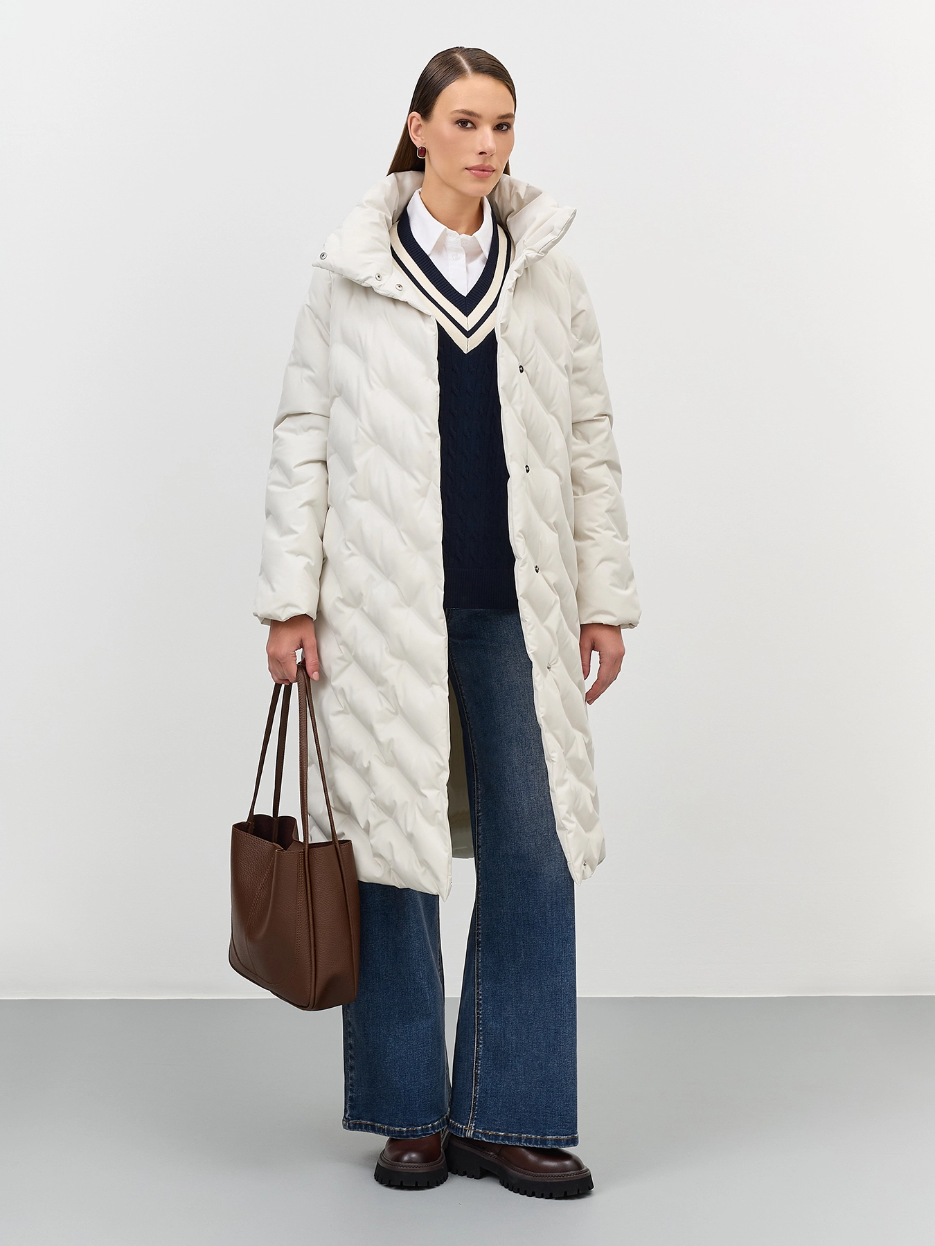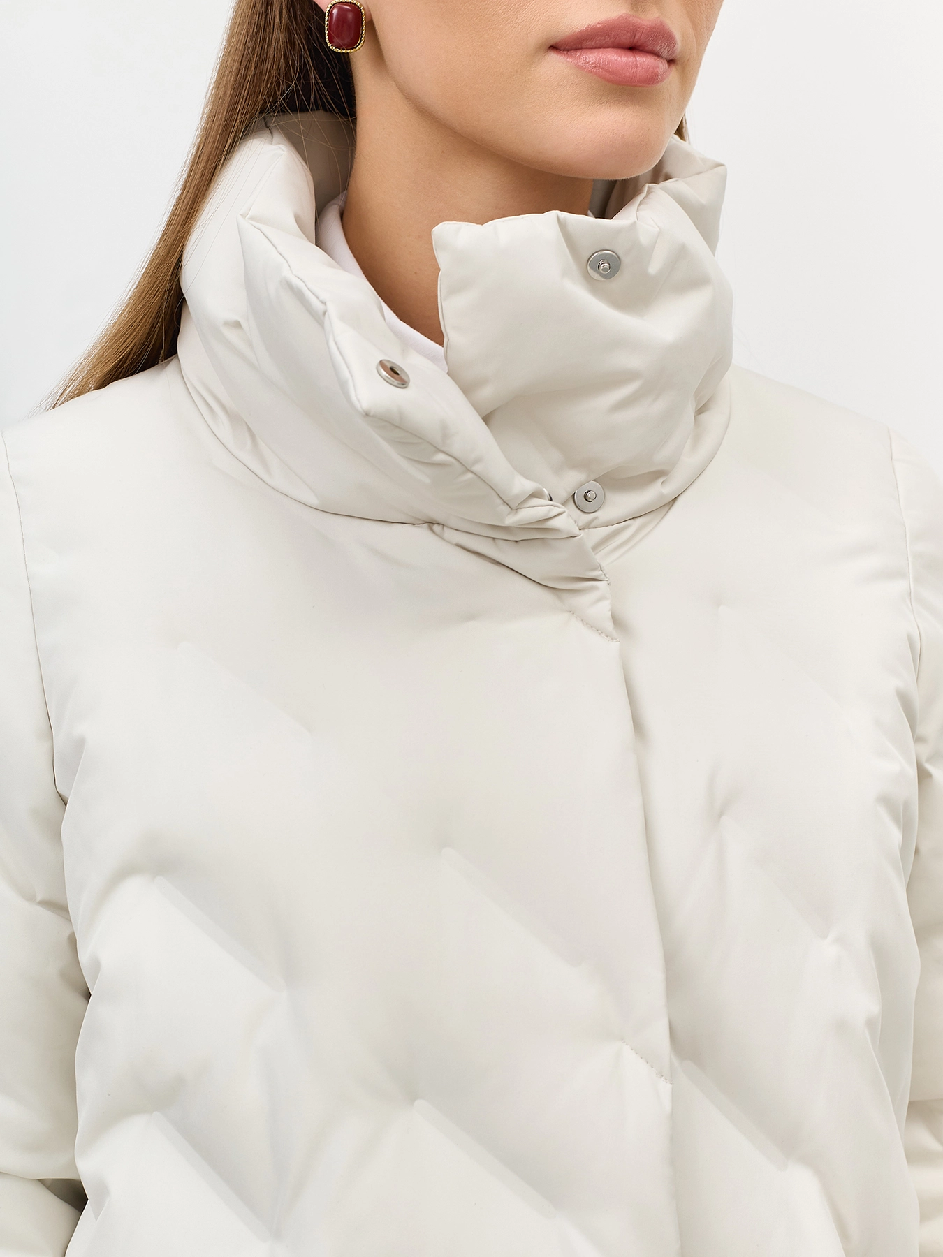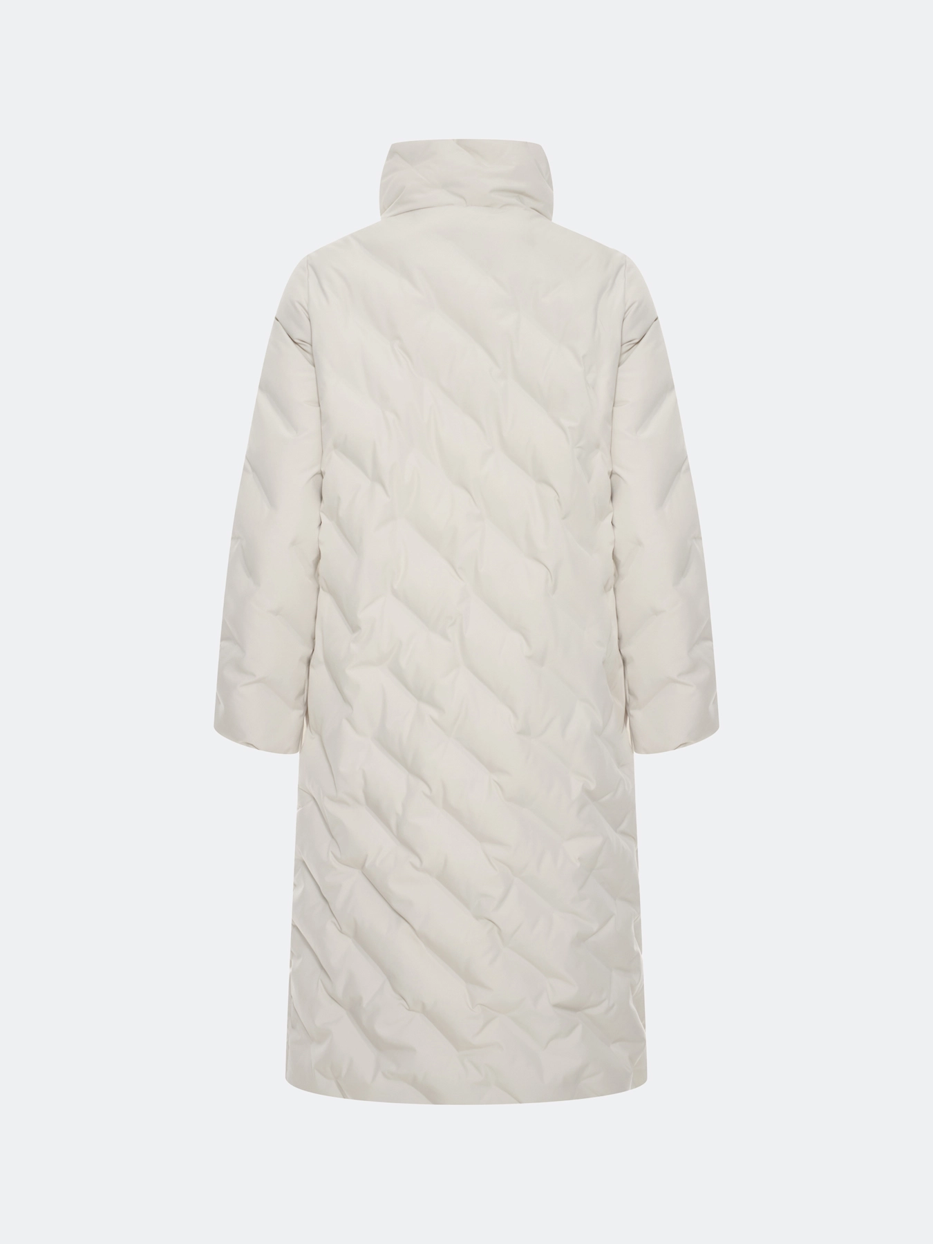 Удлиненное пальто с фантазийной горячей стежкой. Прямой силуэт. Длинные втачные рукава. Воротник высокая стойка. Застежка на скрытые кнопки. Боковые карманы в швах на потайных молниях.