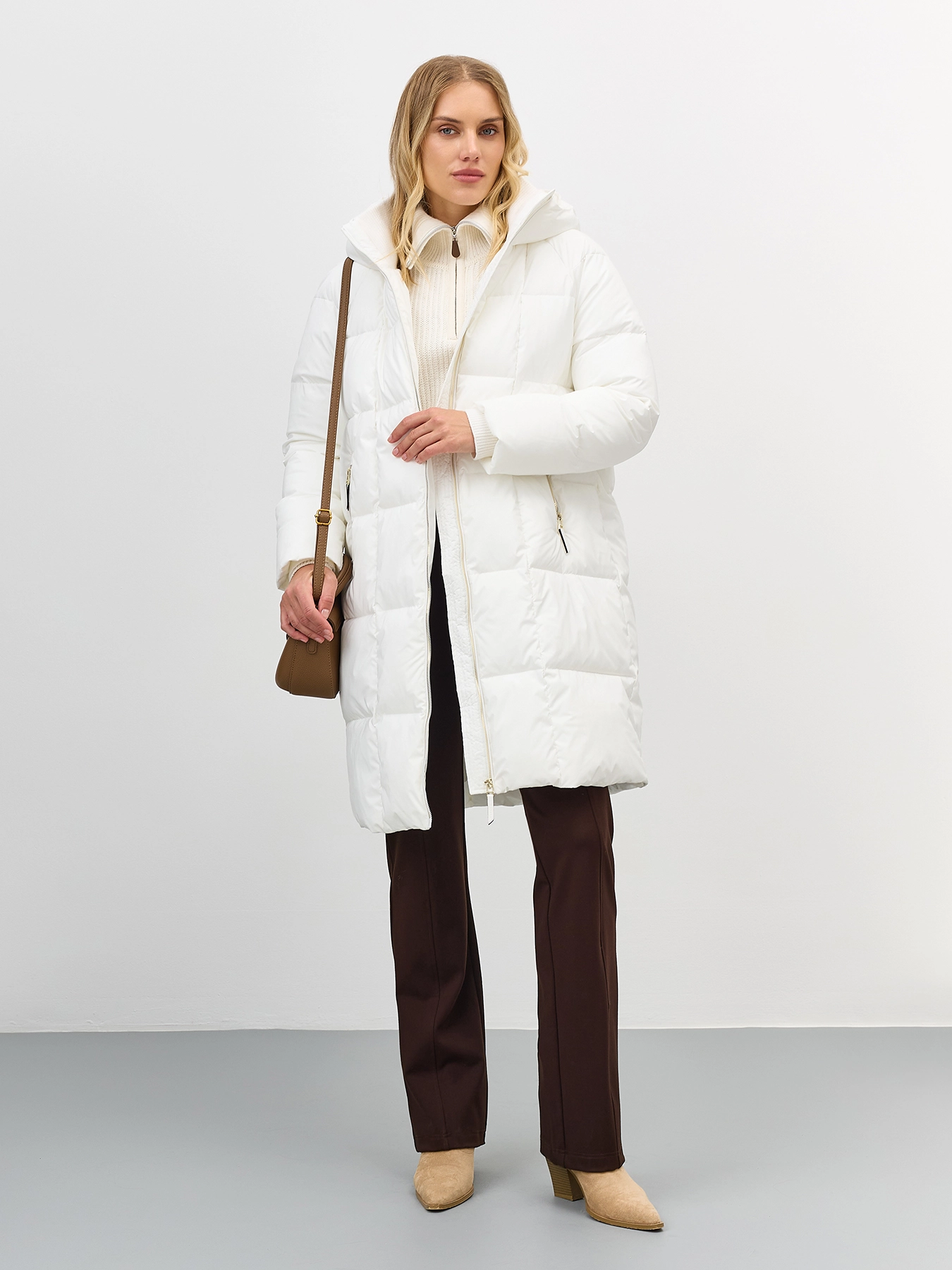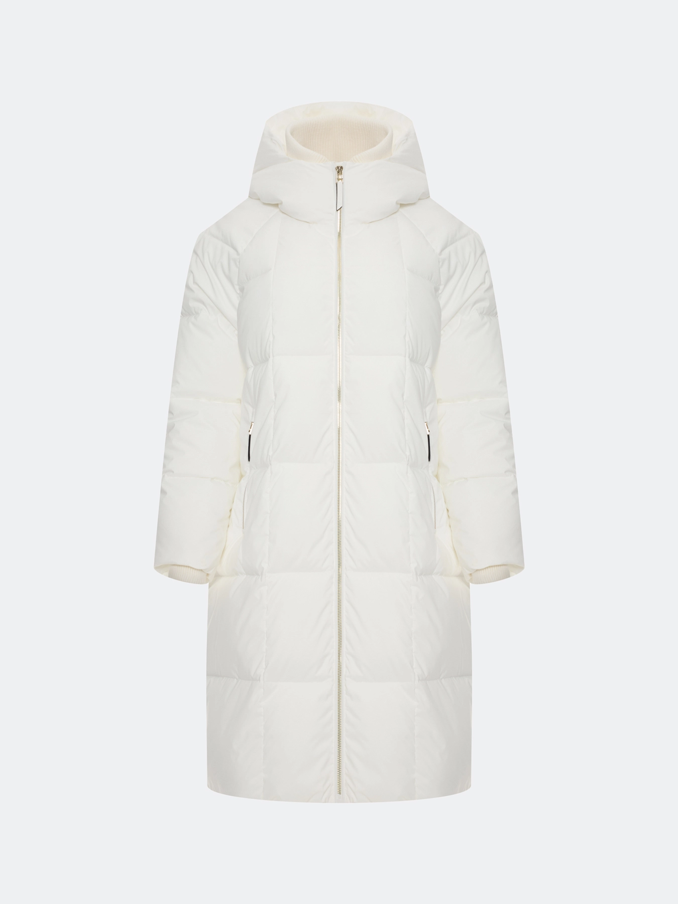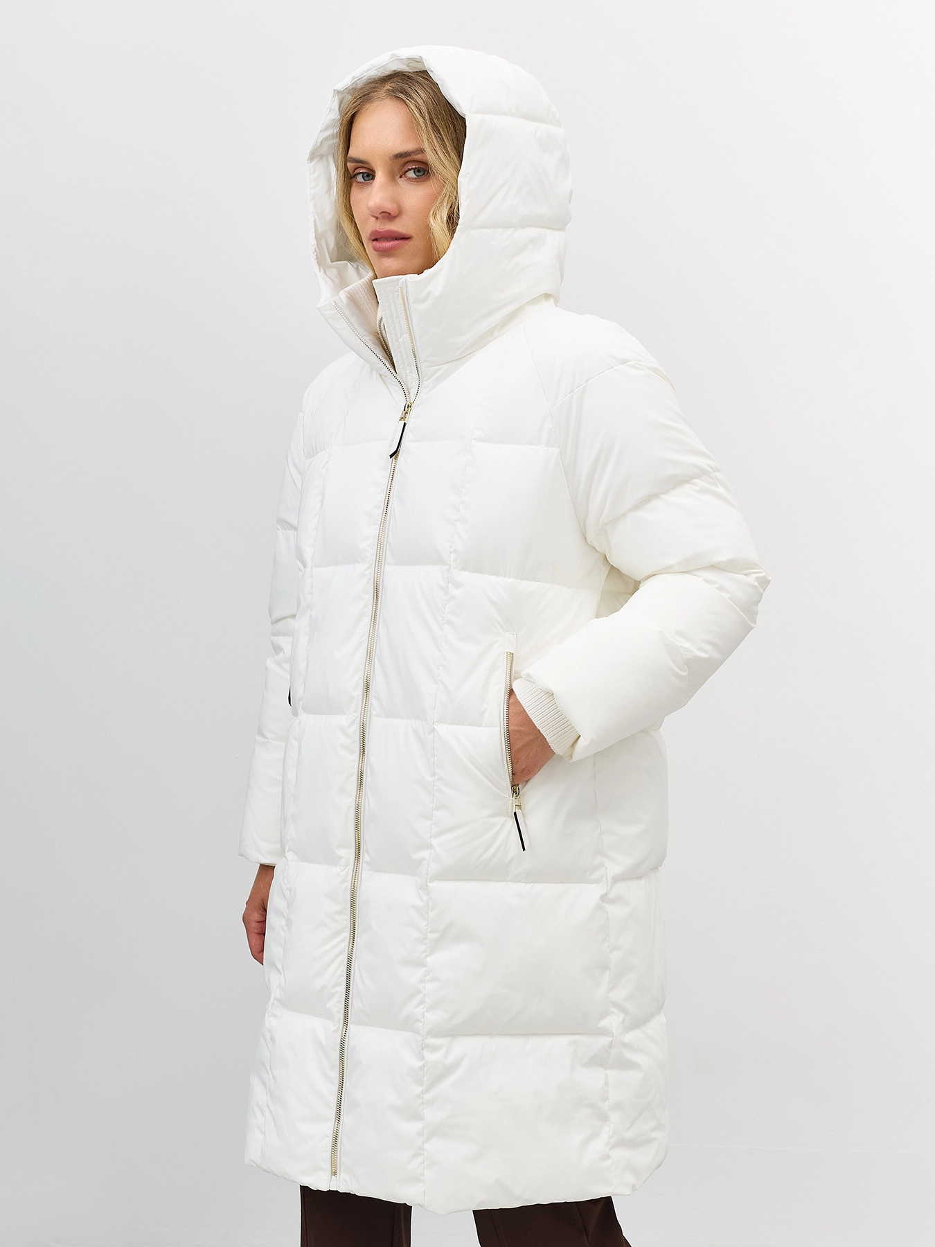 Свободное пальто с квадратной стежкой на искусственном утеплителе. Длина до середины колен. Свободный силуэт. Застежка на золотистую молнию. Боковые карманы на молнии. Трикотажный воротник стойка. Несъёмный капюшон.