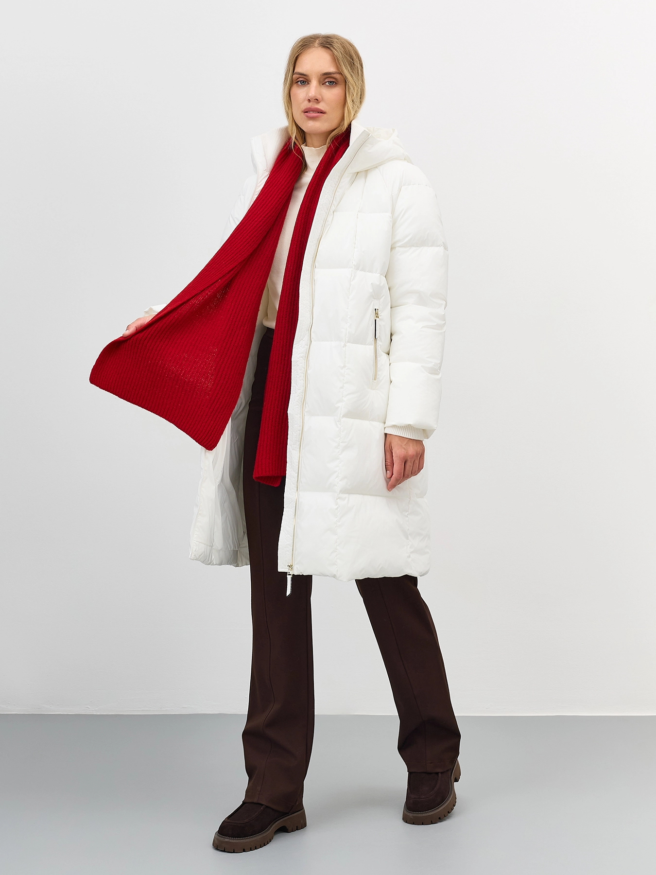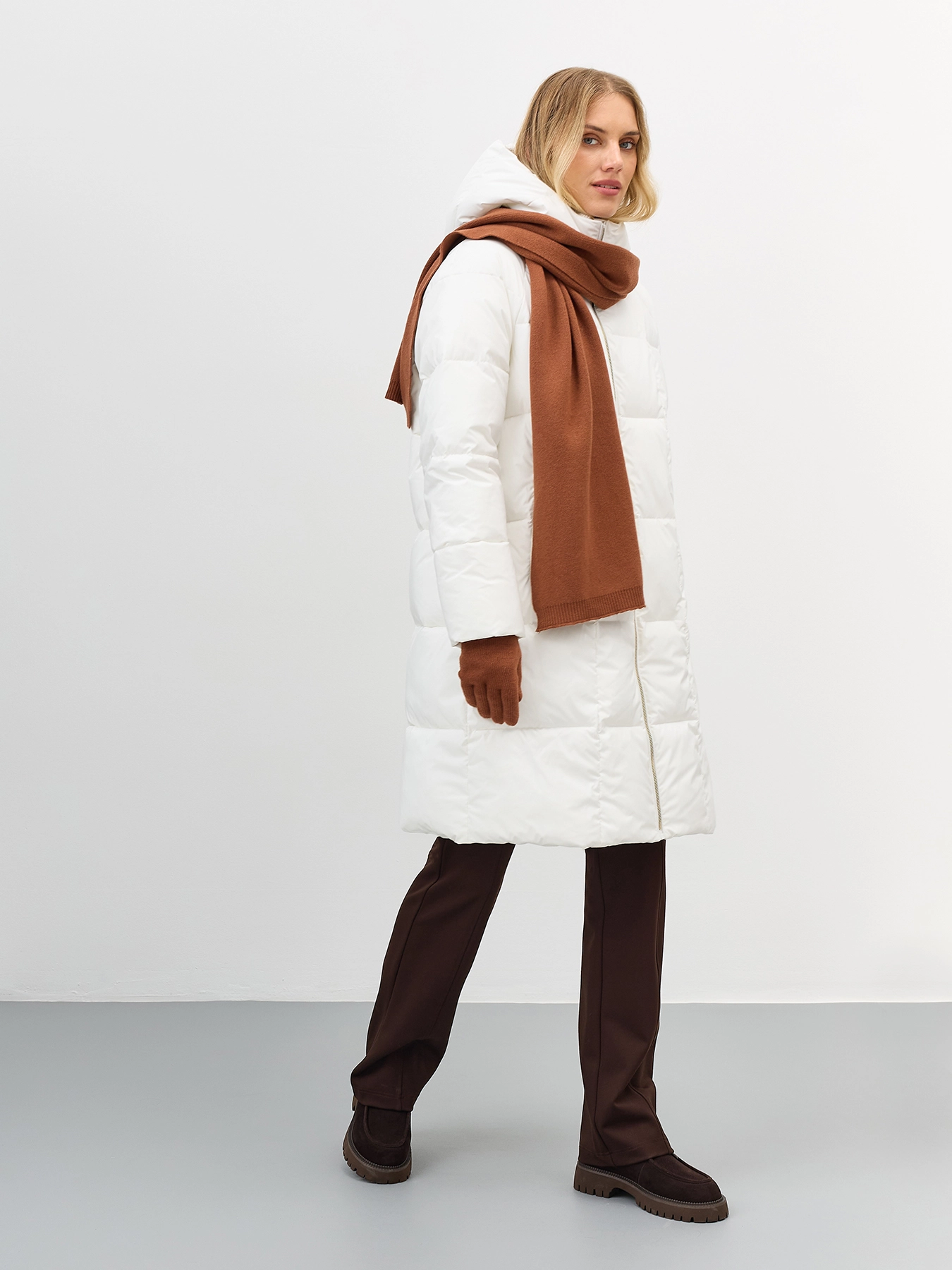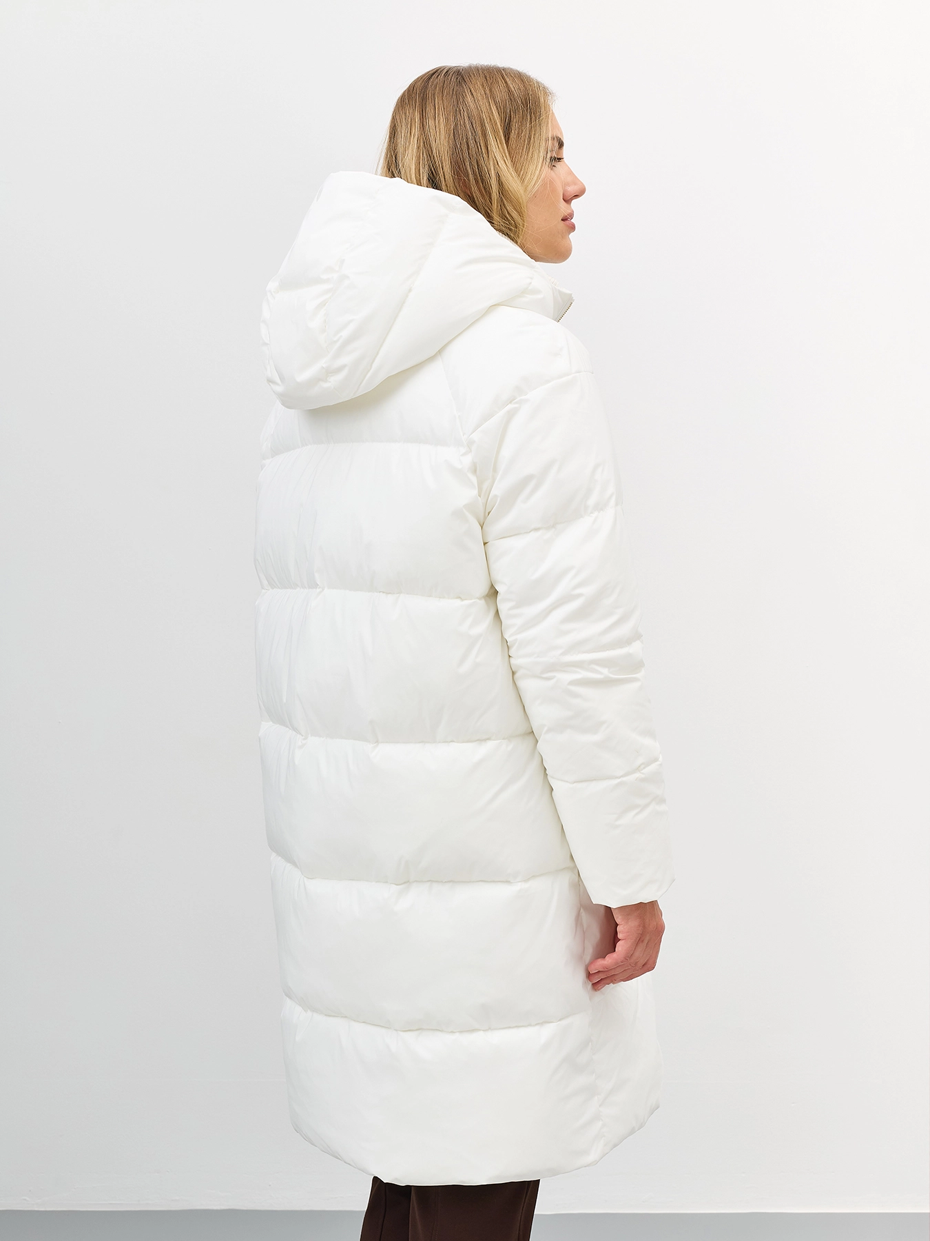 Свободное пальто с квадратной стежкой на искусственном утеплителе. Длина до середины колен. Свободный силуэт. Застежка на золотистую молнию. Боковые карманы на молнии. Трикотажный воротник стойка. Несъёмный капюшон.