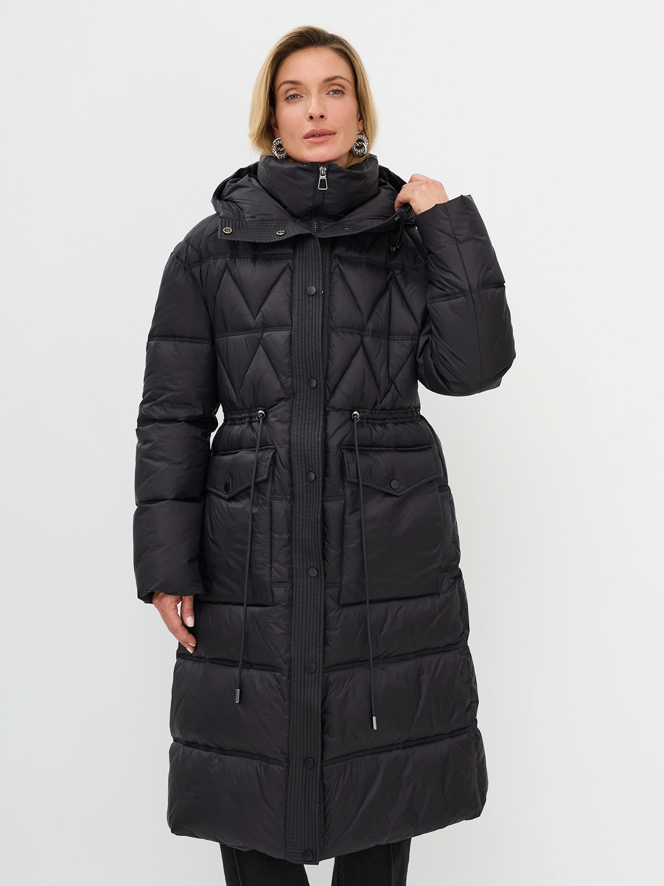 Удлиненная парка с фигурной фантазийной стежкой. Прямой силуэт можно приталить кулисой. Застежка молния и кнопки. Накладные карманы с клапанамина кнопках. Высокий теплый капюшон с кулисой и утяжниками.
