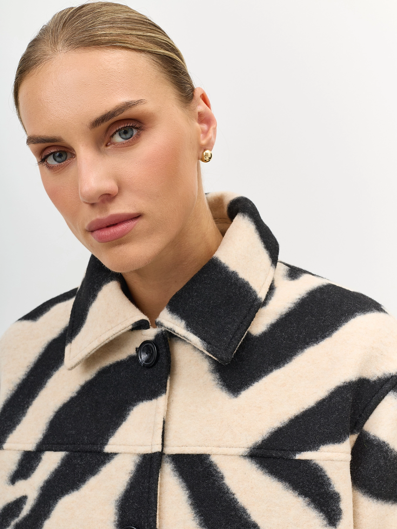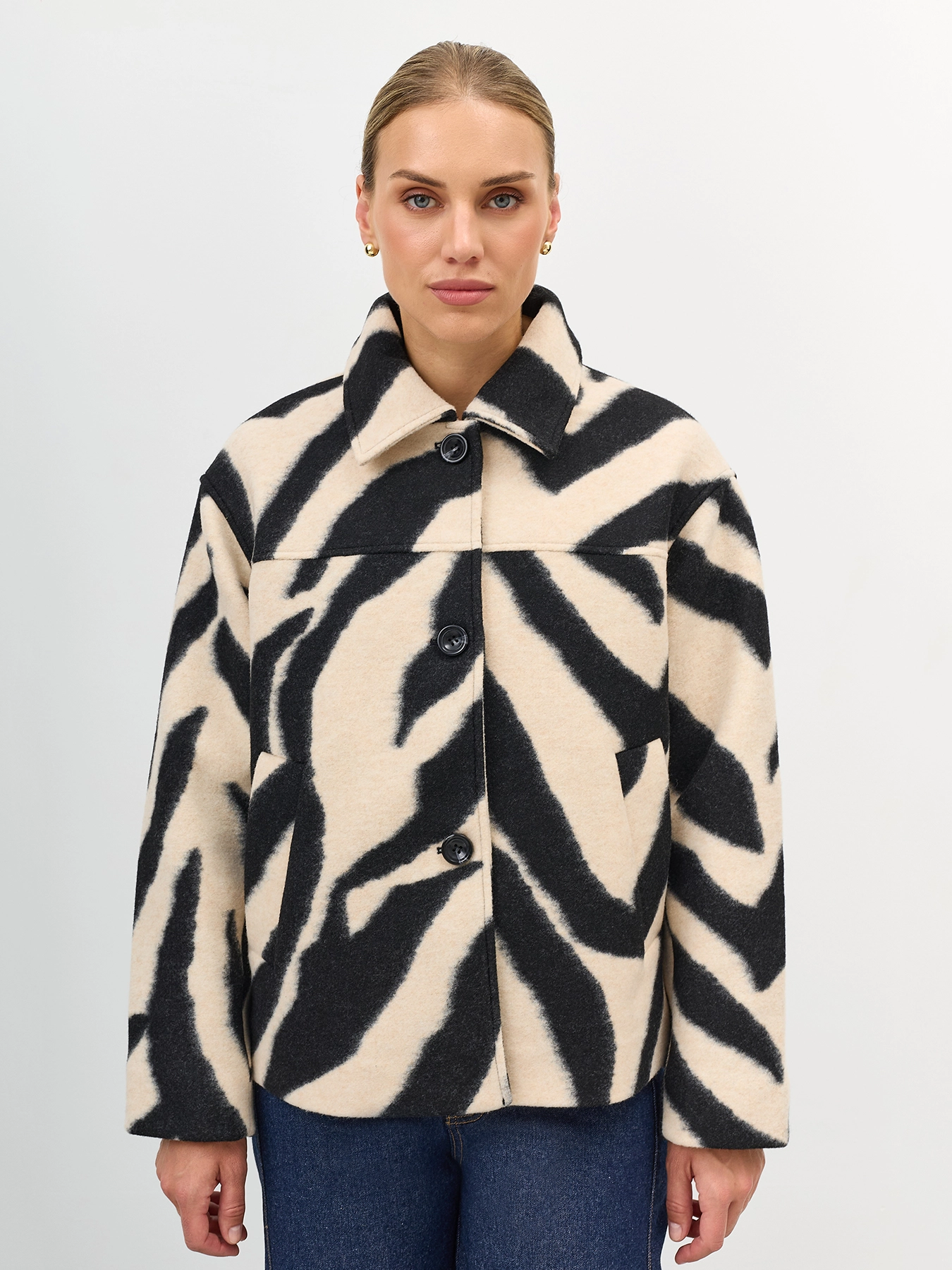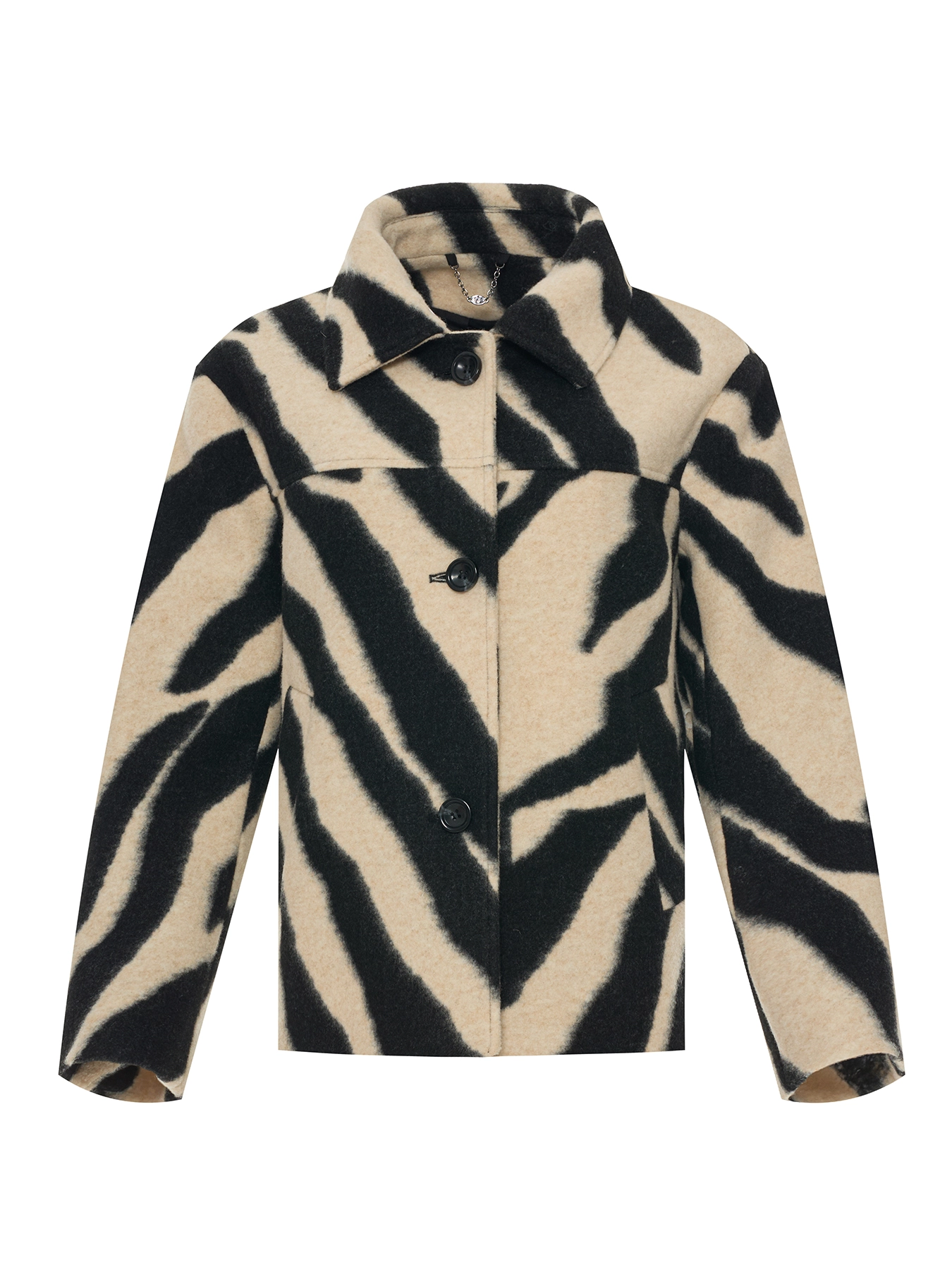 Пальто прямого силуэта с анималистичным принтом. Отложной воротник. Боковые прорезные карманы. Застежка на пуговицы.